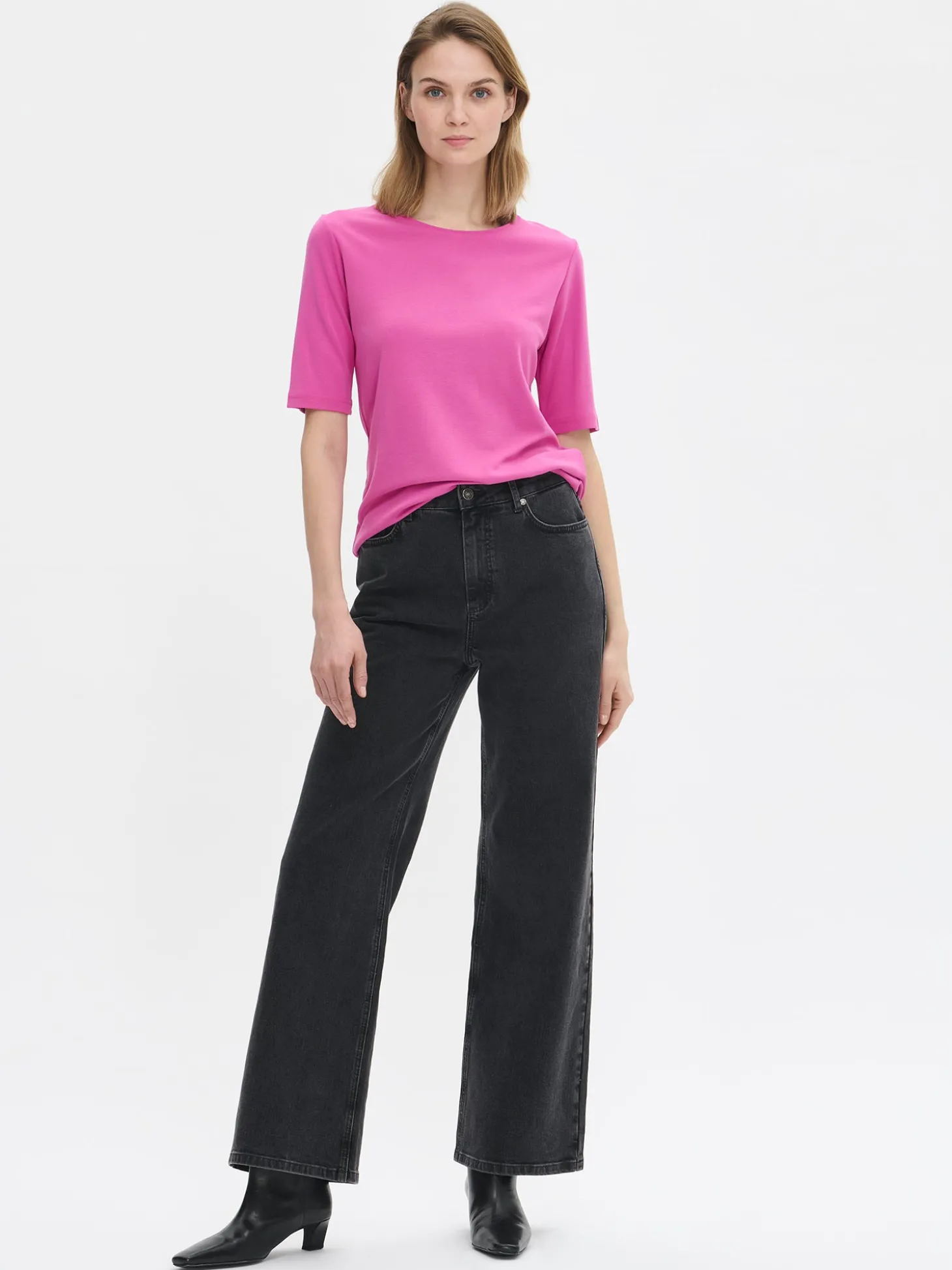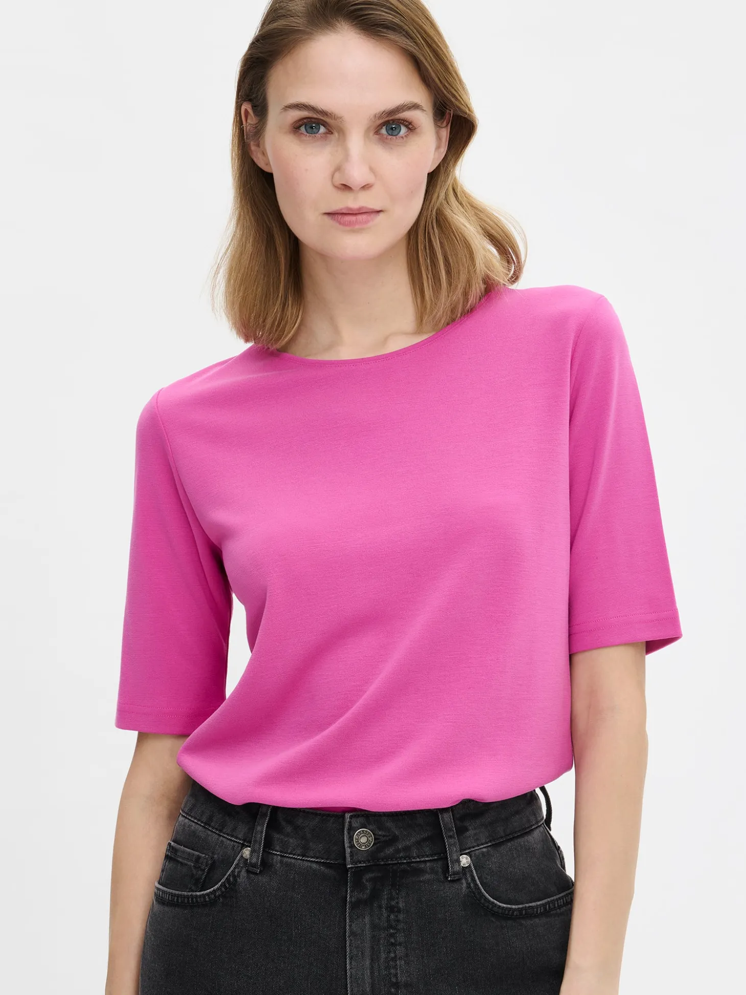 Naisten tyylikäs pinkki Aina T-paita. Klassinen t-paita on arjen monipuolinen luottovaate, johon on aina helppo pukeutua. Istuvassa T-paidassa on tereellä viimeistelty pyöreä pääntie. Hihat ovat 2/4 -mittaiset. T-paidan pituus koossa M on noin 62 cm. Materiaali on miellyttävän tuntuista, paksumpaa interlock-neulosta.