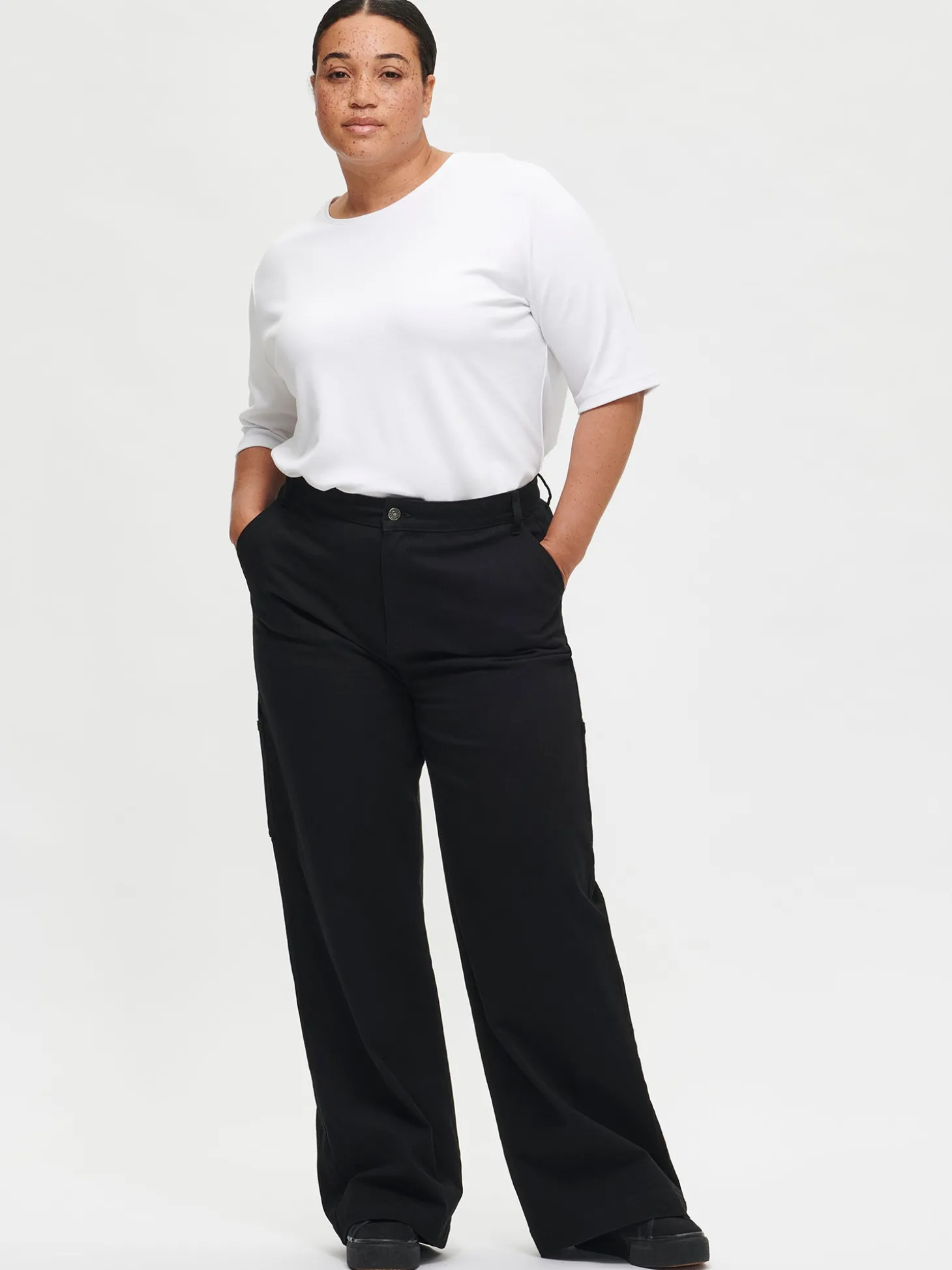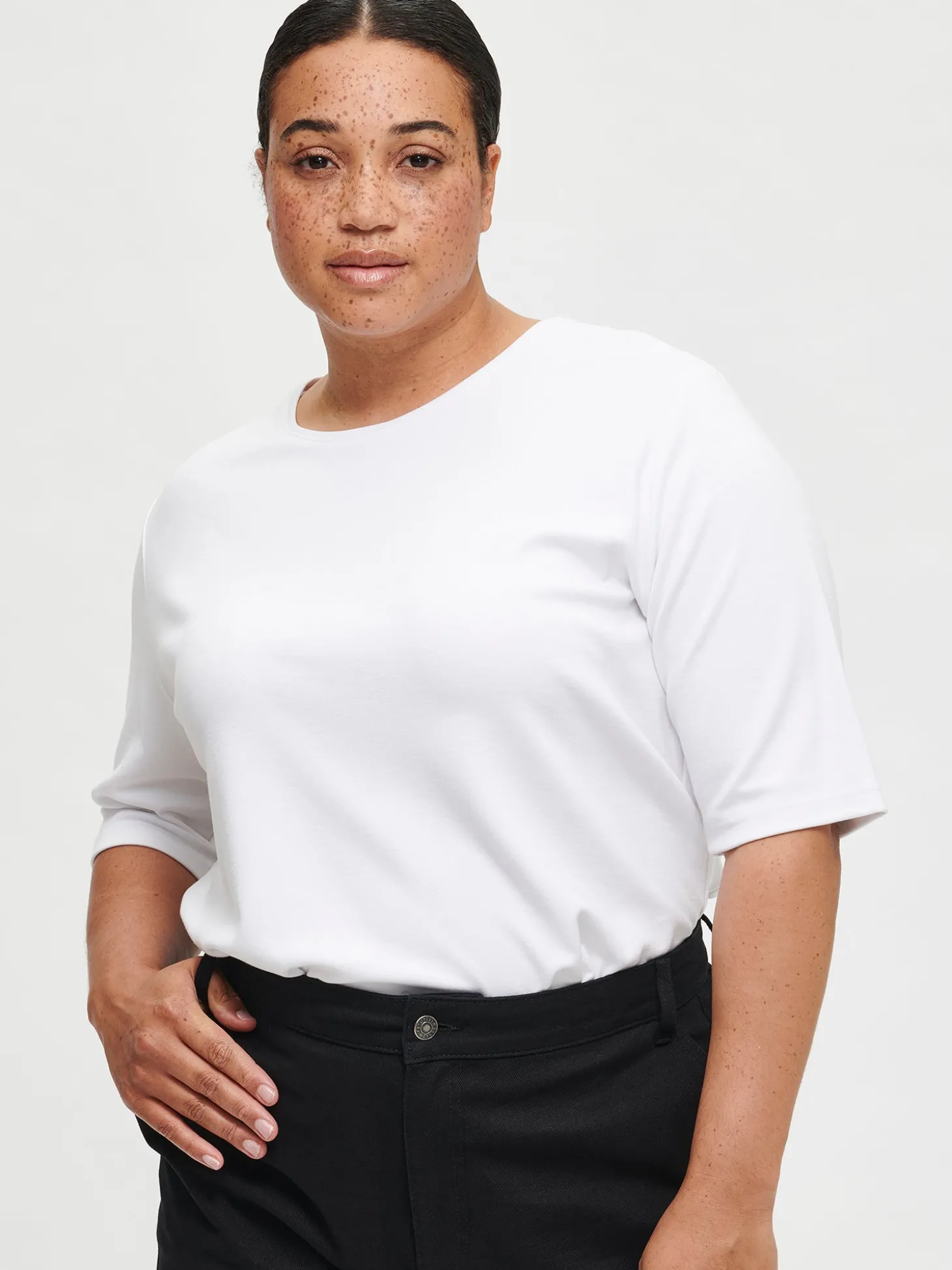 Naisten tyylikäs valkoinen Aina T-paita. Klassinen t-paita on arjen monipuolinen luottovaate, johon on aina helppo pukeutua. Istuvassa T-paidassa on tereellä viimeistelty pyöreä pääntie. Hihat ovat 2/4 -mittaiset. T-paidan pituus koossa M on noin 62 cm. Materiaali on miellyttävän tuntuista, paksumpaa interlock-neulosta.