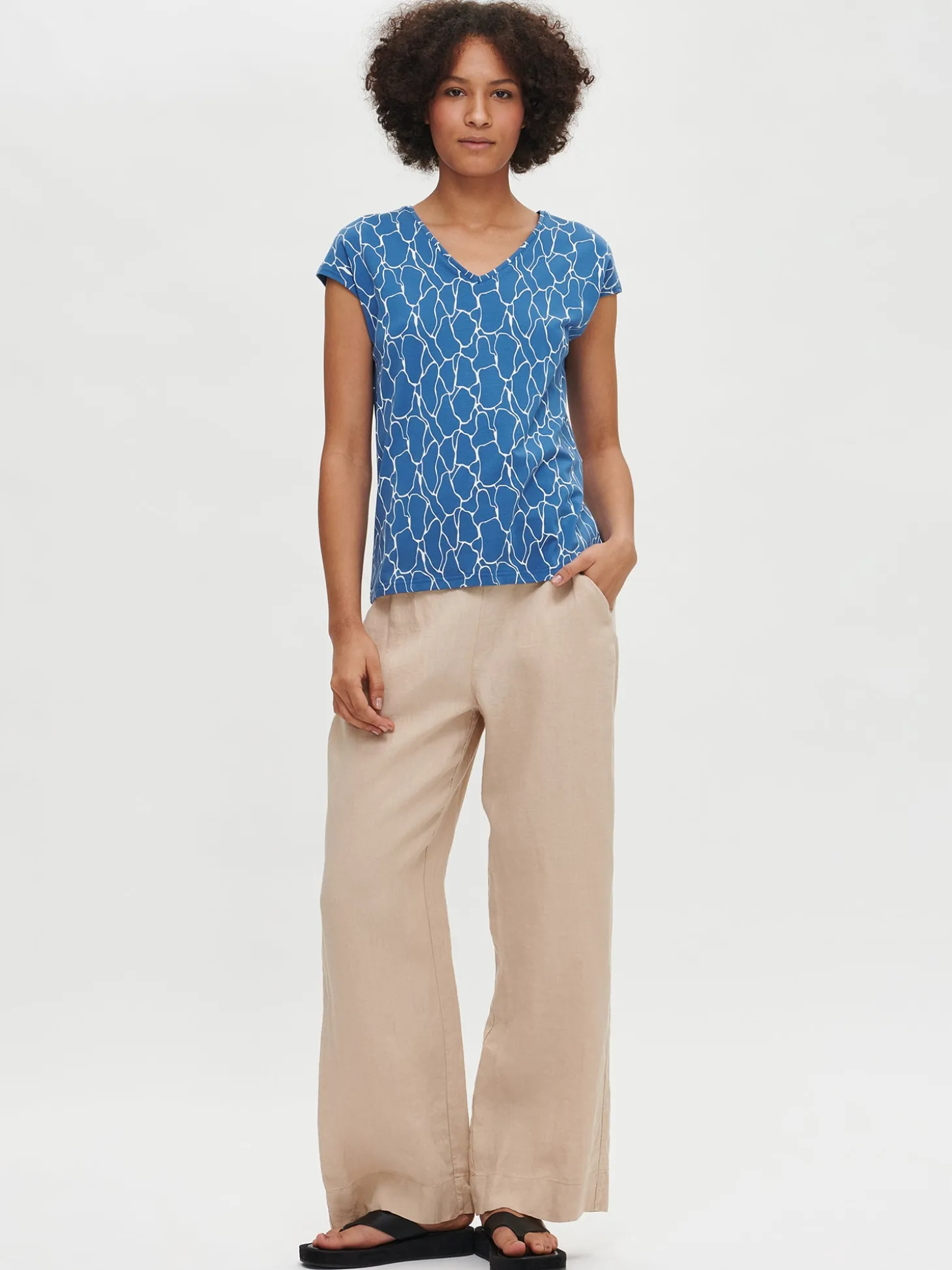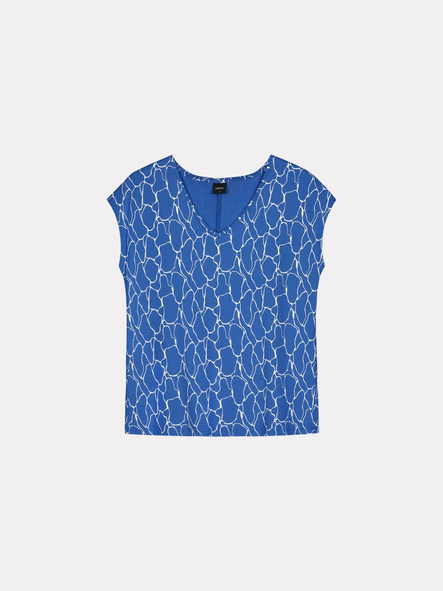 Naisten kuosillinen sininen Allas-pusero. Rento pusero sopii moniin eri asukokonaisuuksiin. Puserossa on tereellä viimeistelty v-pääntie ja holkkihihat. Puseron pituus koossa M on noin 65 cm. Materiaali on laadukasta ja helppohoitoista puuvilla-elastaani-neulosta, joka pysyy hyvänä pesusta toiseen.