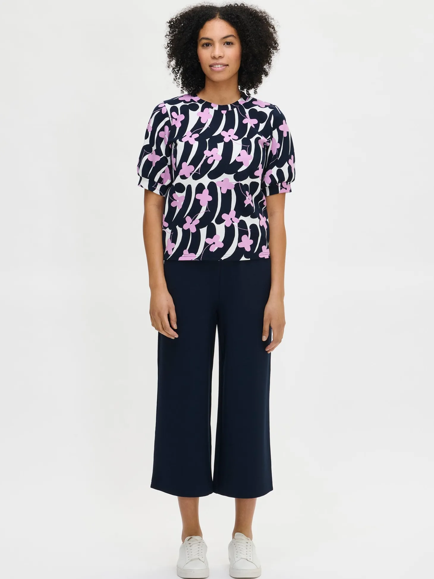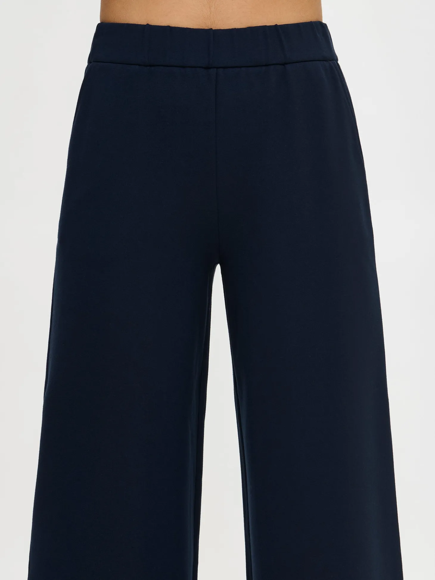 Naisten yksiväriset tummansiniset Alma-housut. Housuissa on sivuissa taskut ja joustava vyötärö. Housuissa on 7/8 pituiset leveät lahkeet ja lahkeen sisäpituus koossa M on noin 60 cm. Materiaali on laadukasta, mattapintaista, pehmeän tuntuista ja helppohoitoista viskoosi-polyamidi-elastaani-neulosta.