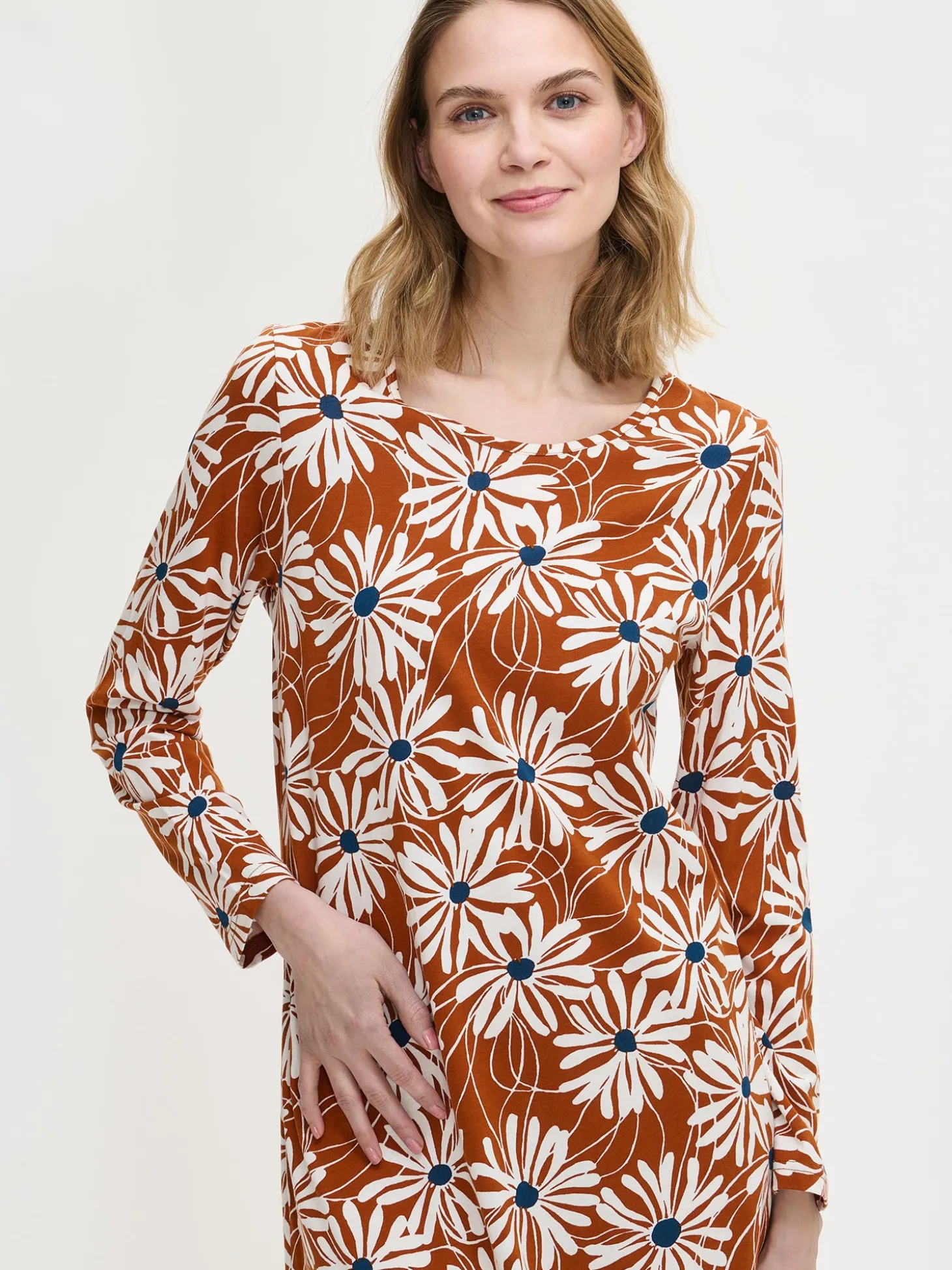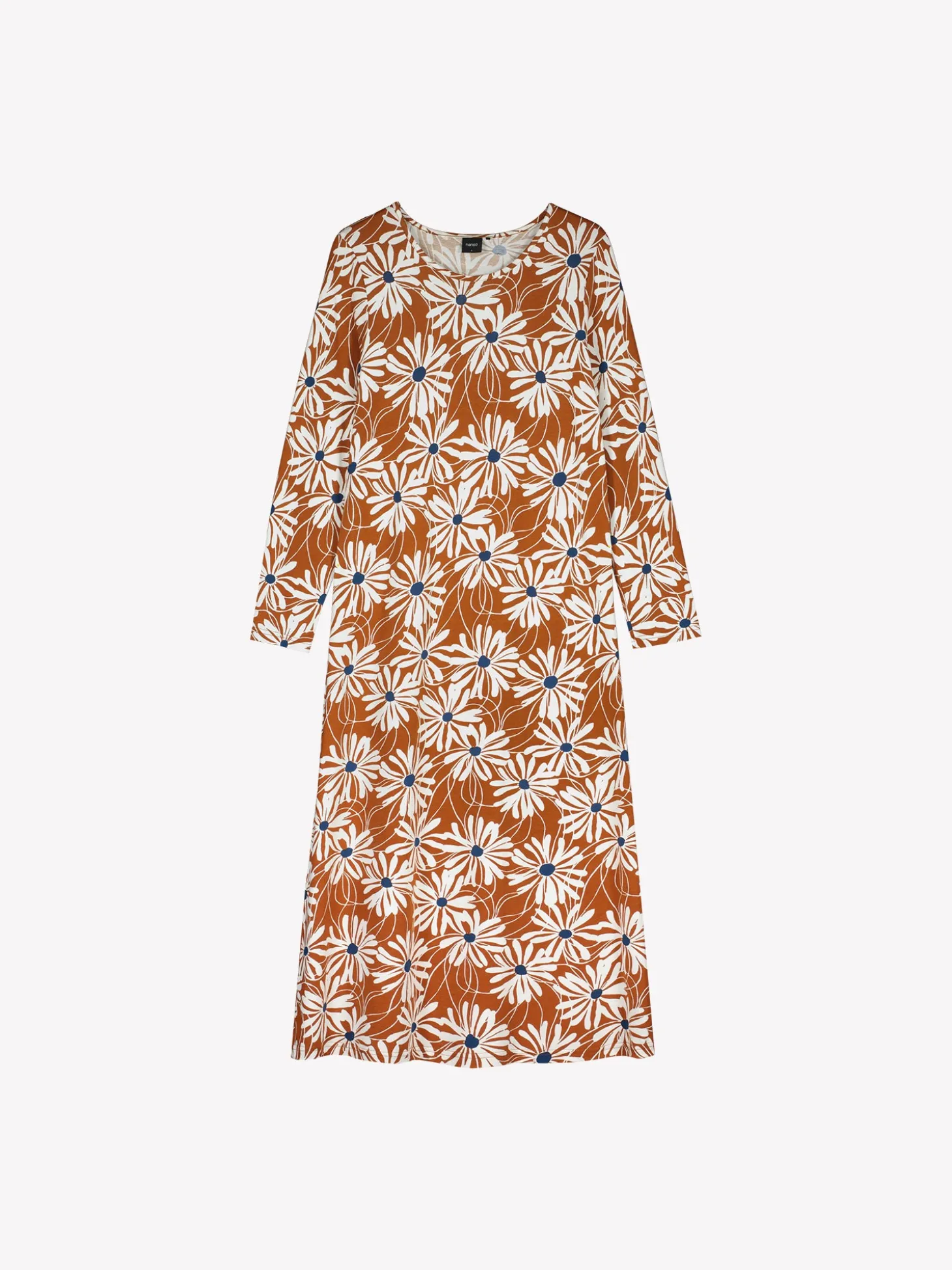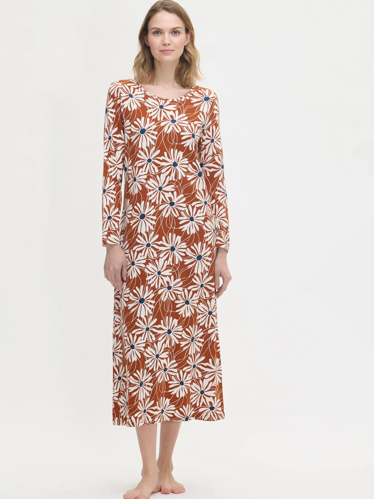 Naisten kukkakuosillinen Anette-yöpaita ruskeana pitkillä hihoilla ja pyöreällä pääntiellä. Yöpaidan pituus koossa M on noin 130 cm. Materiaali on laadukasta, iholla miellyttävän pehmeältä tuntuvaa ja helppohoitoista puuvilla-modaalia, joka pysyy hyvänä pesusta toiseen.