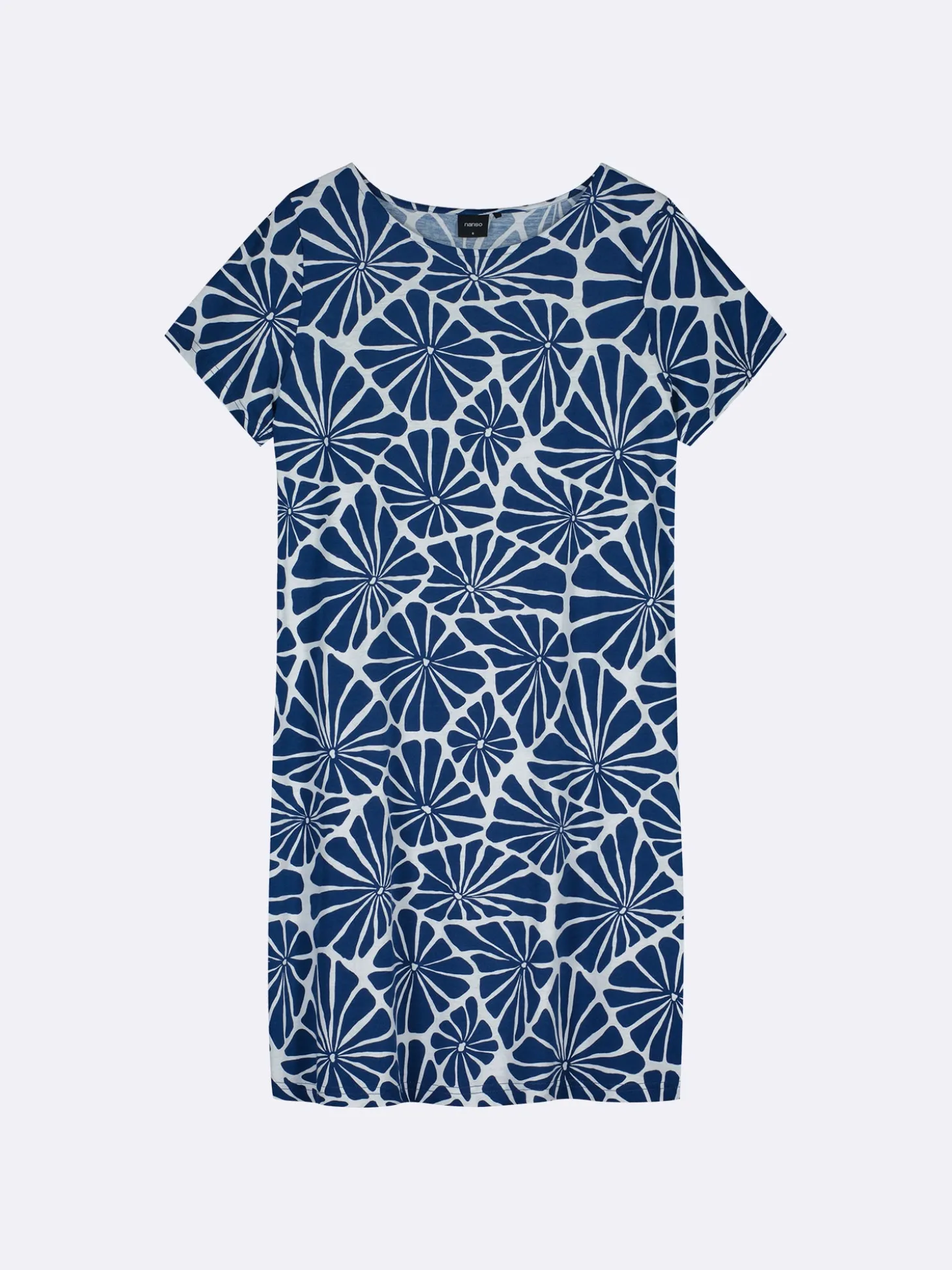 Naisten kuosillinen tummansininen Aralia-yöpaita lyhyillä hihoilla ja ovaalilla pääntiellä. Yöpaidan pituus koossa M on noin 95 cm. Materiaali on laadukasta, iholla miellyttävän pehmeältä tuntuvaa ja helppohoitoista puuvilla-modaalia, joka pysyy hyvänä pesusta toiseen.