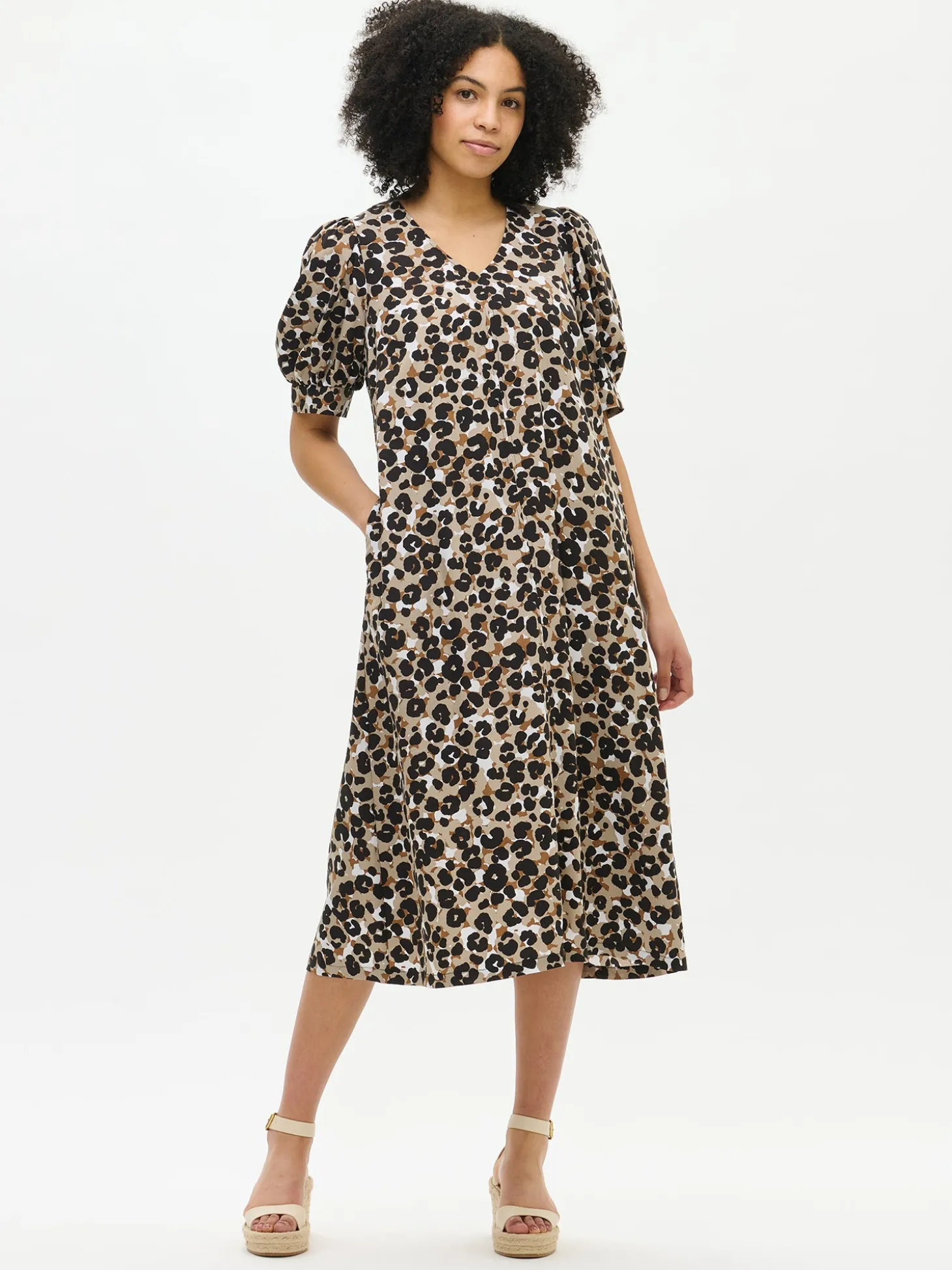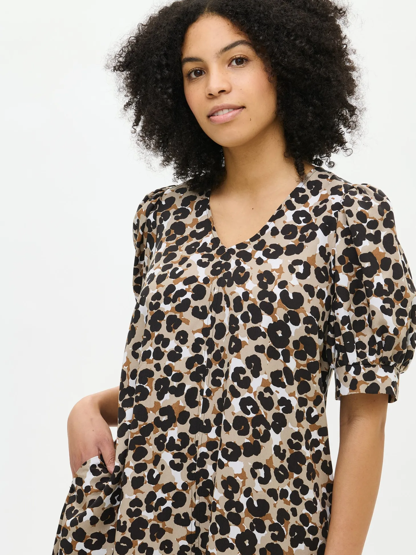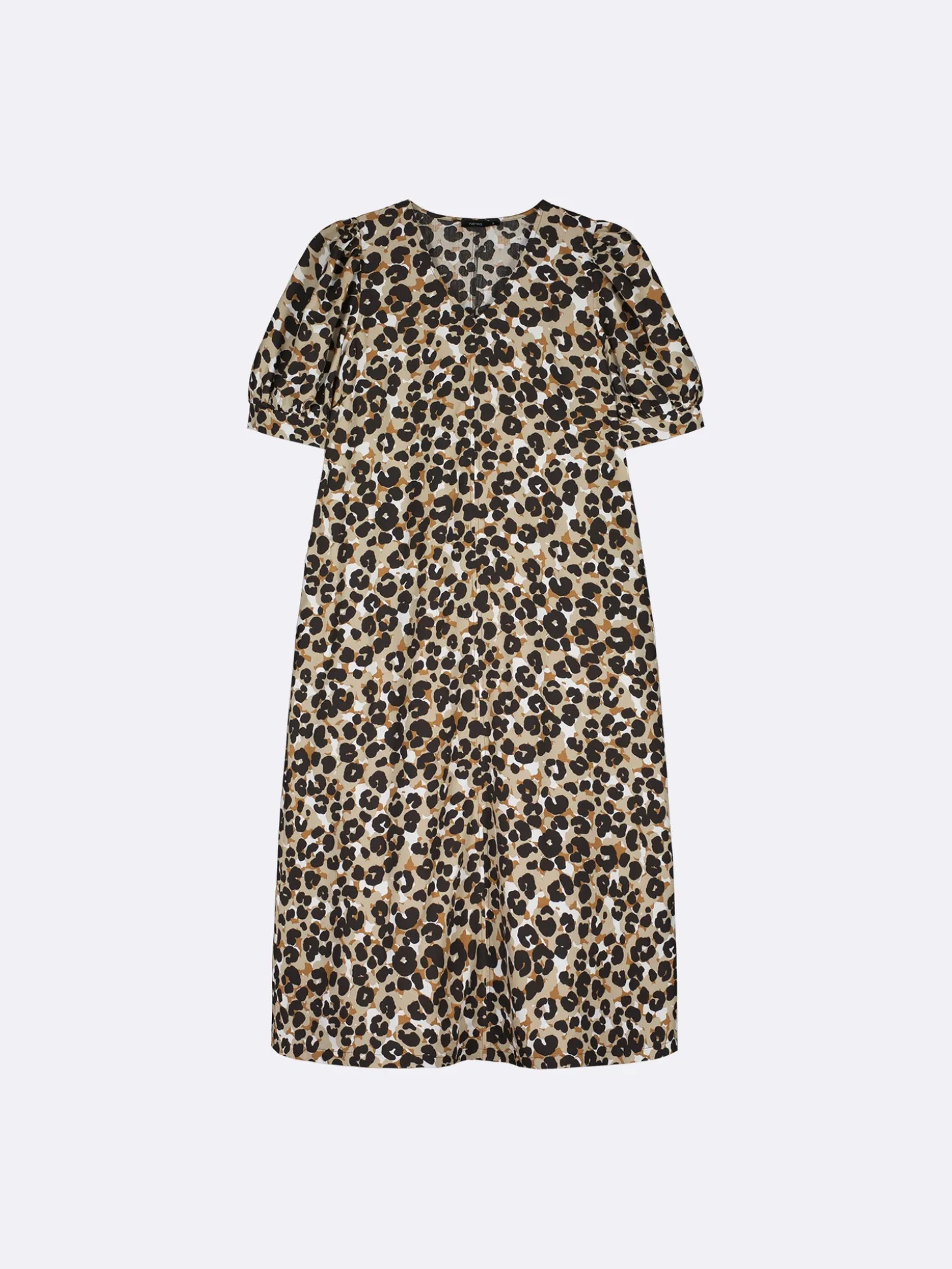 Naisten leopardikuvioinen ruskea Babette-mekko. Mekossa on kantilla viimeistelty v-pääntie ja rypytetyt 2/4 pituiset hihat. Suoralinjaisessa mekossa on taskut sivusaumoissa. Mekon pituus koossa M on noin 123 cm. Materiaali on ylellisen pehmeää, mutta ryhdikästä lyocell-popliinia. Materiaalille on ominaista 3-5 % kutistuminen ensimmäisessä pesussa.