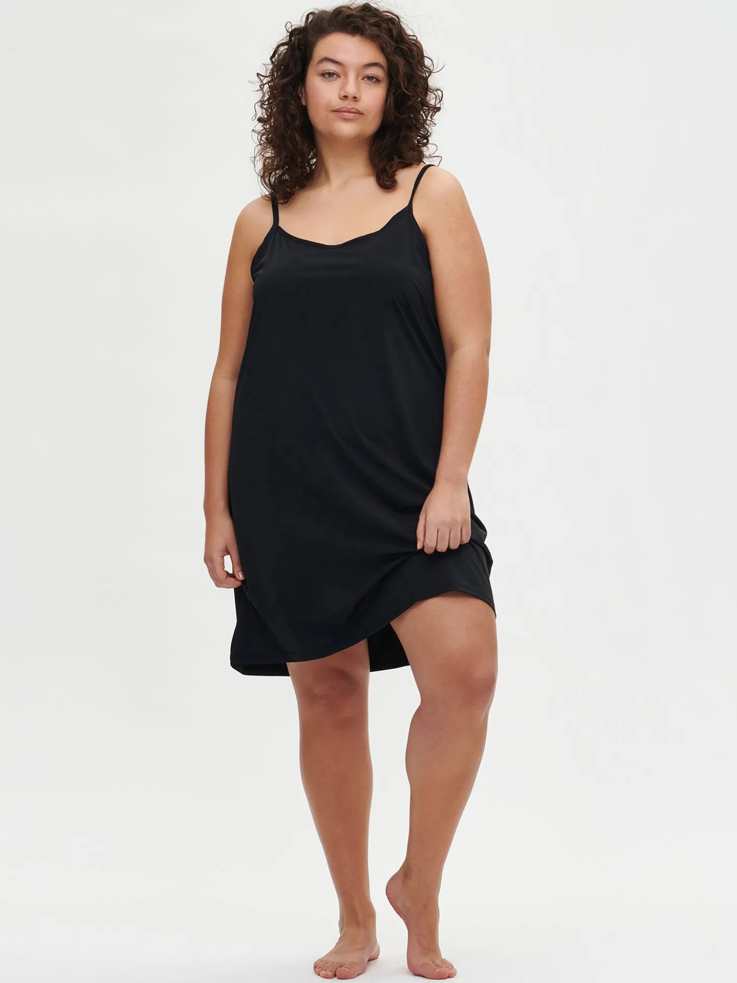 Naisten musta Basic-alusmekko ohuilla spagettiolkaimilla. Kevyt ja huomaamaton alusmekko silottaa ja viimeistelee asukokonaisuuden kauniisti. Alusmekon pituus koossa M on noin 87 cm. Materiaali on laadukasta polyamidi-elastaanineulosta, joka tuntuu miellyttävältä iholla. Neuloksen sileä pinta tekee mekosta helppohoitoisen ja mukavan käyttää.