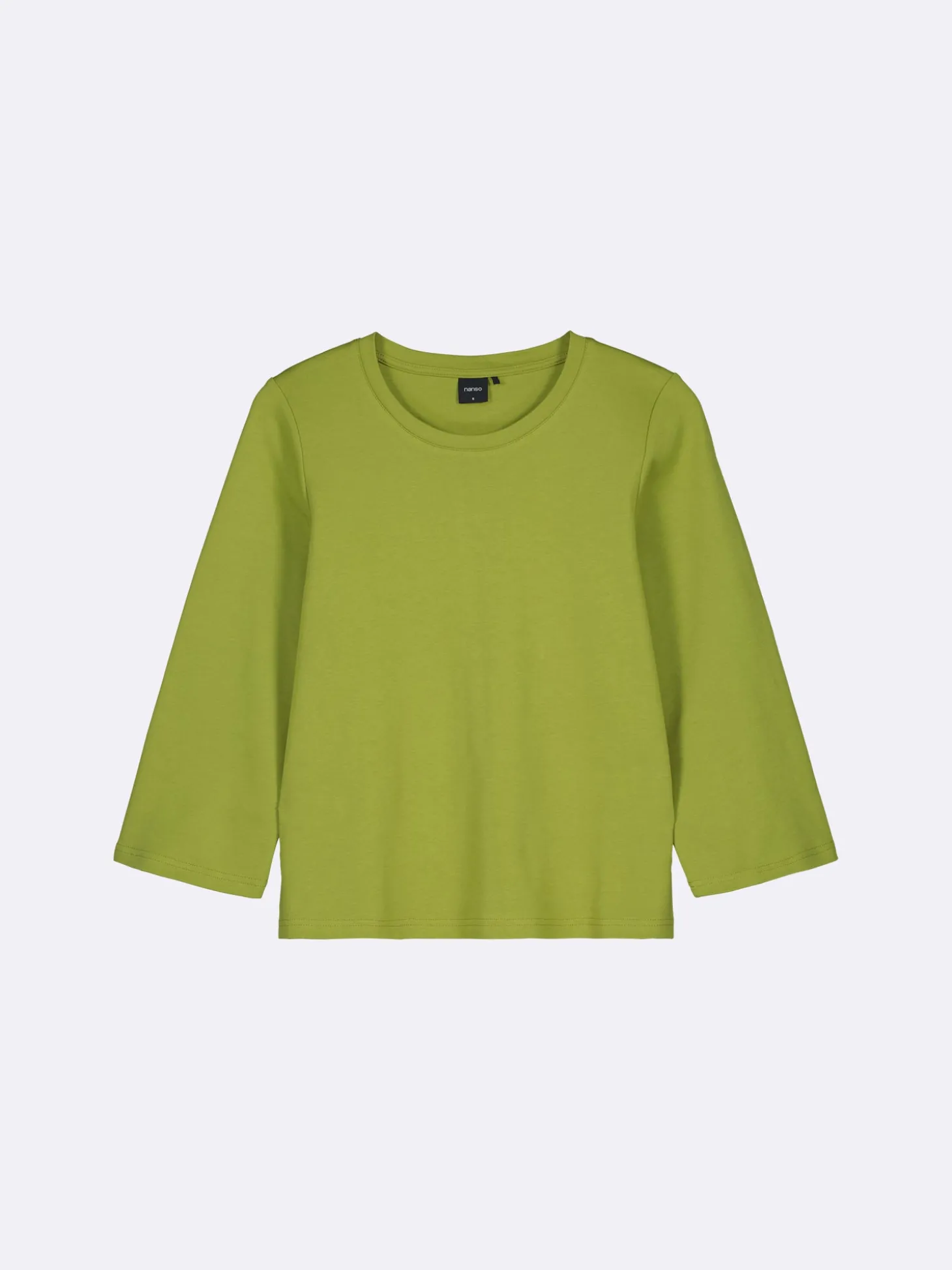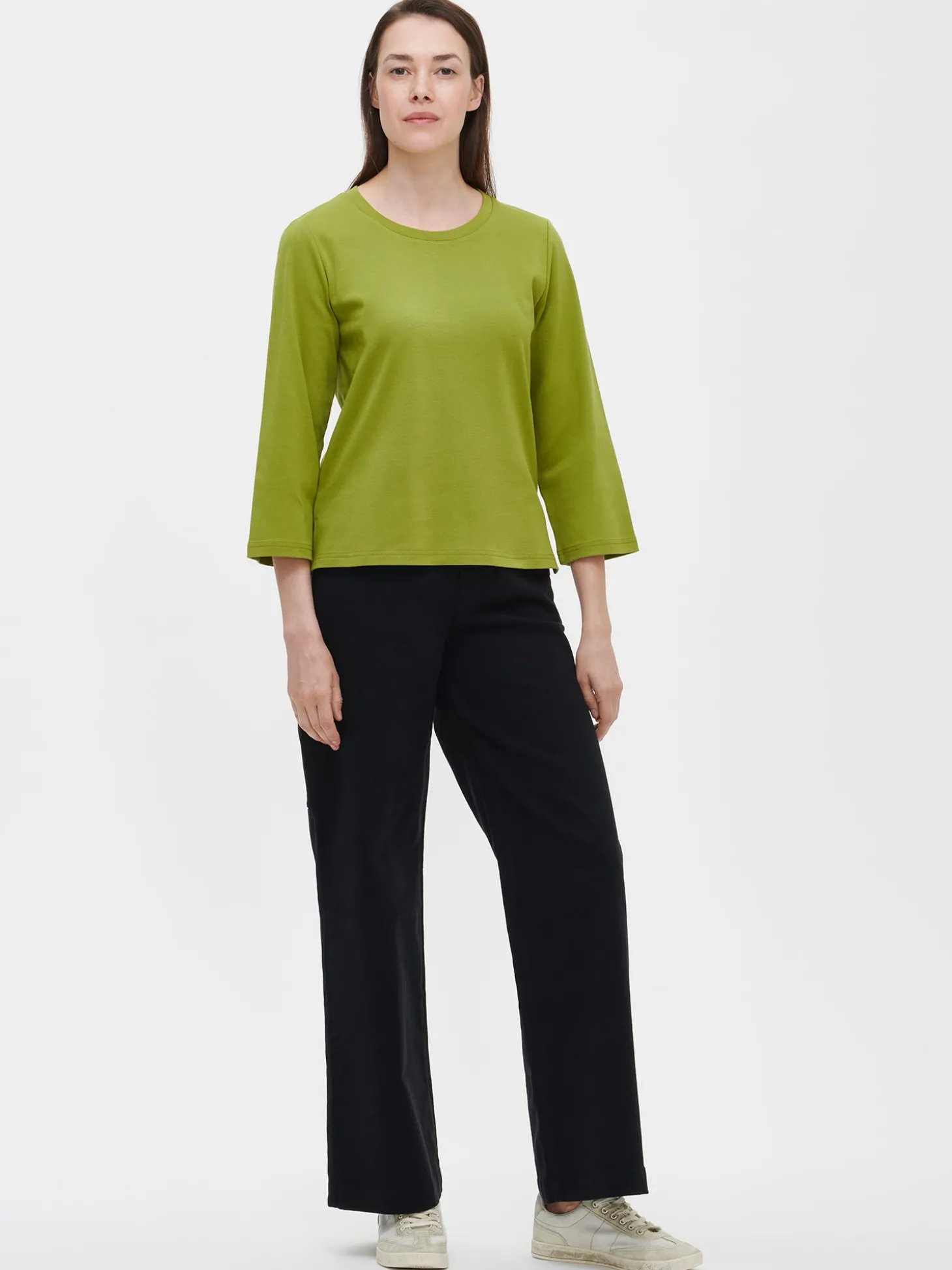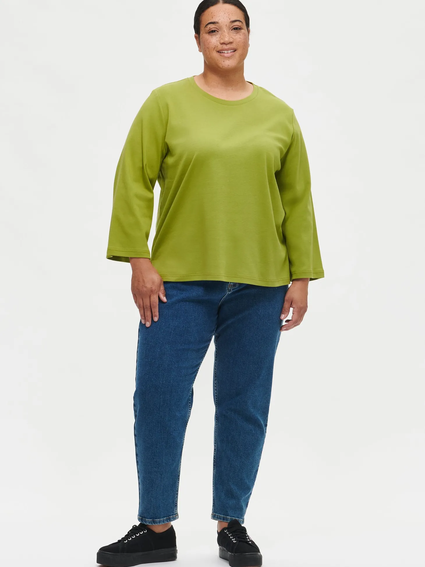 Naisten yksivärinen vihreä Blokki-pusero. Puserossa on sivuilla pienet halkiot ja leveällä tereellä viimeistelty pyöreä pääntie ja 3/4 pituiset hihat. Puseron pituus koossa M on noin 60 cm. Materiaali on 100 % puuvillaa, jämäkämpää interlock-neulosta.