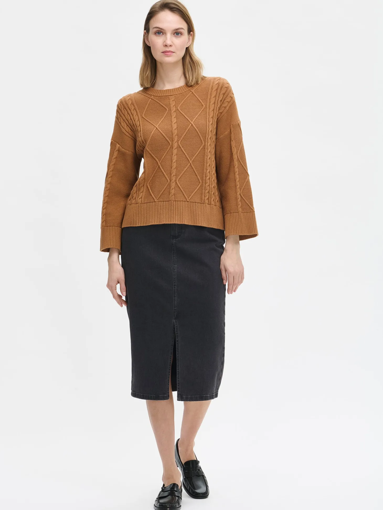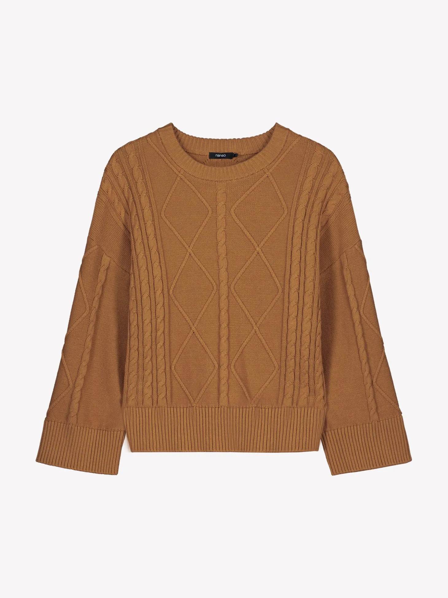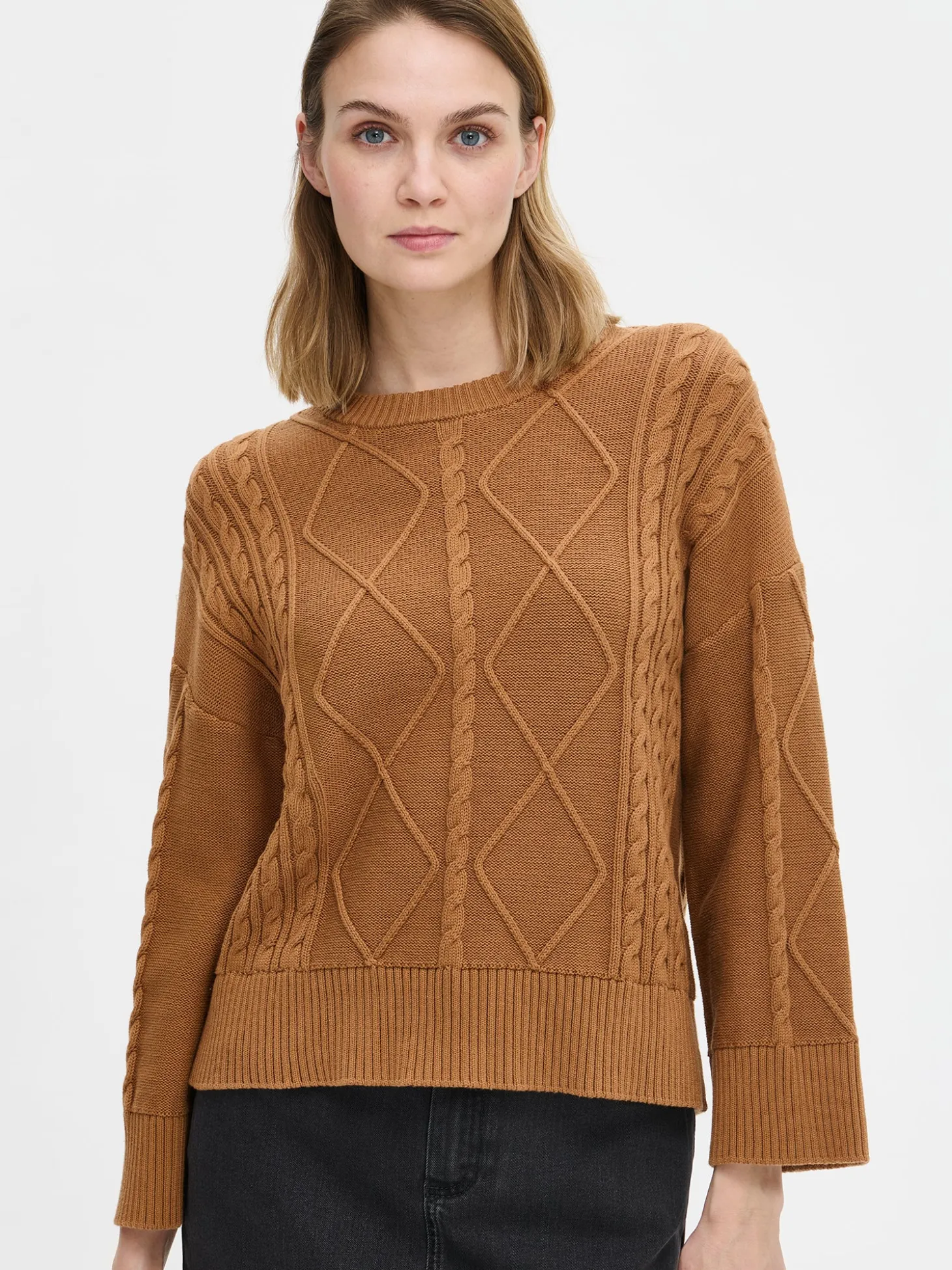 Naisten ruskea Coletta-neulepusero kauniilla palmikkokuviolla. Rennon tyylikäs neulepusero on vaatekaapin kulmakivi. Muotoon neulotussa laatikkomaisessa puuvilla neulepuserossa on pyöreä pääntie ja täyspitkät hihat. Neuleessa on resori hihansuissa sekä helmassa. Tuotteen pituus koossa M on noin 58 cm. Neulepusero on valmistettu laadukkaasta sertifioidusta puuvillasta. Neuleen hoito-ohjeet löydät .