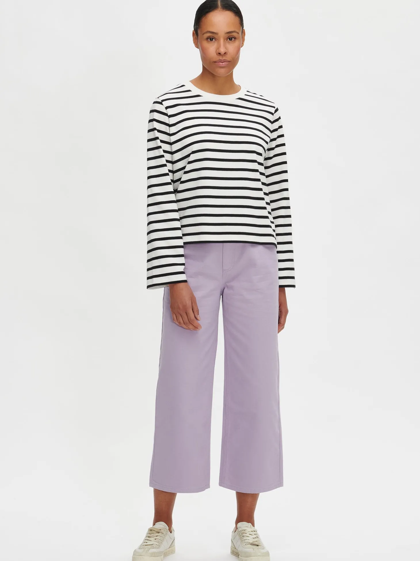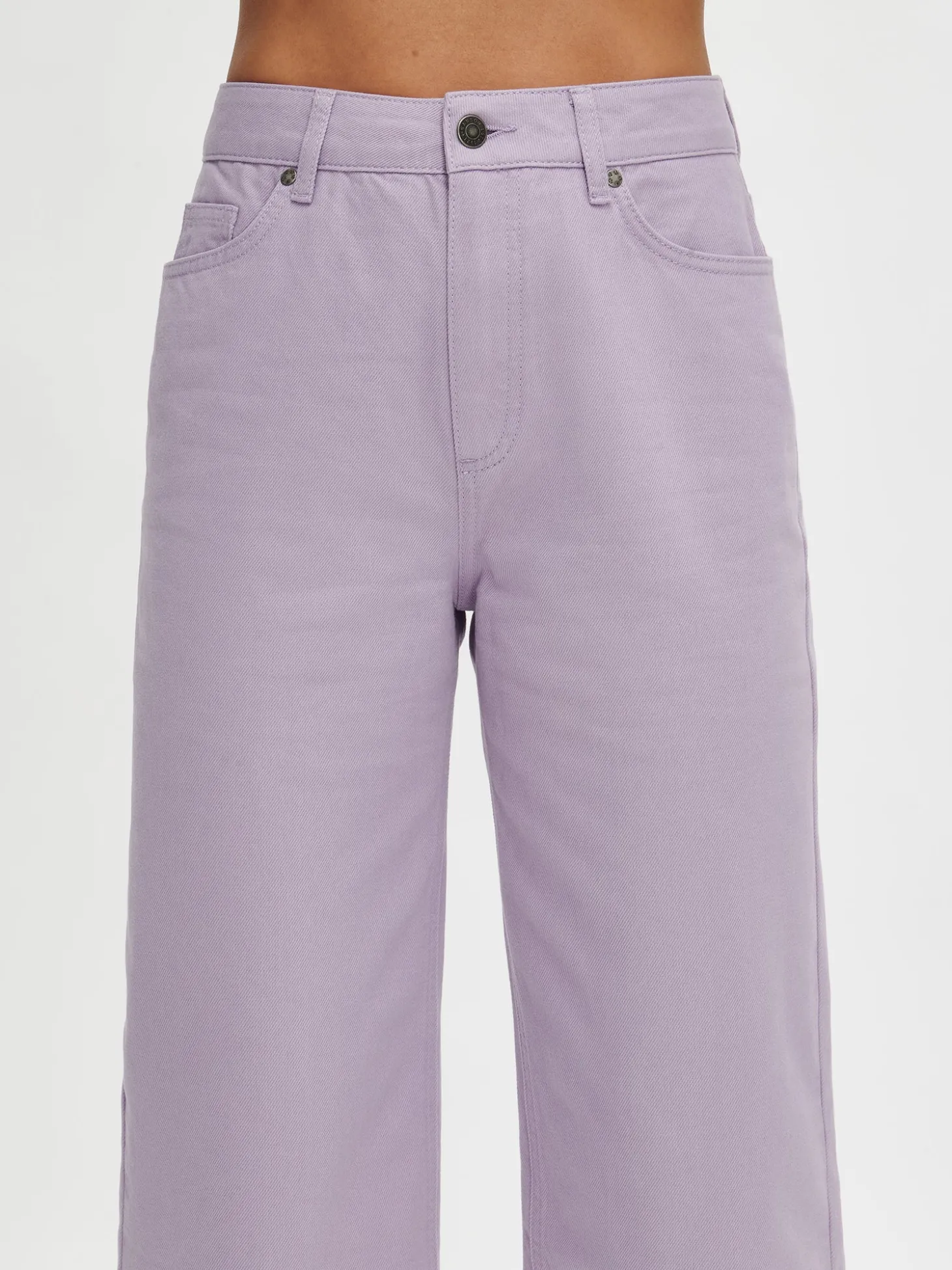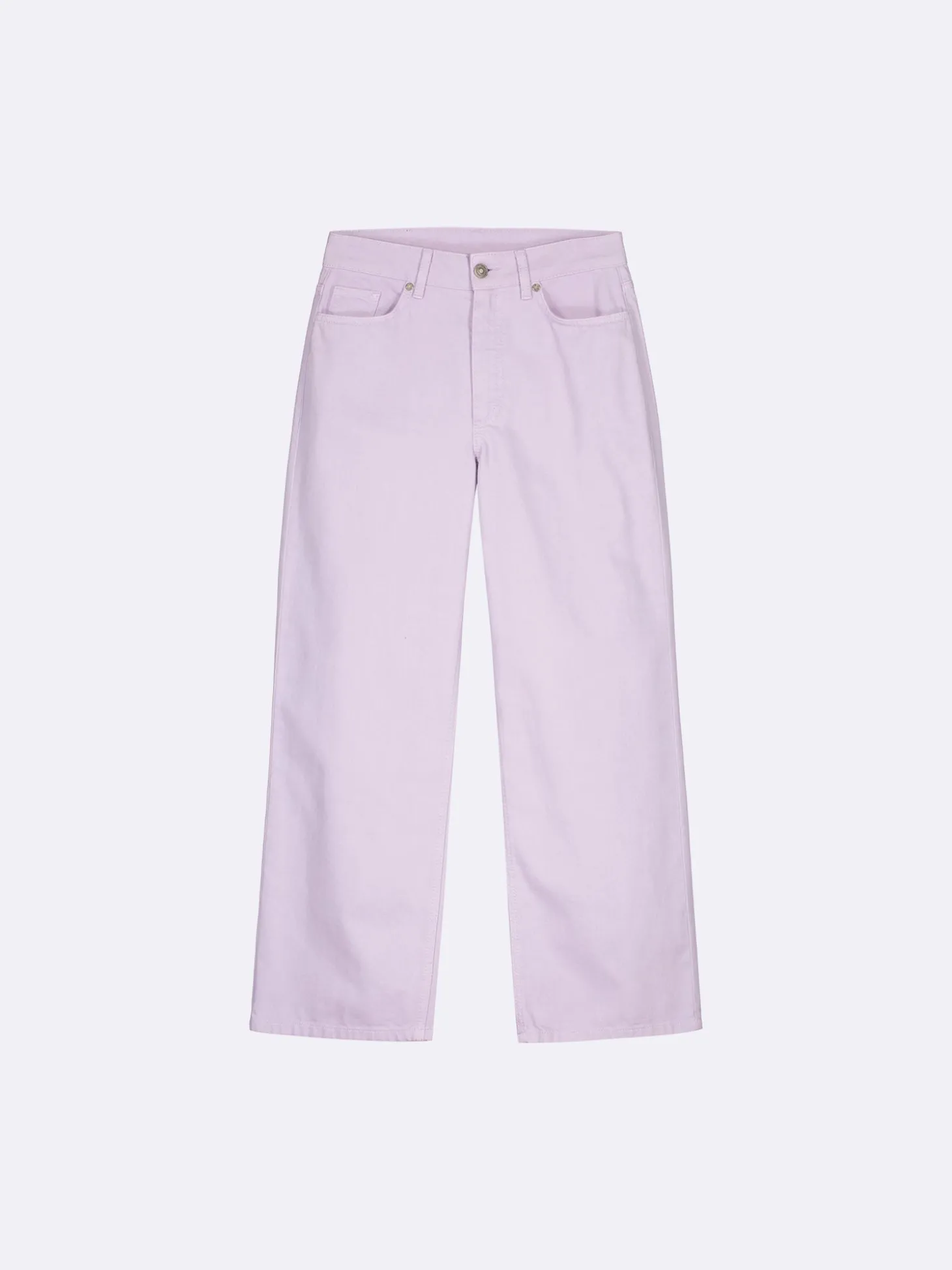 Naisten trendikkäät lilat Cropped Levee-farkut, joissa on normaalikorkuinen vyötärö. Trendikkäästi vajaamittaiset Levee-farkut ovat helppo ja tyylikäs valinta arkeen. Farkuissa on vyötärökaitale, edessä vetoketju ja nappikiinnitys. Rennoissa farkuissa on taskut edessä ja takana sekä levenevät, vajaamittaiset lahkeet. Lahkeen sisäpituus koossa 38 on noin 65 cm. Materiaali on kudottua twillsidoksista puuvilla-denimkangasta. 20% kankaaseen käytetystä puuvillasta on kierrätettyä.