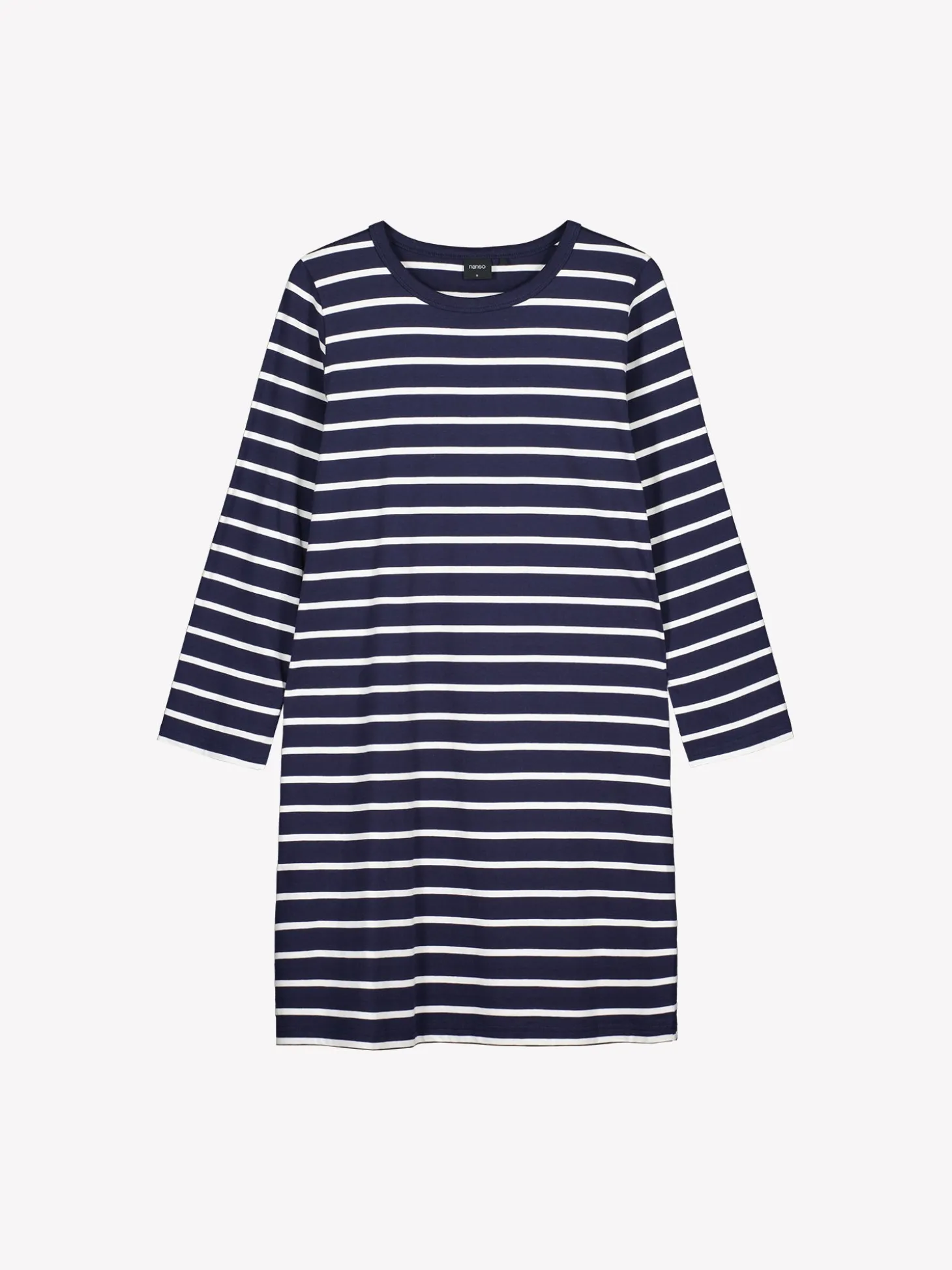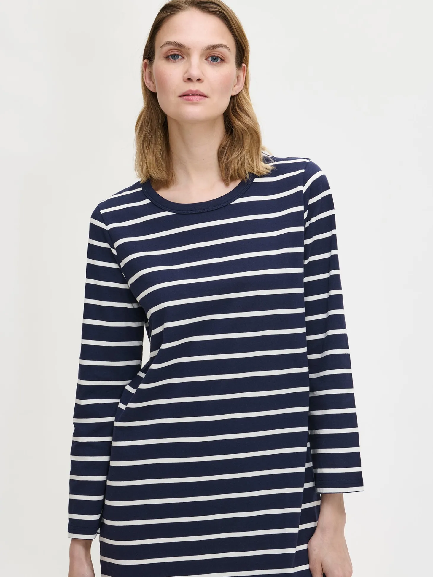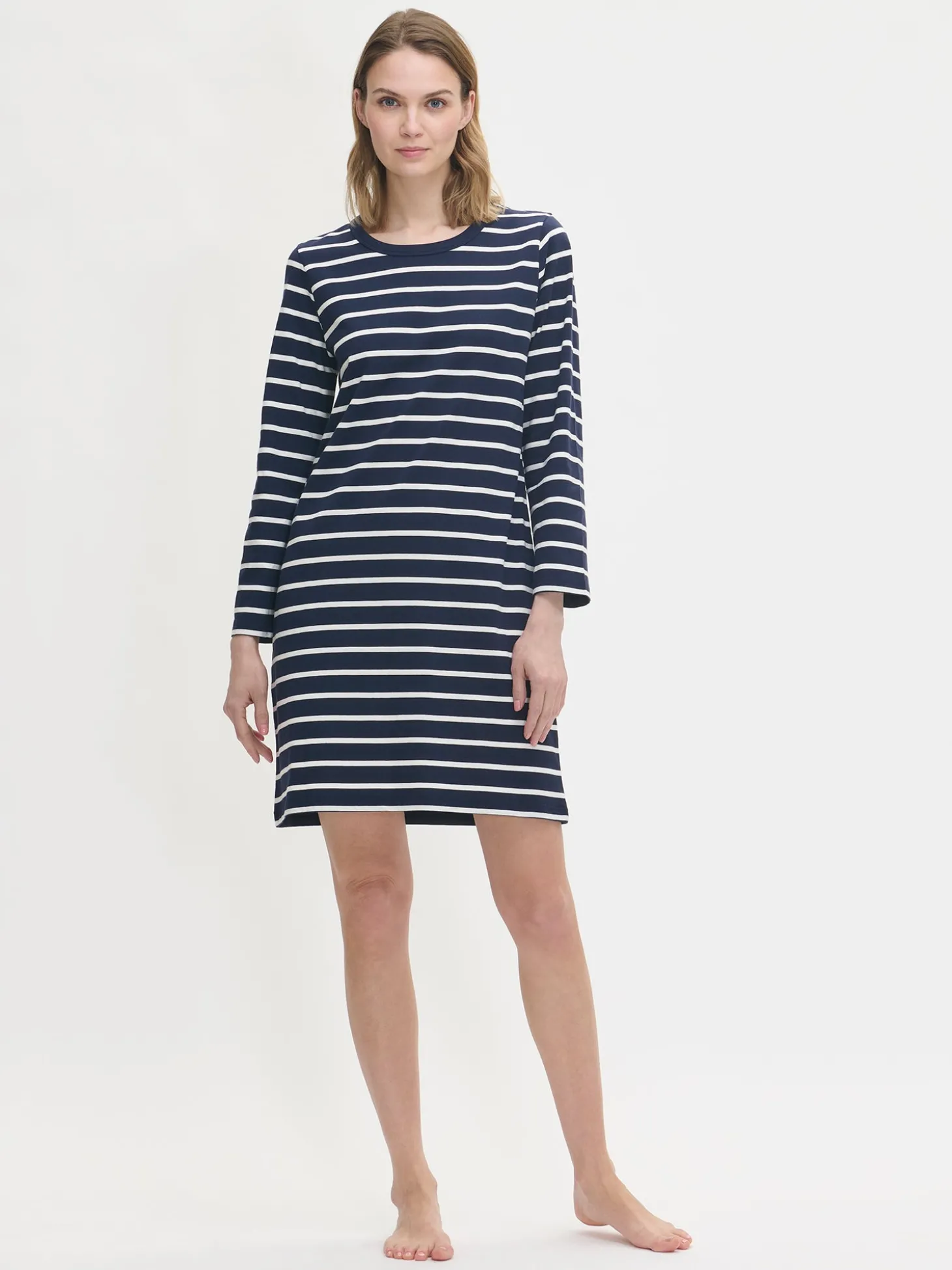 Naisten siniraidallinen Duetto-yöpaita pitkillä hihoilla. Rennon yöpaidan pääntie on viimeistelty yksivärisellä kantilla. Yöpaidan pituus koossa M on noin 95 cm. Materiaali on laadukasta, iholla miellyttävän pehmeältä tuntuvaa ja helppohoitoista puuvillaneulosta, joka pysyy hyvänä pesusta toiseen. Neulos on valmistettu sertifioidusta puuvillasta.