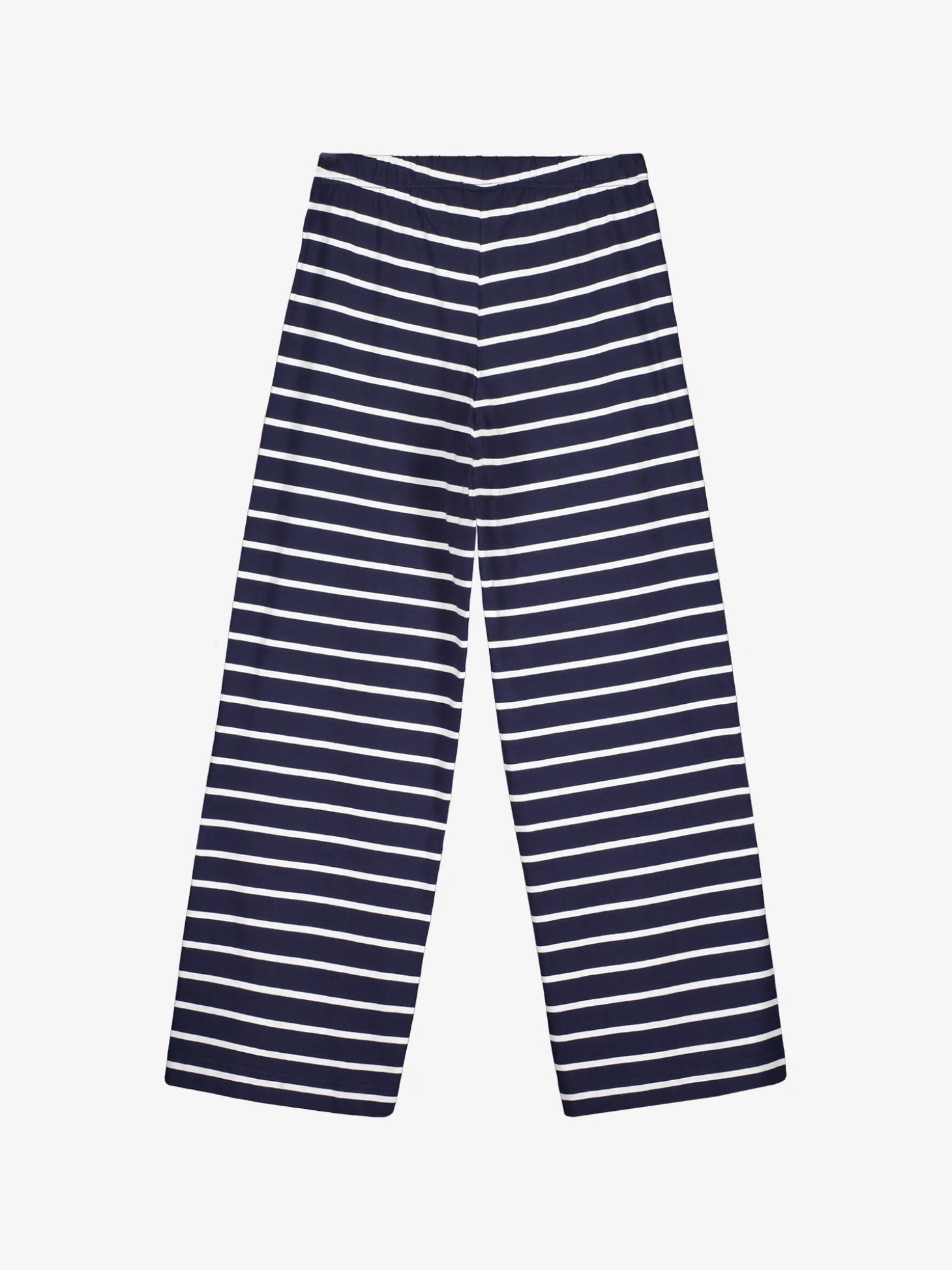 Naisten sinivalkoraidalliset Duetto-housut. Rennot housut ovat täyspitkät ja niissä on vyötäröllä mukava kuminauharakenne. Materiaali on laadukasta, iholla miellyttävän pehmeältä tuntuvaa ja helppohoitoista puuvillaneulosta, joka pysyy hyvänä pesusta toiseen. Neulos on valmistettu sertifioidusta puuvillasta.
