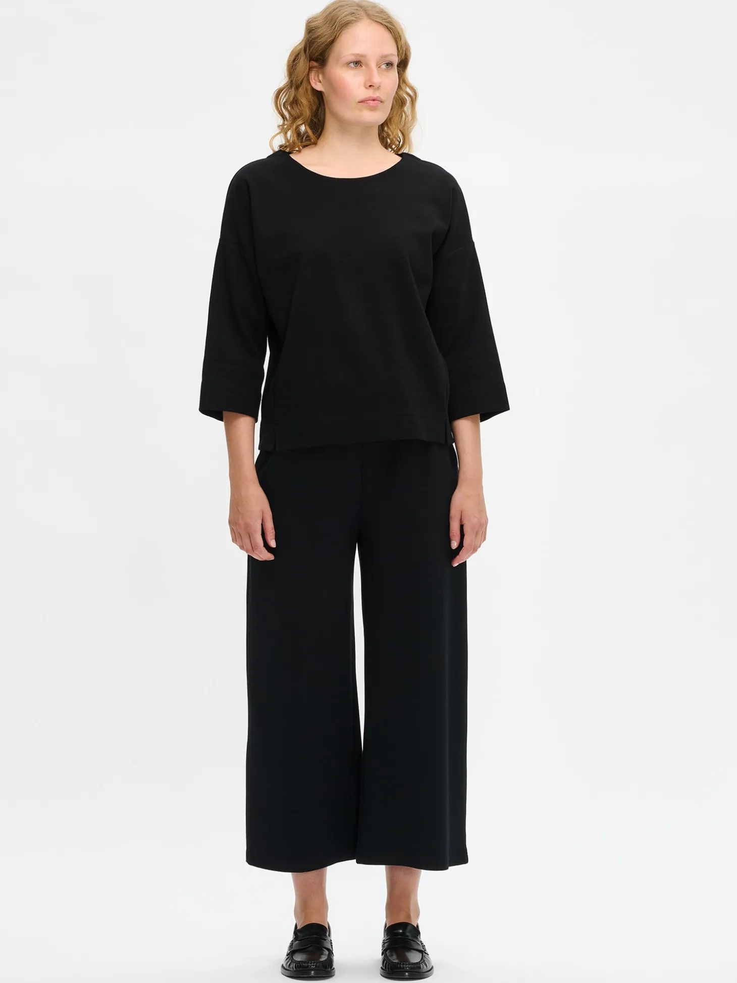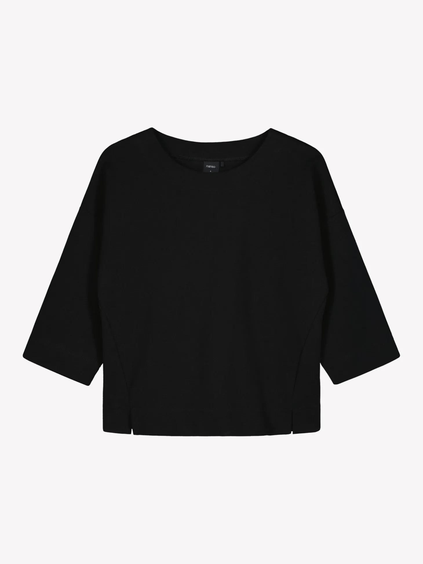 Naisten rento, musta Elena-pusero. Laatikkomaisessa puserossa on alavaralla huoliteltu ovaali pääntie ja 3/4 pituiset hihat. Olkalinja on reilusti pudotettu ja helmassa on halkiot. Puseron sivusauma tulee hienovaraisesti etupuolelle, korostaen vartalon linjoja ja tuoden asuun kevyttä muotoa. Puseron pituus koossa M on noin 62 cm. Materiaali on miellyttävää ja joustavaa puuvilla-polyesteri-elastaanineulosta. Pehmeä ja joustava Elena-pusero on helppo yhdistää eri asuihin, ja se tuo arkeen ajattoman mukavuutta.
