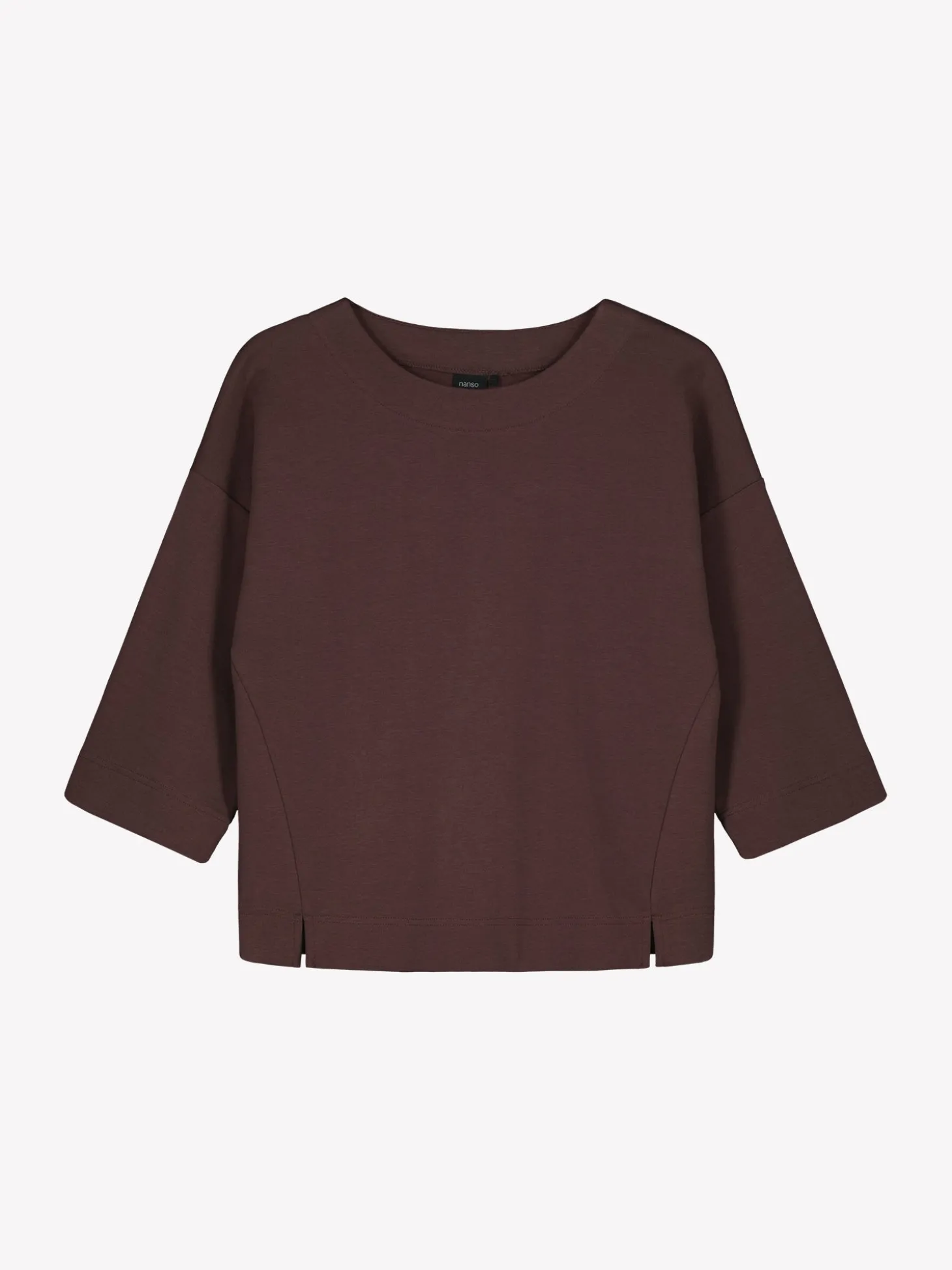 Naisten rento, ruskea Elena-pusero. Laatikkomaisessa puserossa on alavaralla huoliteltu ovaali pääntie ja 3/4 pituiset hihat. Olkalinja on reilusti pudotettu ja helmassa on halkiot. Puseron sivusauma tulee hienovaraisesti etupuolelle, korostaen vartalon linjoja ja tuoden asuun kevyttä muotoa. Puseron pituus koossa M on noin 62 cm. Materiaali on miellyttävää ja joustavaa puuvilla-polyesteri-elastaanineulosta. Pehmeä ja joustava Elena-pusero on helppo yhdistää eri asuihin, ja se tuo arkeen ajattoman mukavuutta.