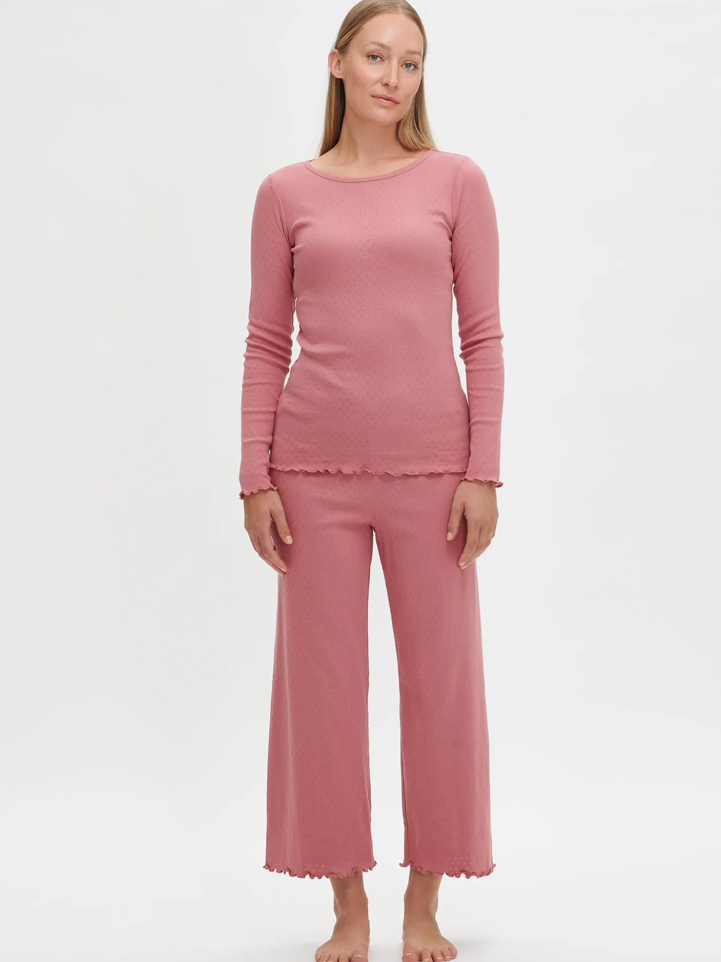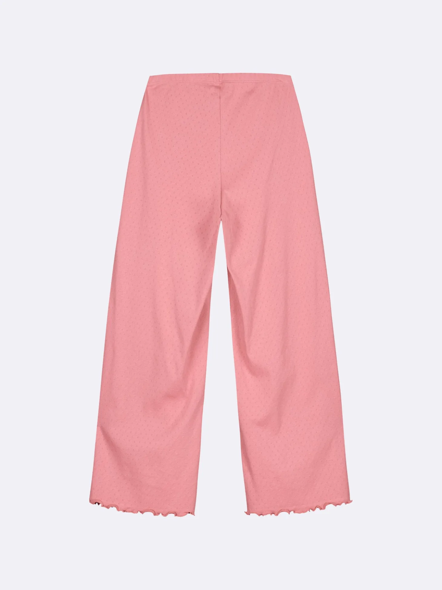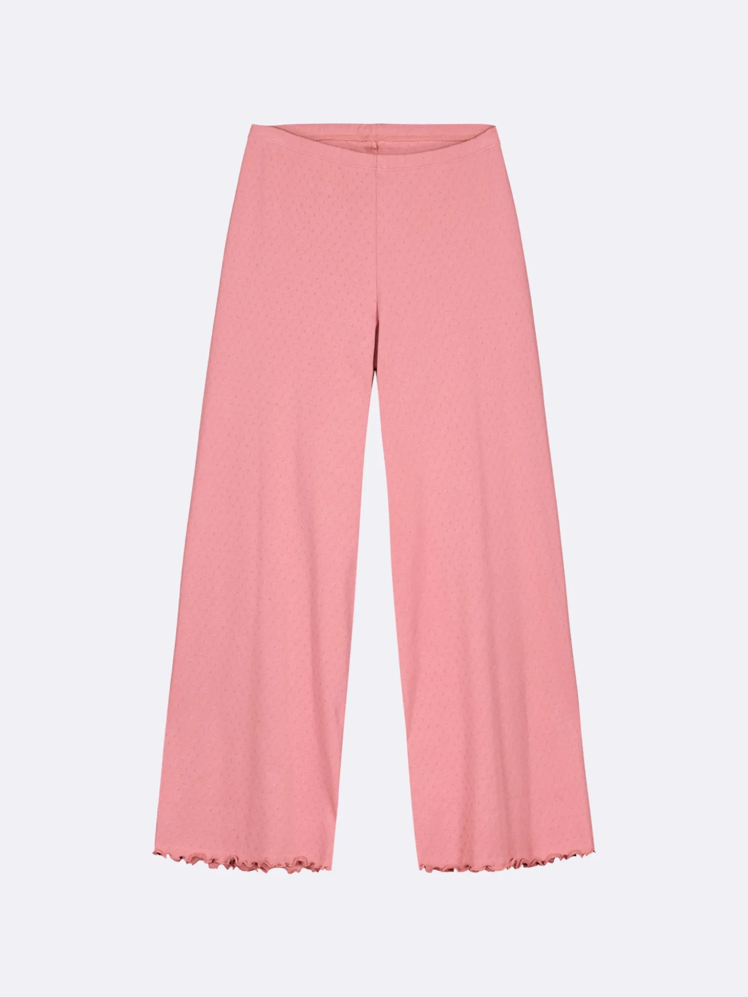 Naisten roosat Elise-housut. 7/8 pituisissa housuissa on joustava vyötärö. Lahkeensuut on viimeistelty kapealla ja tiiviillä saumuritikkauksella, joka huolittelee reunan ja luo siihen kauniin aaltoilevan efektin. Materiaali on joustavaa ja miellyttävän tuntuista puuvillaribbineulosta, jossa on kaunis ja hienostunut neulottu pitsikuvio.