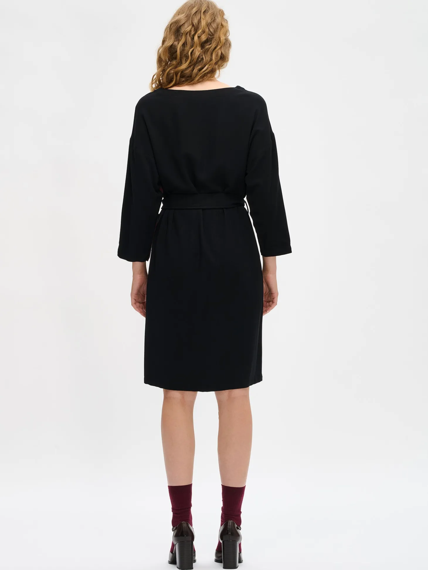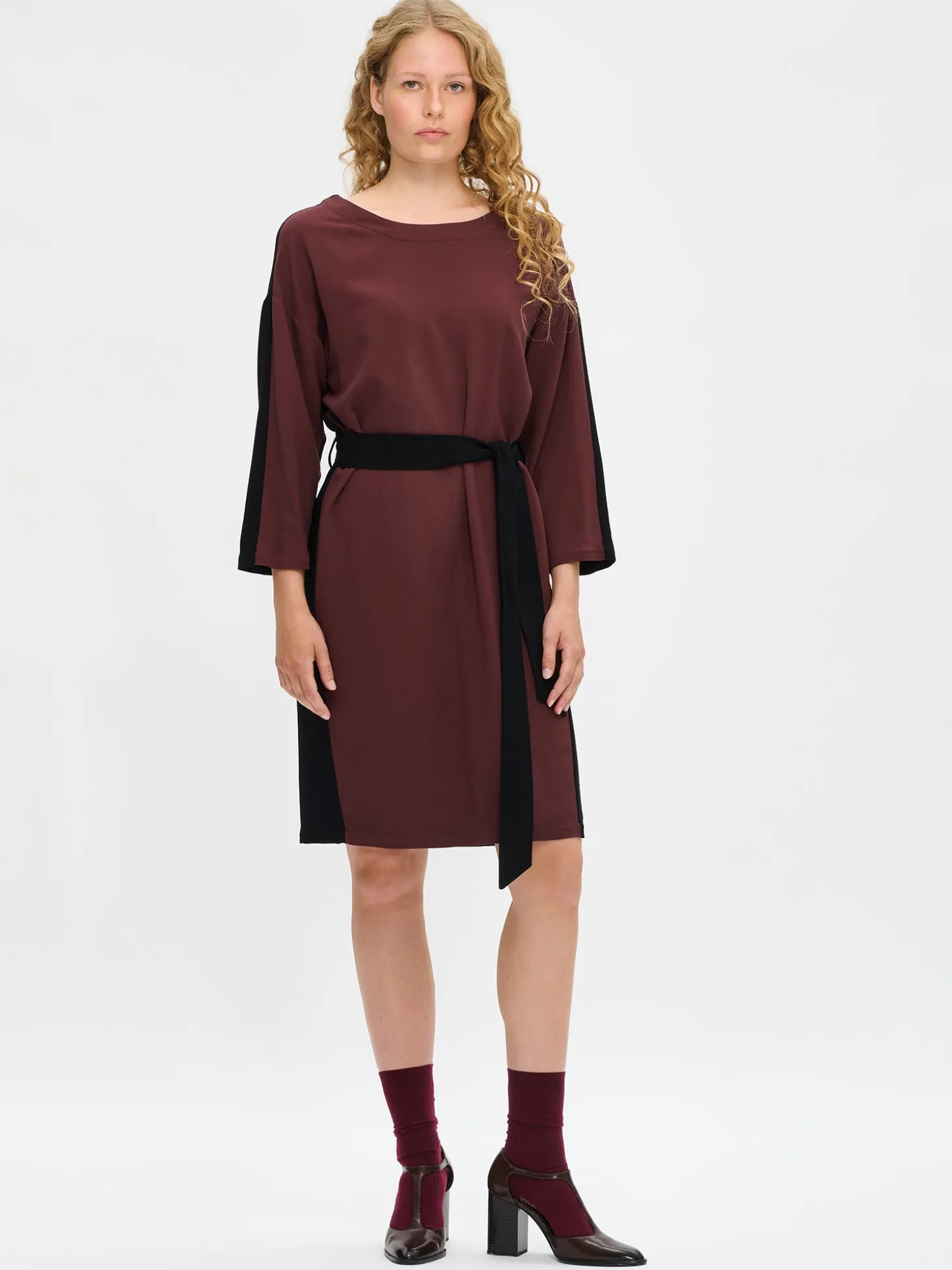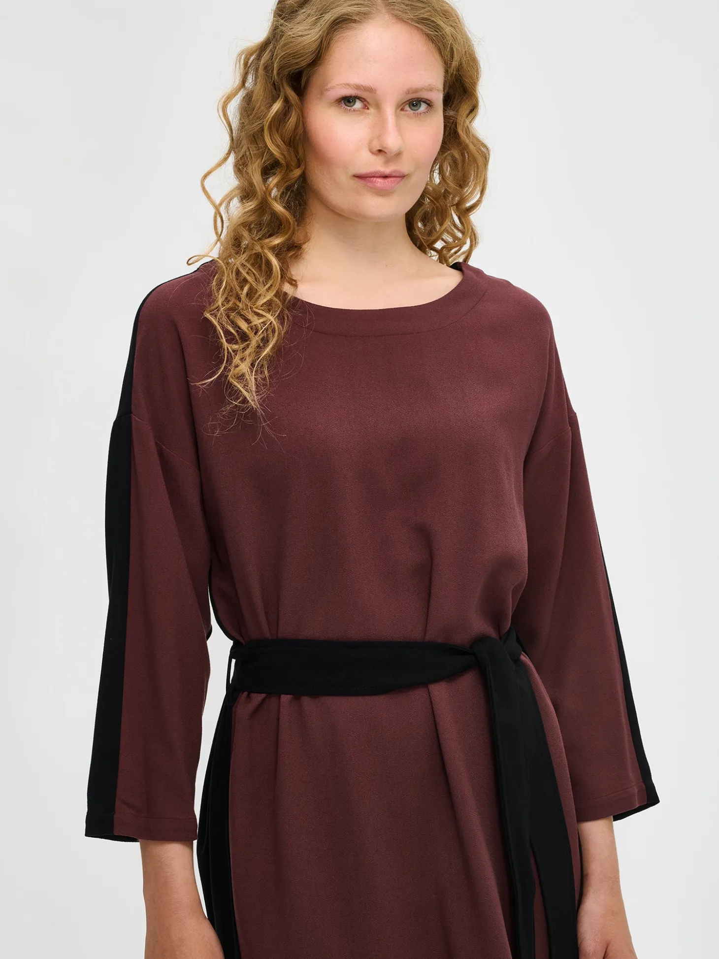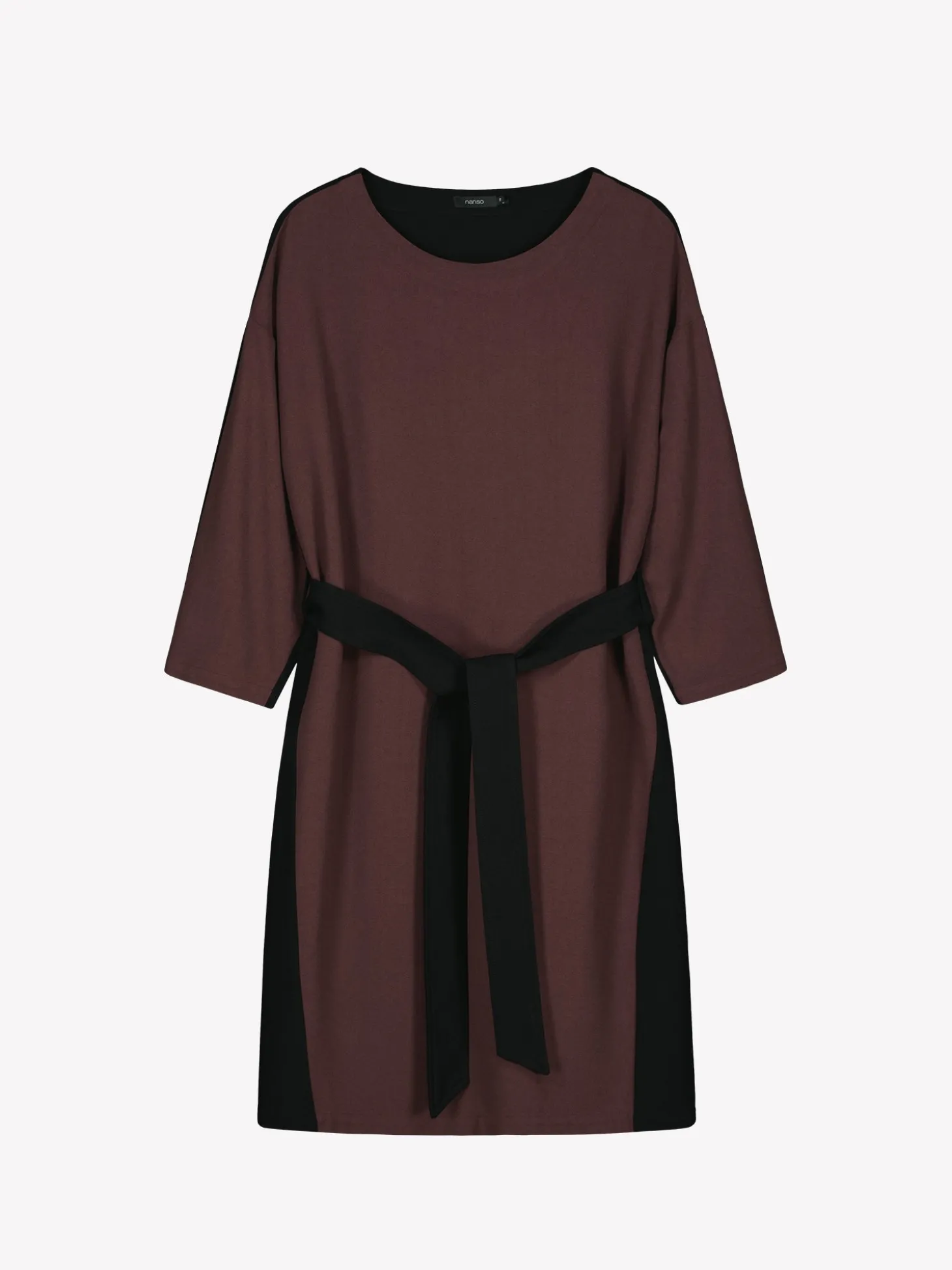 Naisten tummanruskea-musta Fiine-mekko. Mekossa on hieman laskettu olkalinja ja suorat väljät hiha, jotka ovat pituudeltaan 3/4 mittaiset. Mekko on kaksivärinen ja vyötäröllä on vyö, jonka saa solmittua kauniille rusetille. Mekon pituus koossa 38 on noin 102 cm. Materiaali on kauniisti laskeutuvaa 100 % viskoosikreppikangasta. Materiaalille on ominaista 3-5 % kutistuminen ensimmäisessä pesussa.