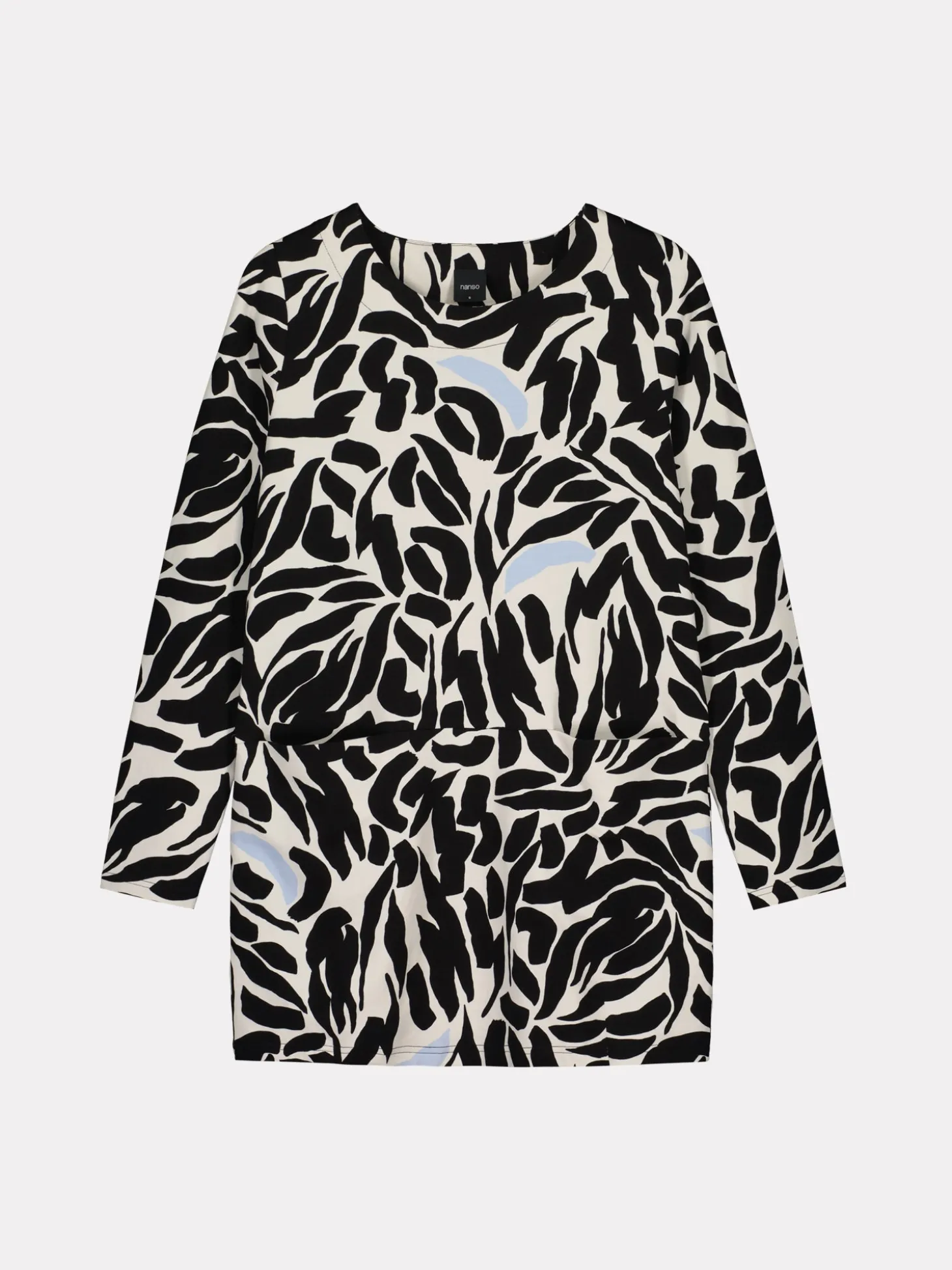 Naisten kuosillinen beige Flavia-tunika pitkillä hihoilla. Rentolinjaisessa tunikassa on helmassa muotolaskokset luomassa tulppaanimaista muotoa. Pyöreä pääntie on viimeistelty alavaralla, edessä leikkaussaumassa on upotettuna taskut ja hihat ovat täyspitkät. Tunikan pituus koossa M on noin 80 cm. Materiaali on laadukasta ja miellyttävän tuntuista puuvilla-elastaani-neulosta.