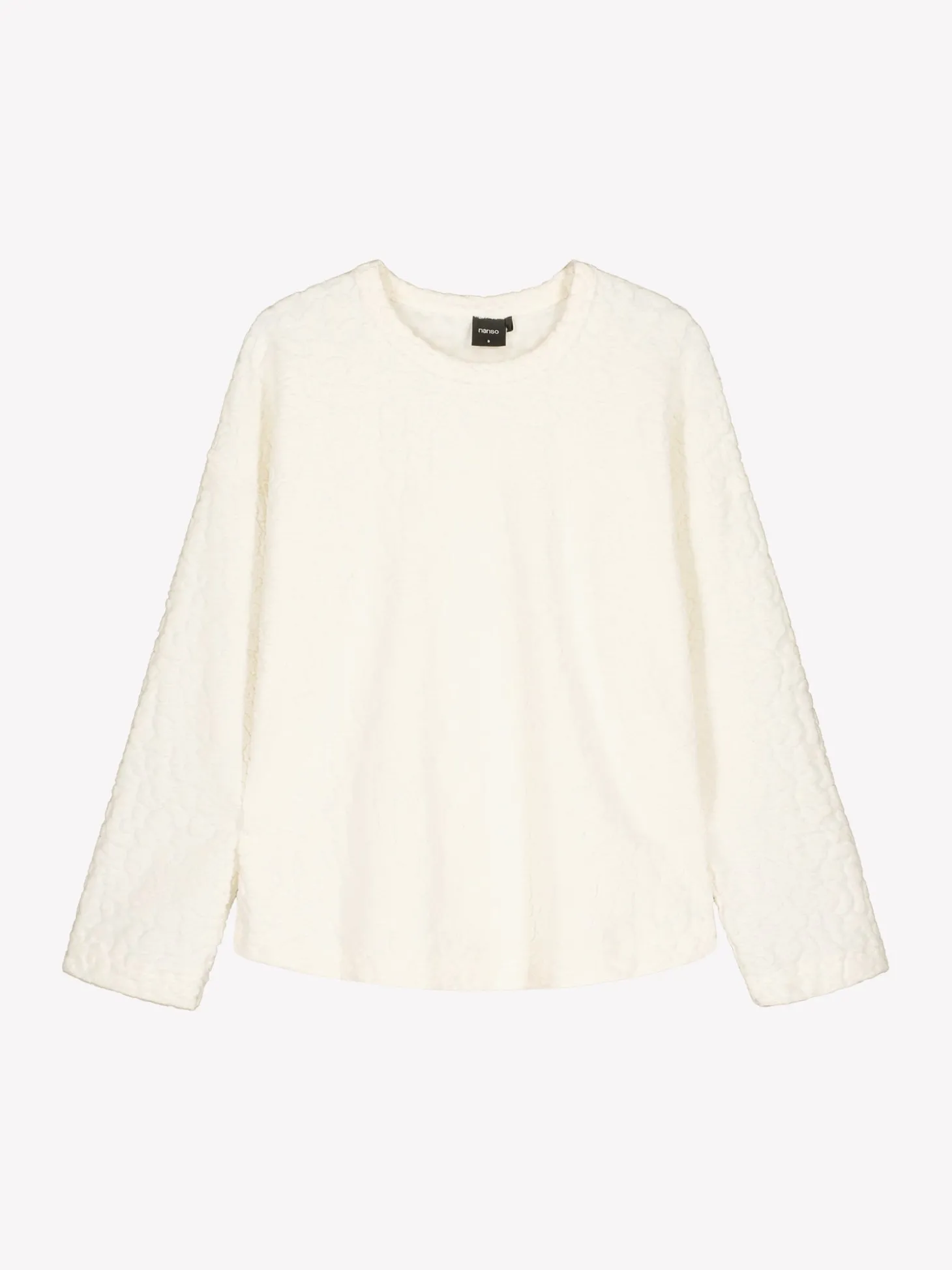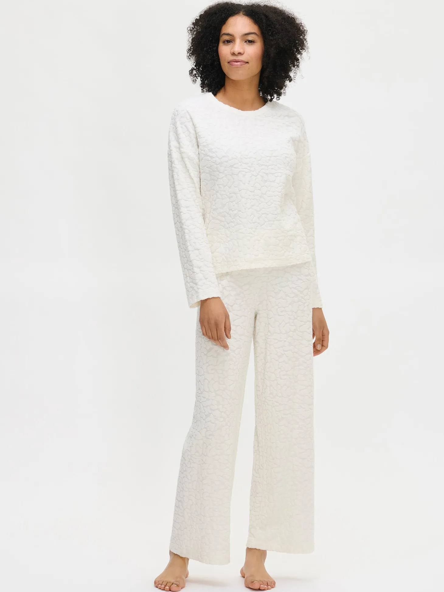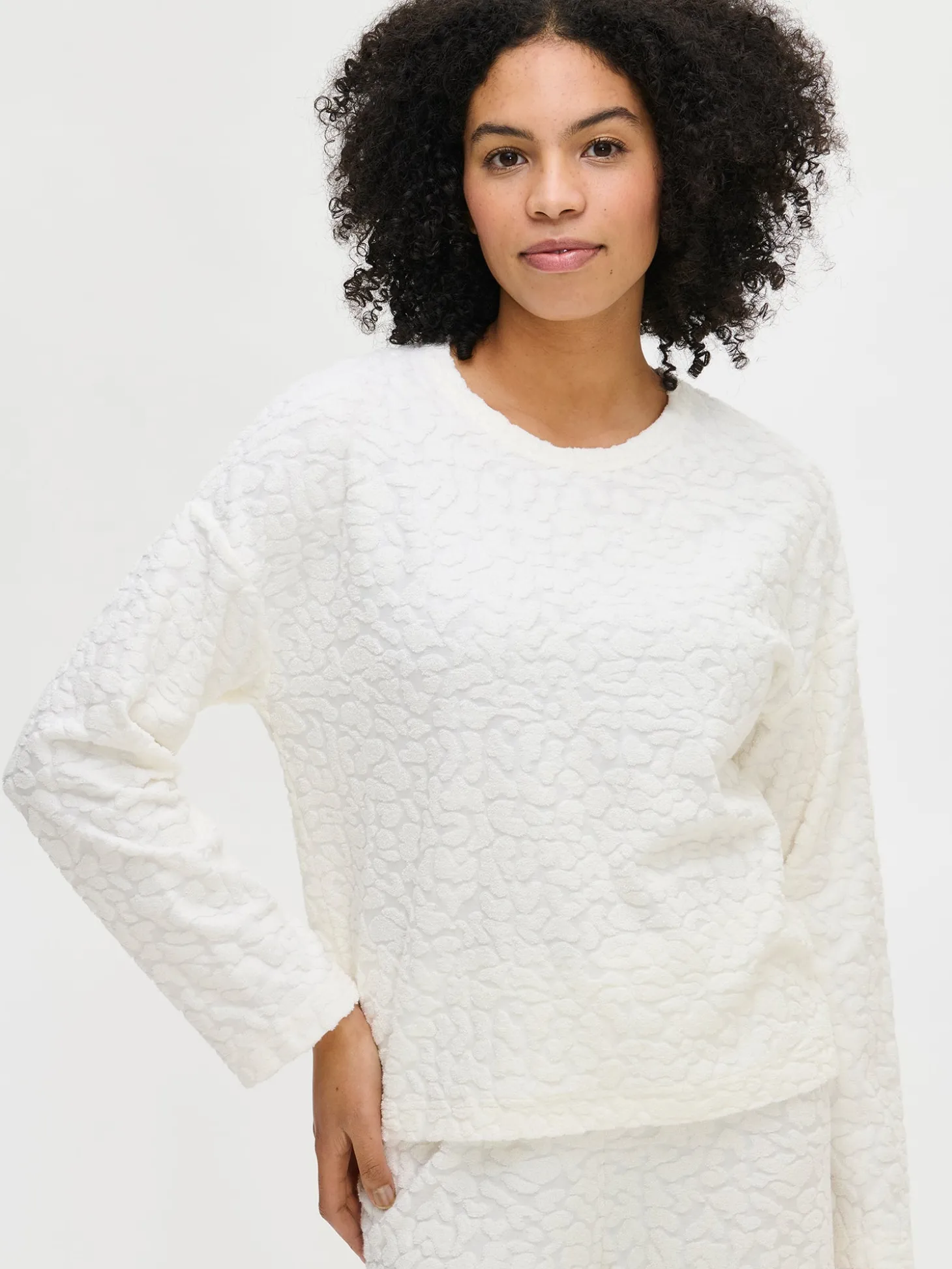 Naisten valkoinen Gepardi-paita pitkillä hihoilla ja pyöreällä pääntiellä. Paidan pituus koossa M on noin 65 cm. Pintakuvioitu materiaali on miellyttävää puuvilla-polyesteri jaquard-neulosta, jossa on hieman elastaania tuomassa joustoa. Rento paita toimii täydellisesti osana yö- tai loungeasua – tai nauti sellaisenaan kotipäivissä.