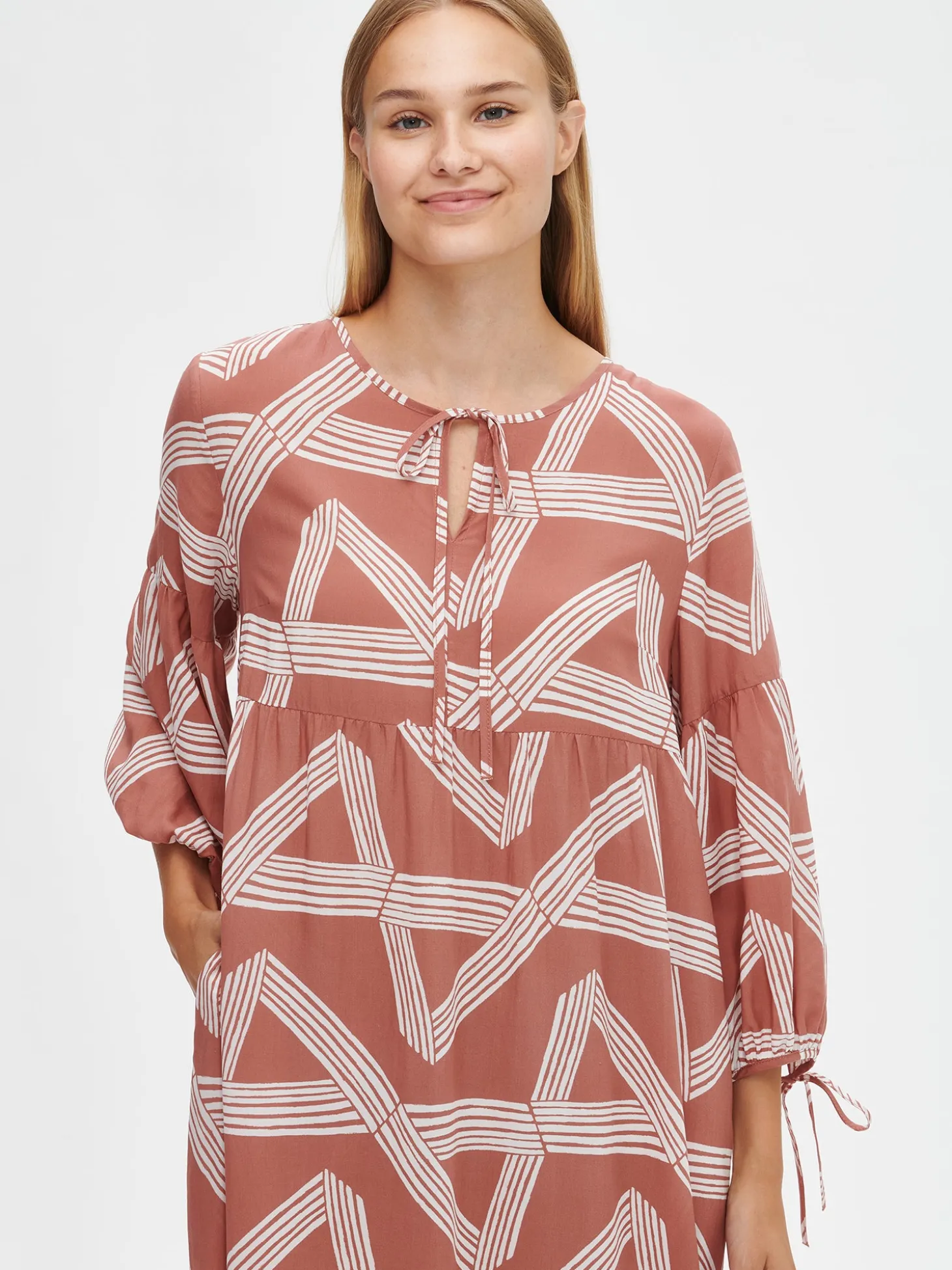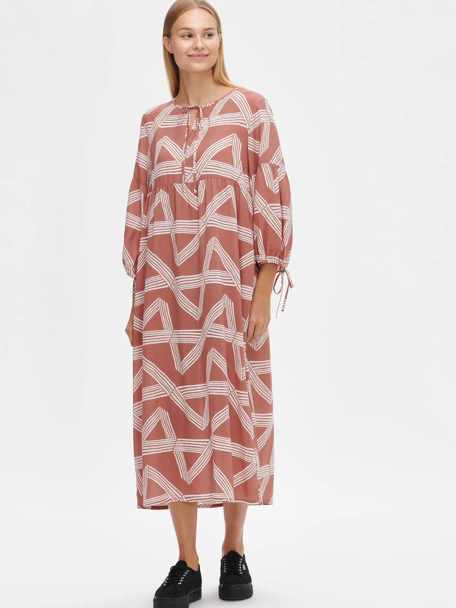 Naisten kuosillinen punaruskea pitkä Graffito-mekko. Kauniissa väljässä mekossa on pyöreä pääntie, jossa nyöri edessä ja hihansuissa. Mekon 3/4 pituiset hihat poimuttuvat runsaasti hihansuun kantin yläpuolelle. Mekon pituus koossa 38 on noin 125 cm. Materiaali on kevyttä ja läpikuultavaa miellyttävän tuntuista 100% Lyocell (TENCEL™)-kangasta. Materiaalille on ominaista 3-5% kutistuminen ensimmäisessä pesussa.