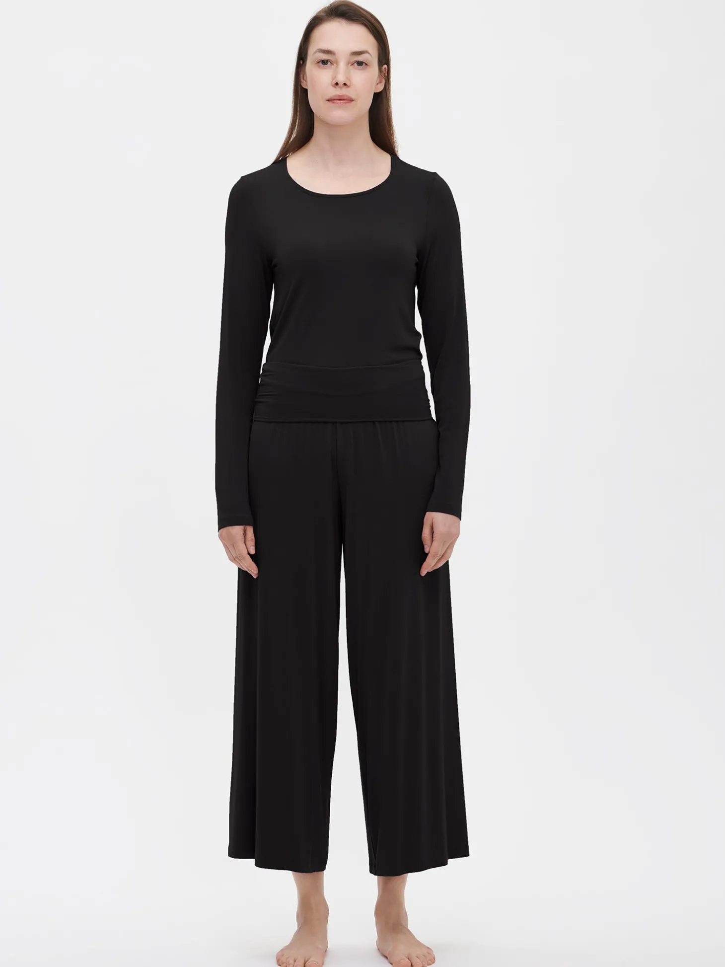 Naisten ylellisen pehmeät mustat Hento-housut. Housuissa on mukava vyötärörakenne leveällä ja tukevalla tuplakaistaleella. Rennot housut ovat tyylikkäästi 7/8-pituiset. Materiaali on laadukasta, silkkisen pehmeää modaali-elastaania, joka tarjoaa ihanan pehmeän ja joustavan tuntuman.