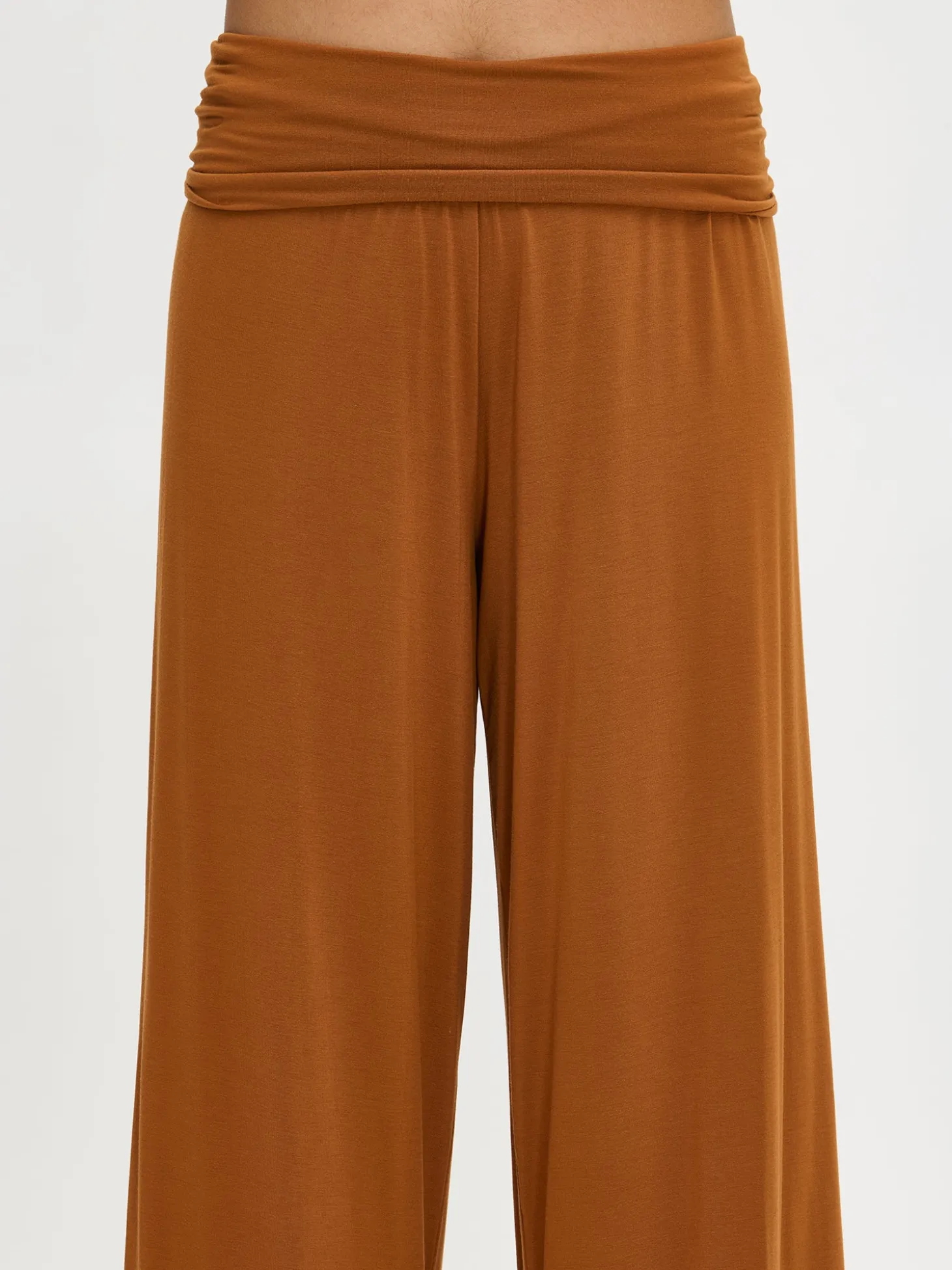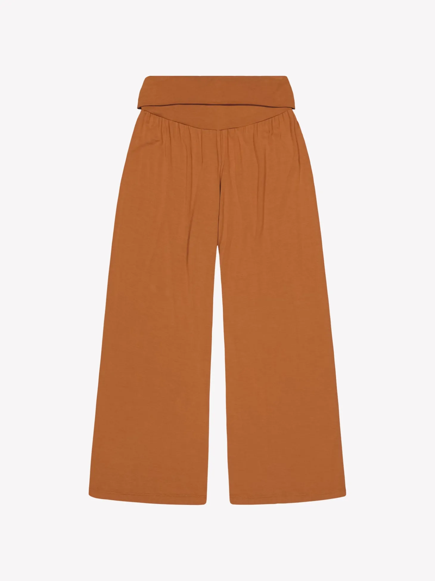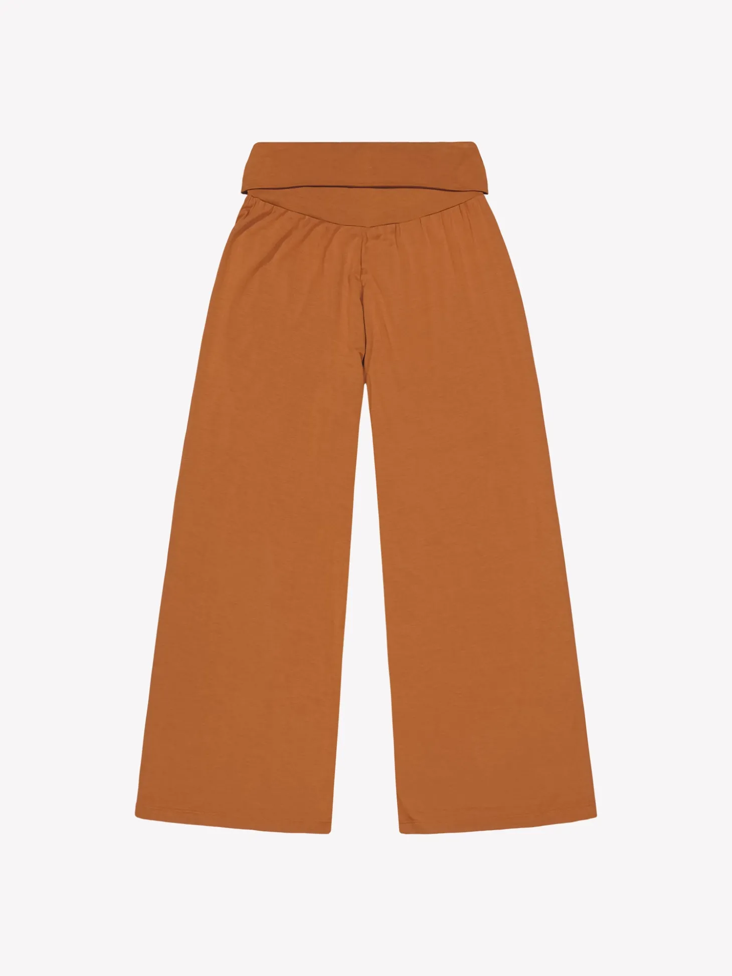 Naisten ylellisen pehmeät yksiväriset Hento-housut ruskeassa sävyssä. Housuissa on mukava vyötärörakenne leveällä ja tukevalla tuplakaistaleella. Rennot housut ovat tyylikkäästi 7/8 pituiset. Materiaali on laadukasta, iholla miellyttävän pehmeältä tuntuvaa modaali-elastaania.