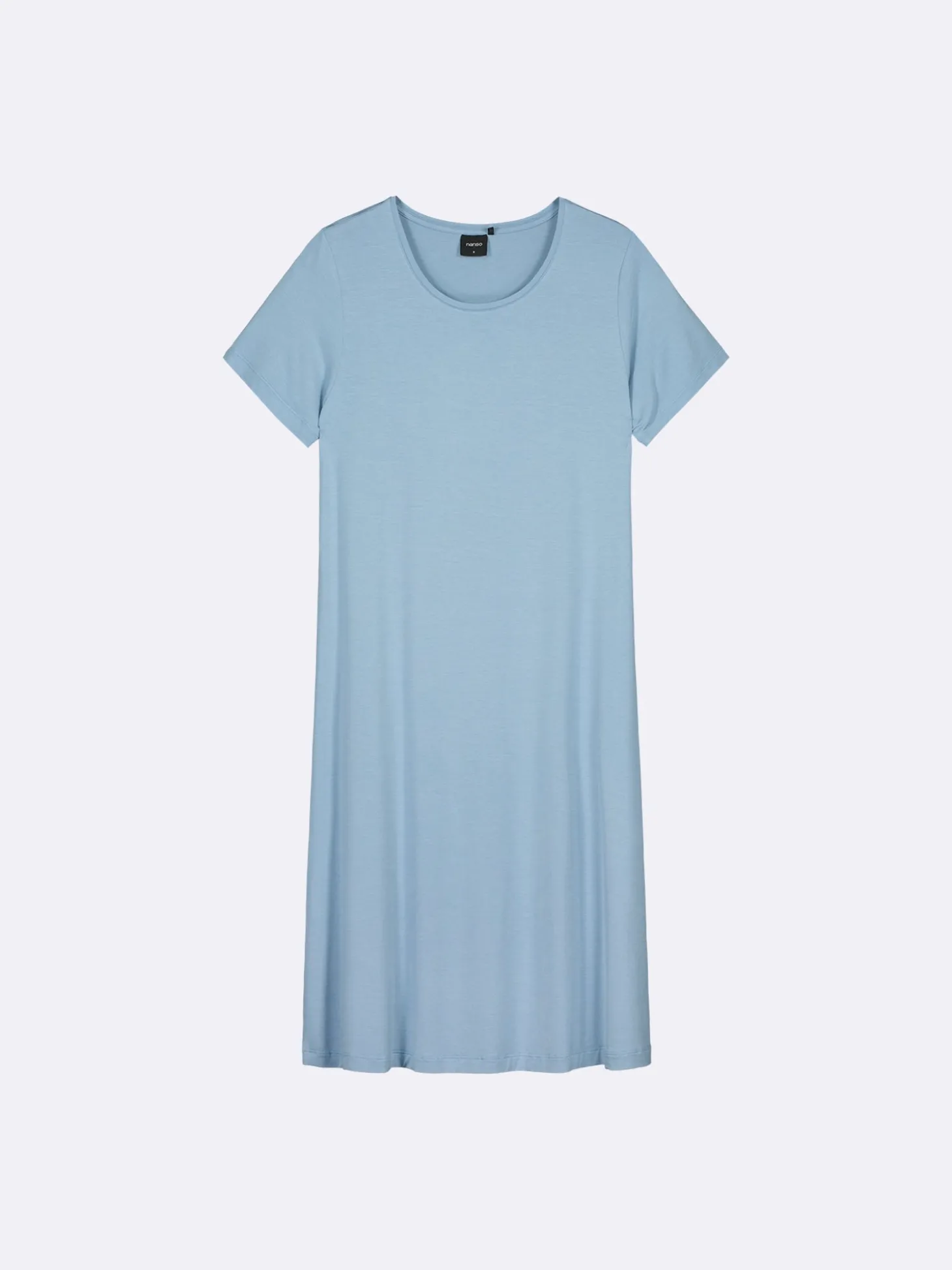 Naisten yksivärinen sininen Hento-yöpaita lyhyillä hihoilla ja pyöreällä pääntiellä. Mekon pituus koossa M on noin 95 cm. Materiaali on laadukasta, iholla miellyttävän pehmeältä tuntuvaa modaali-elastaania.