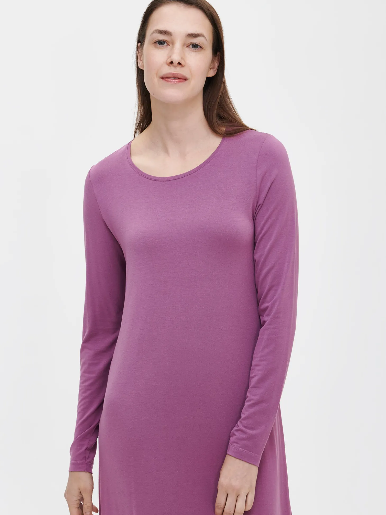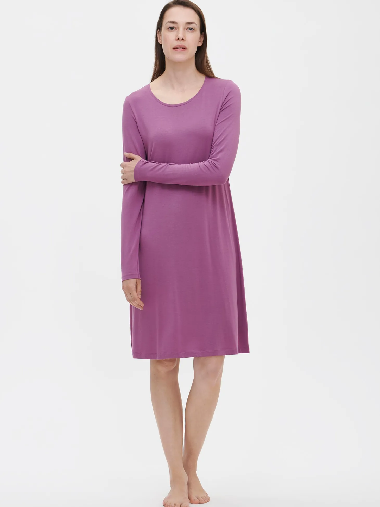 Naisten ylellisen pehmeä mauven eli vaalean violetin värinen Hento-yöpaita pitkillä hihoilla ja pyöreällä pääntiellä. Yöpaidan pituus koossa M on noin 95 cm. Materiaali on laadukasta, iholla miellyttävän pehmeältä tuntuvaa modaali-elastaania.