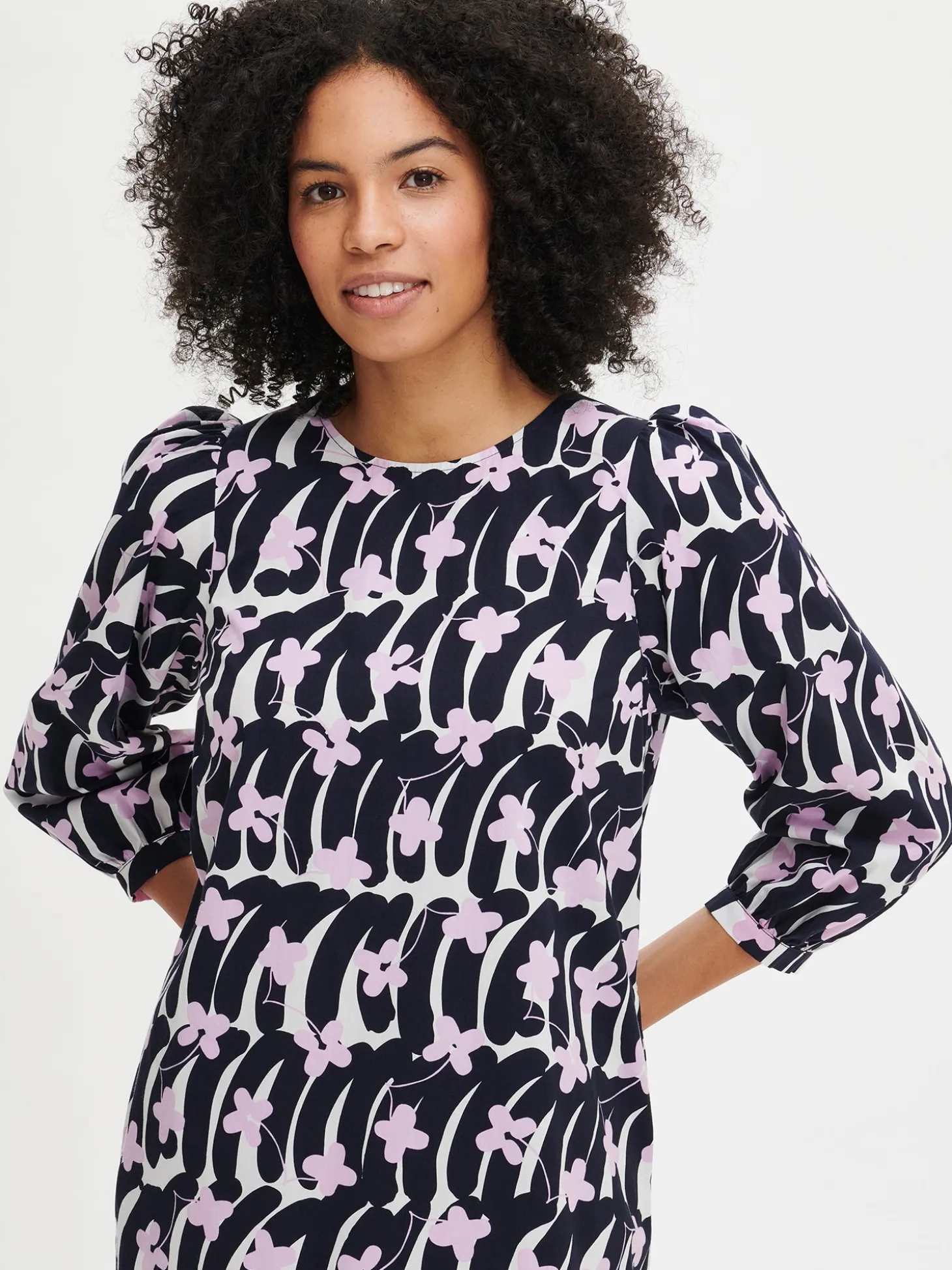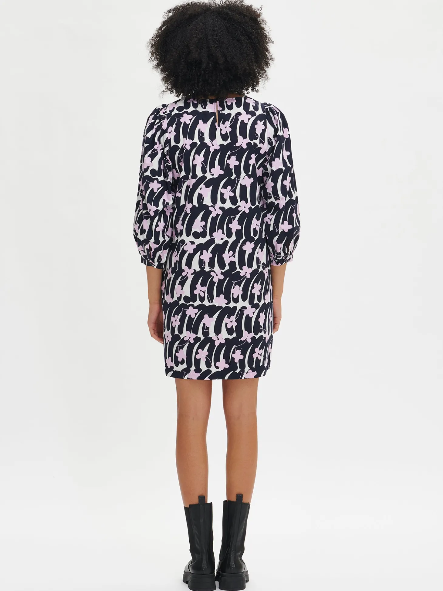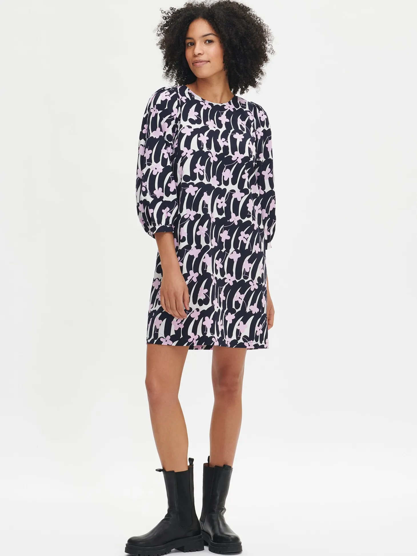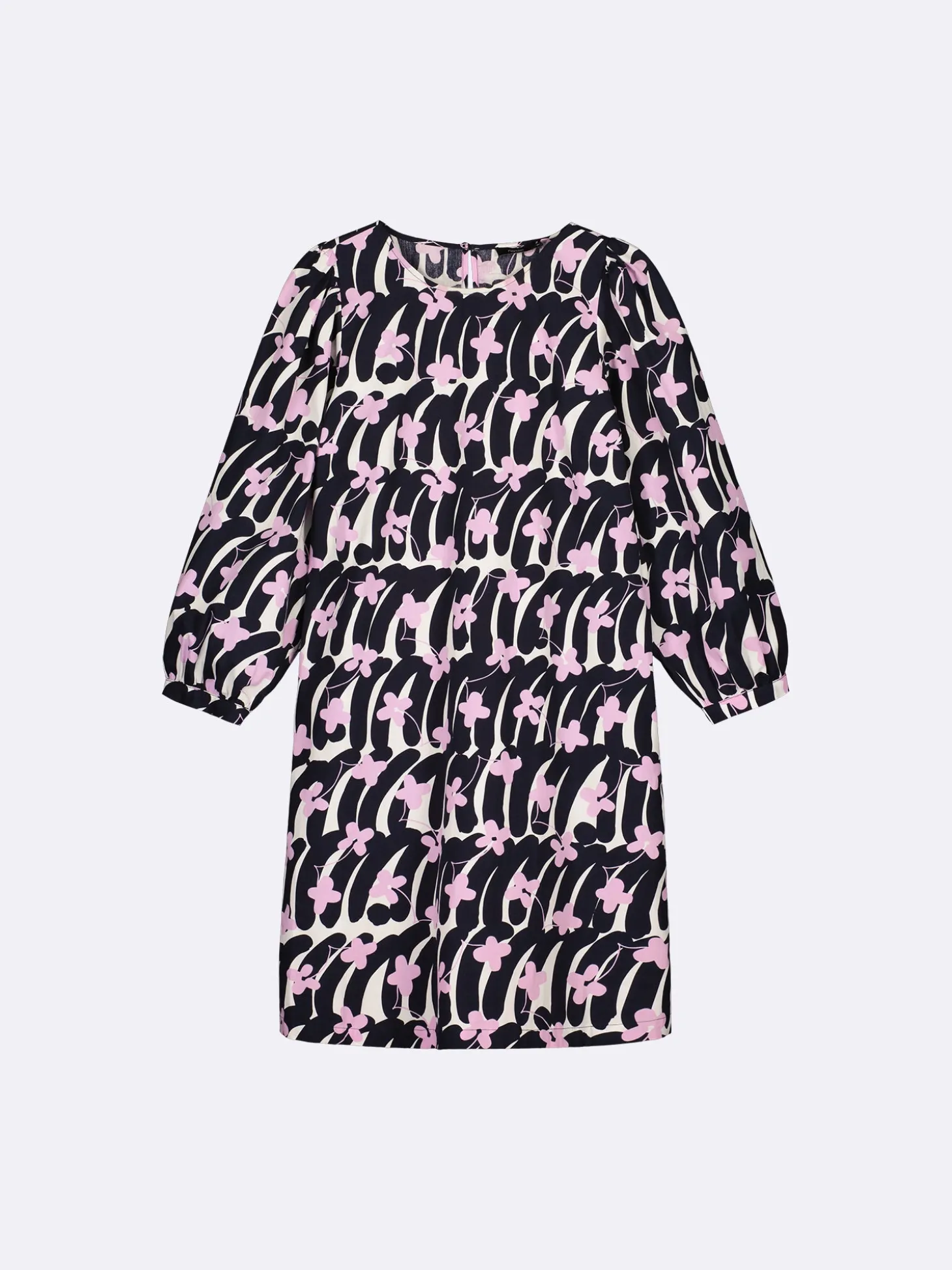Naisten kuosillinen tummansininen Hoya-mekko. Mekossa on pyöreä pääntie, jossa on takana nappihalkio. Mekon 3/4 pituiset hihat poimuttuvat olalla ja hihansuun säädettävän listan yläpuolella. Mekon sivuissa on taskut. Mekon pituus koossa 38 on noin 95 cm. Materiaali on kevyttä, mutta ryhdikästä puuvilla-popliinia. Materiaalille on ominaista 3-5 % kutistuminen