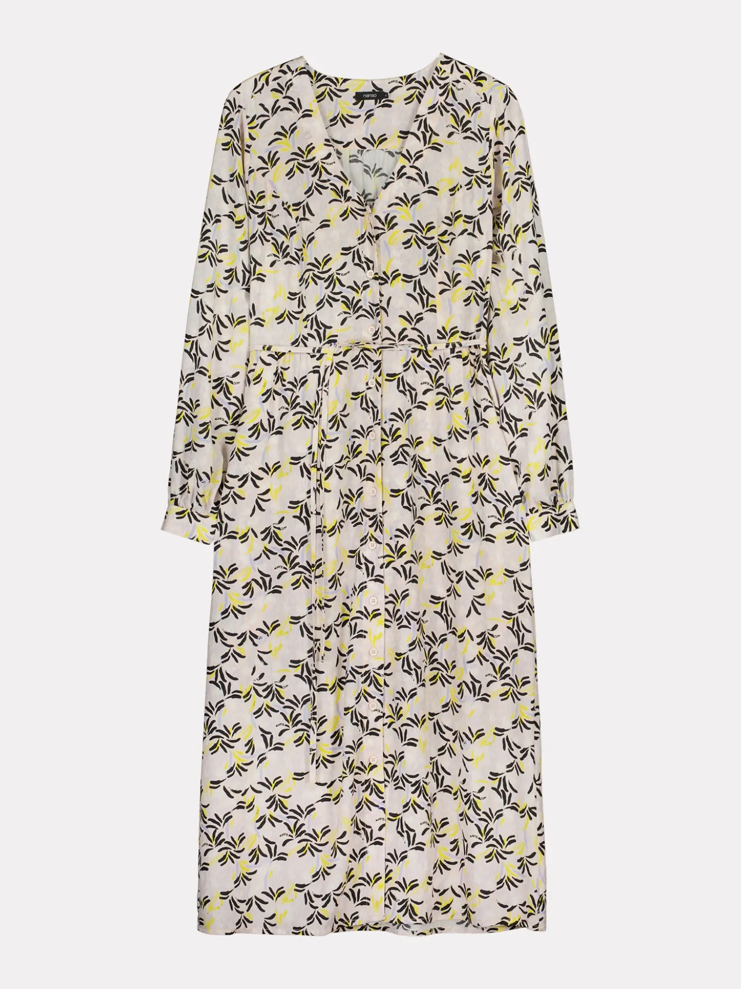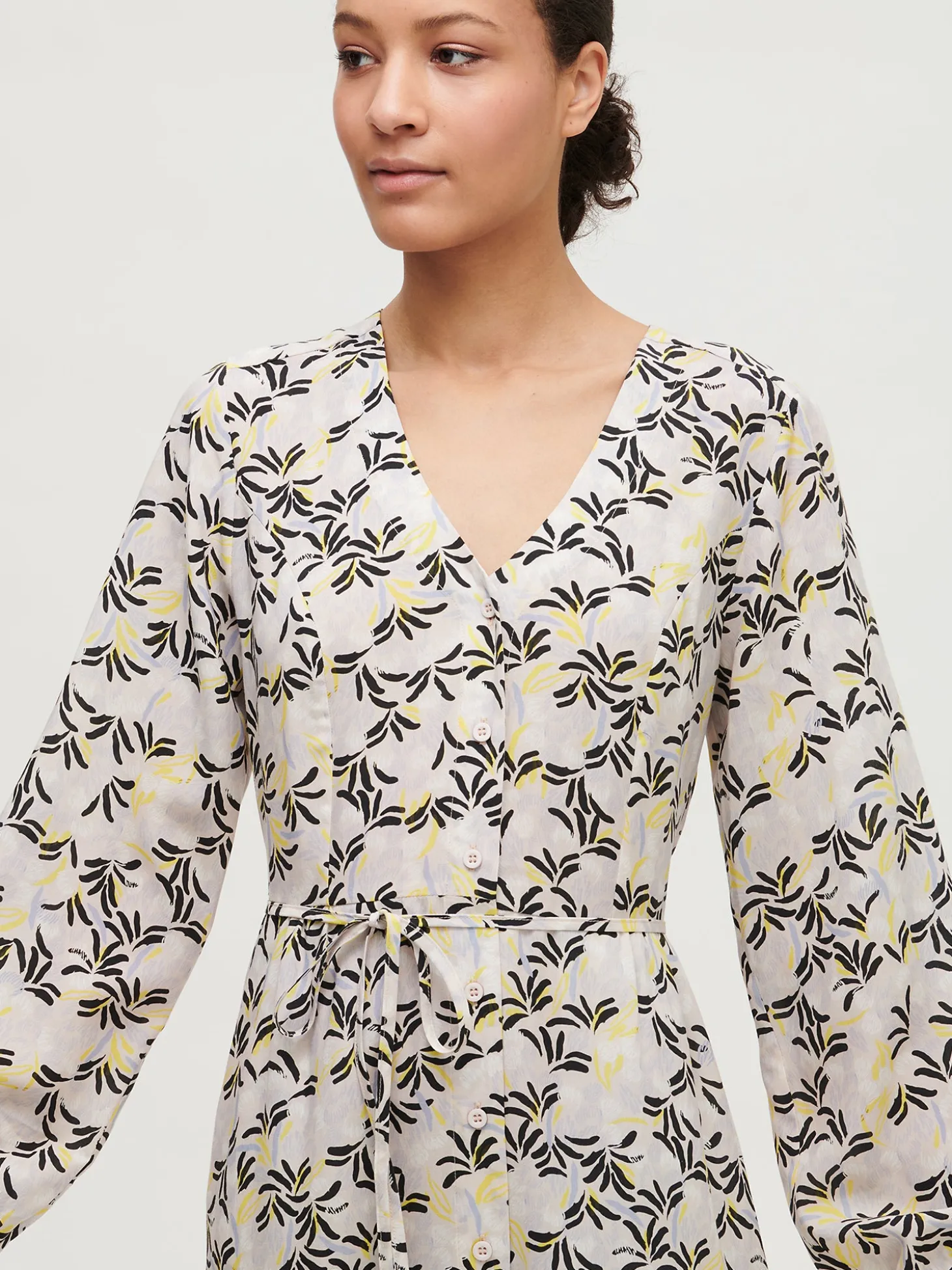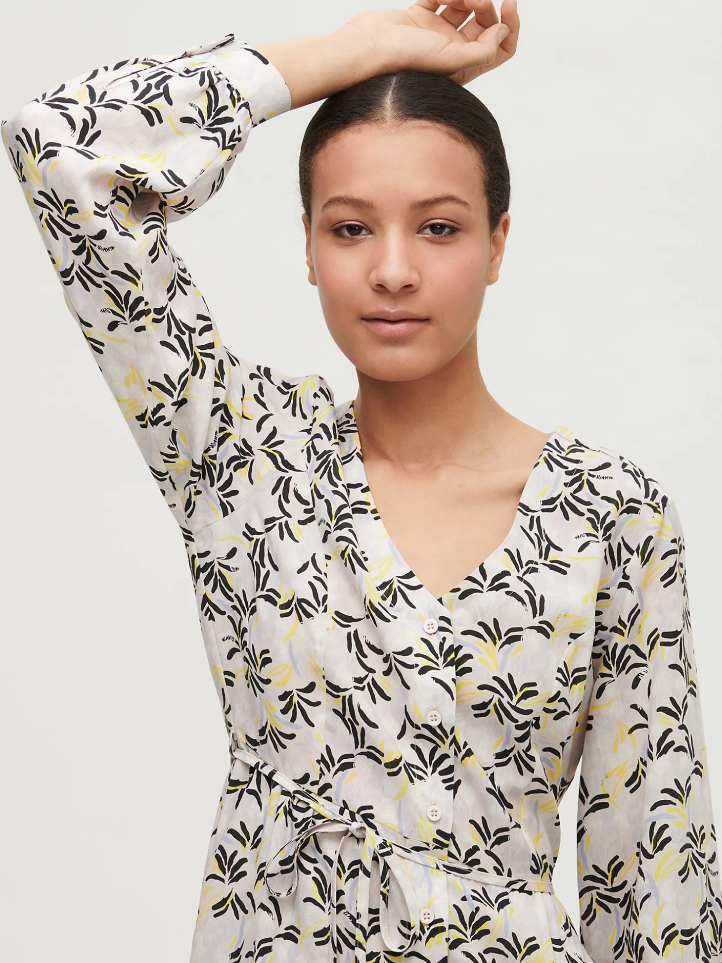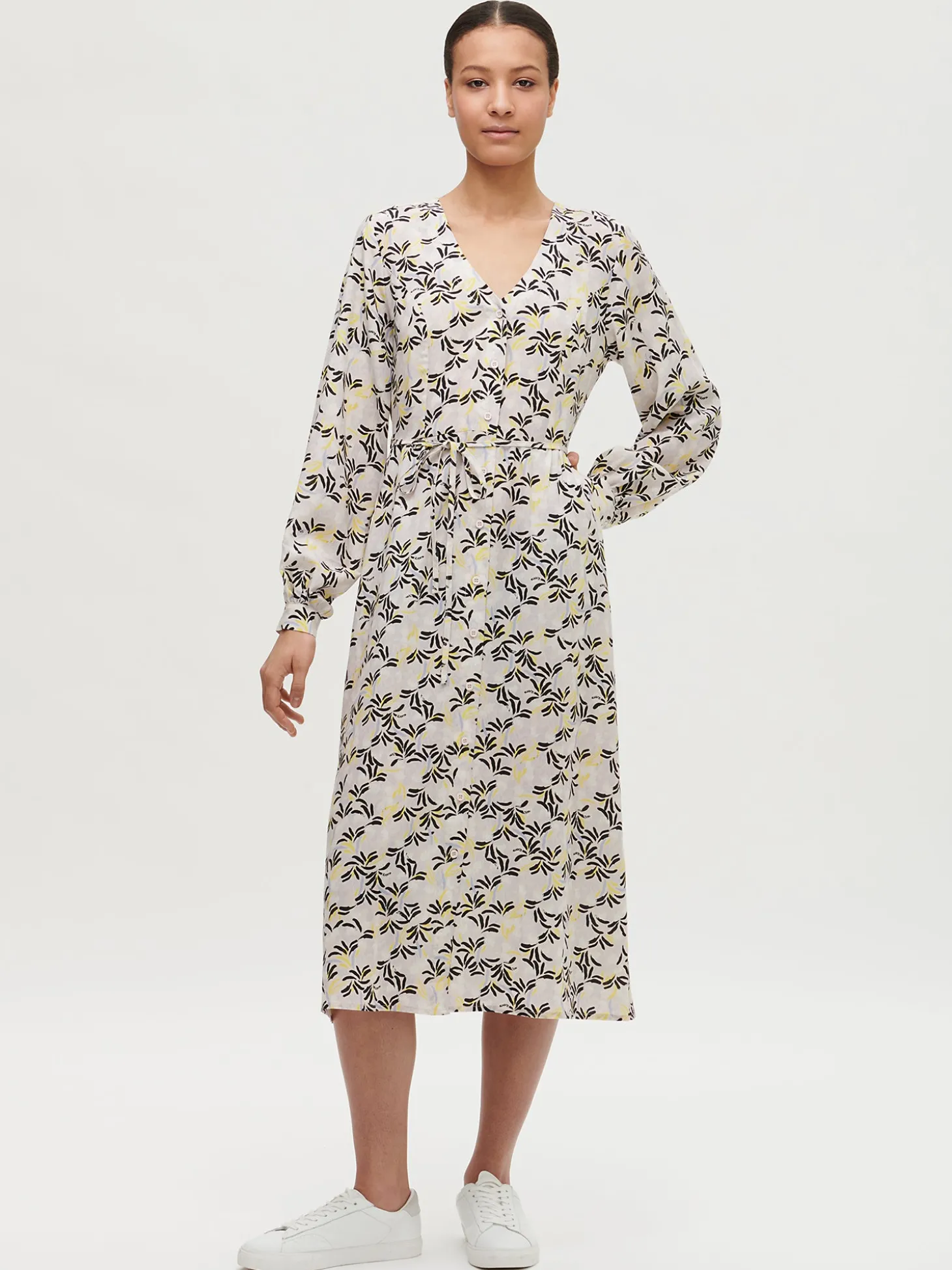 Naisten kuosillinen pitkä Huiskat-mekko. Kuosillisessa mekossa on edessä napitus ja v-pääntie. Mekko on yläosastaan istuva ja siinä on täyspitkät hihat, jotka poimuttuvat kauniisti hihansuun kaitaleen yläpuolelta. Hihansuissa on nappihalkiot. Mekon vyötäröllä on irroitettava kapea vyö ja sivuissa on taskut. Mekon kaarrokkeen reunassa takana sekä vyötäröllä on poimutusta. Mekon helma on kauniisti kellotettu. Mekon pituus koossa 38 on noin 127 cm. Materiaali on kevyttä ja läpikuultavaa miellyttävän tuntuista kudottua 100% Lyocell (TENCEL™) -kangasta. Materiaalille on ominaista 3-5% kutistuminen ensimmäisessä pesussa.