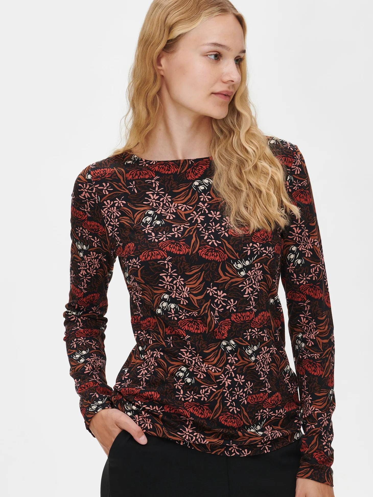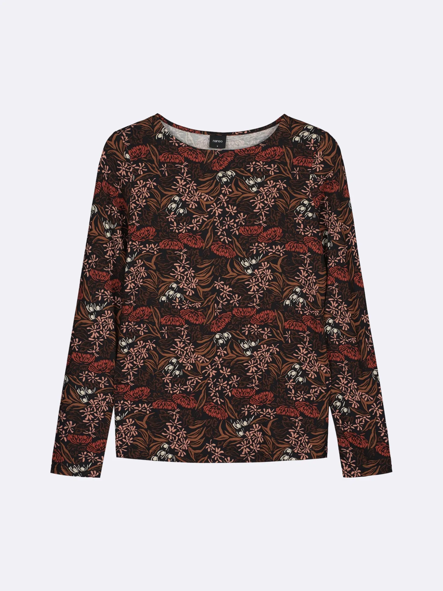 Naisten kuosillinen Jalava-pusero. Istuvassa puserossa on kantilla viimeistelty venepääntie ja täyspitkät hihat. Puseron pituus koossa M on noin 65 cm. Kauniisti laskeutuvan puseron materiaali on laadukasta ja miellyttävän tuntuista viskoosi-elastaani-neulosta. Viskoosineulos on sähköistymätöntä ja helppohoitoista. Tuote on valmistettu LENZING™ ECOVERO™ -viskoosista. Materiaalille on ominaista 3-5% kutistuminen ensimmäisessä pesussa.