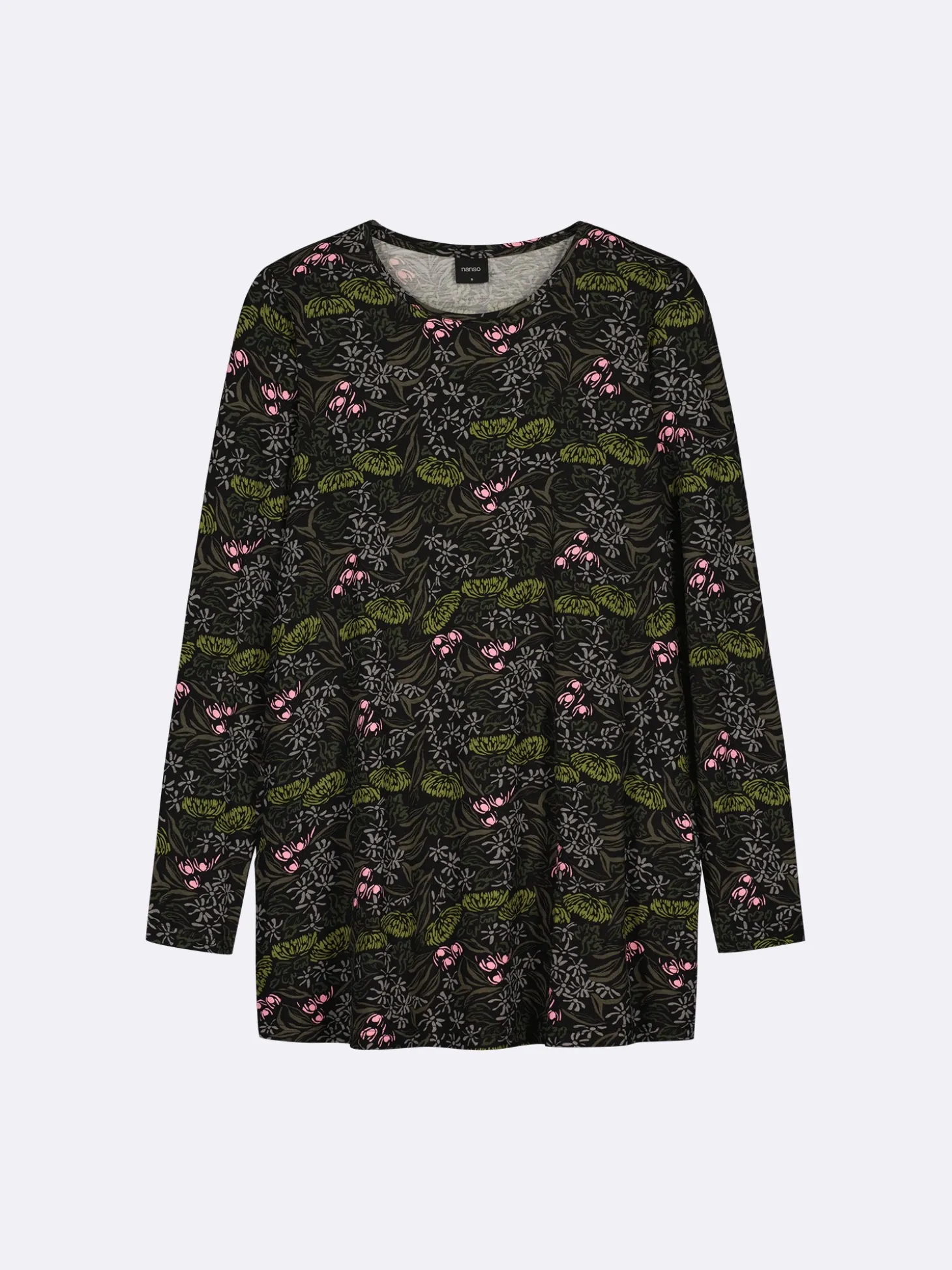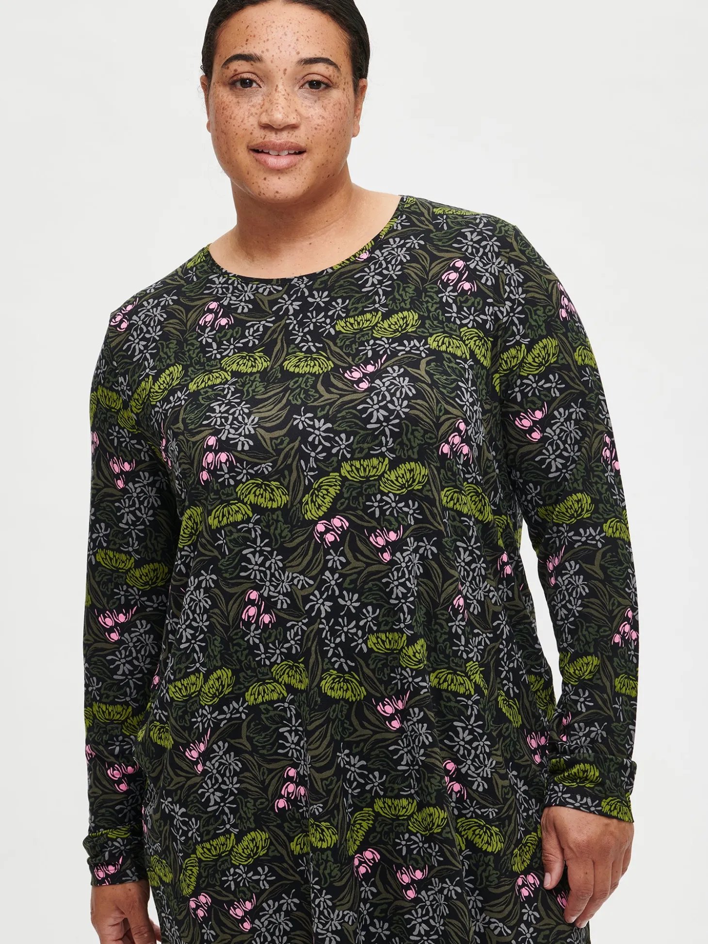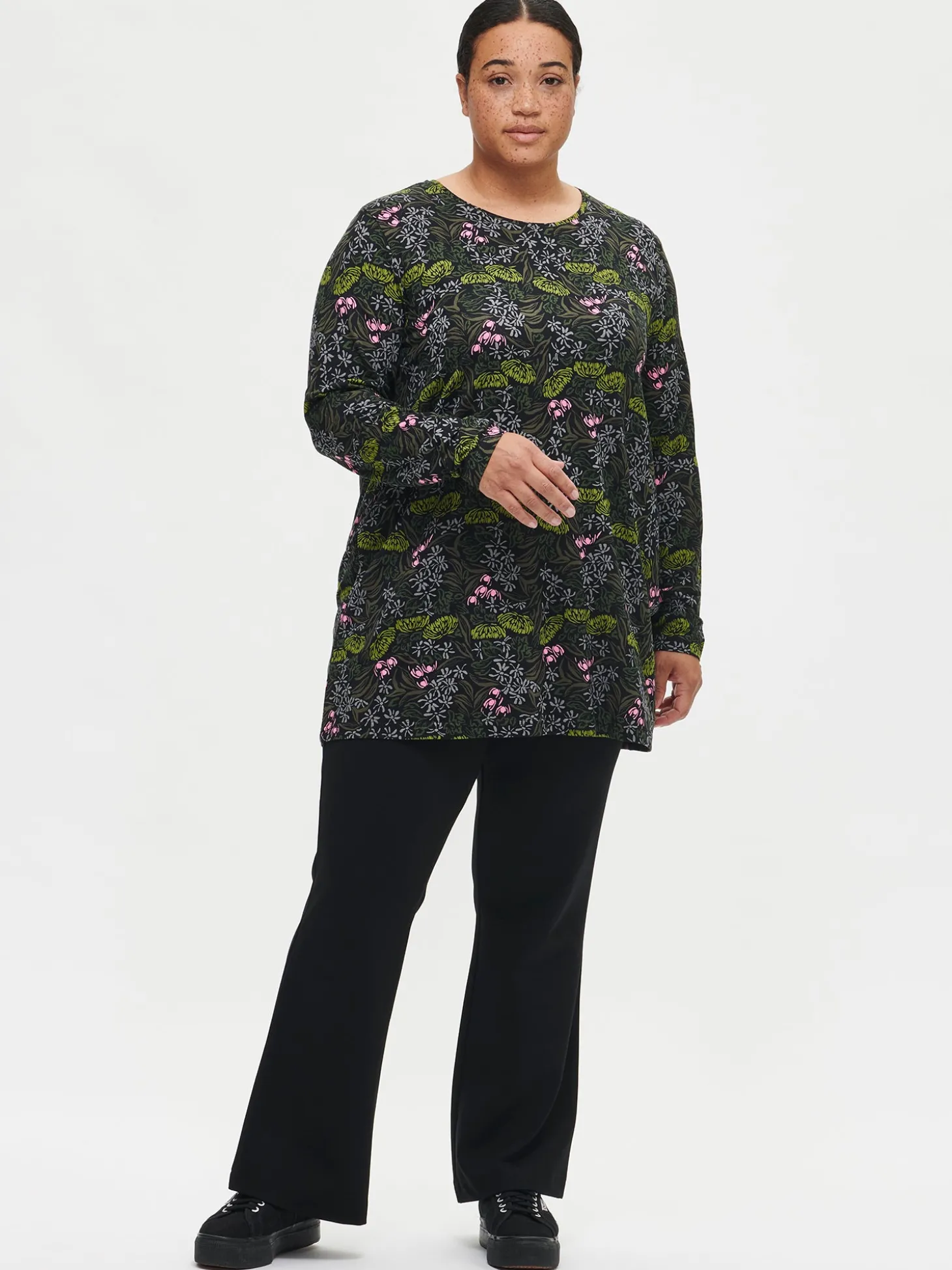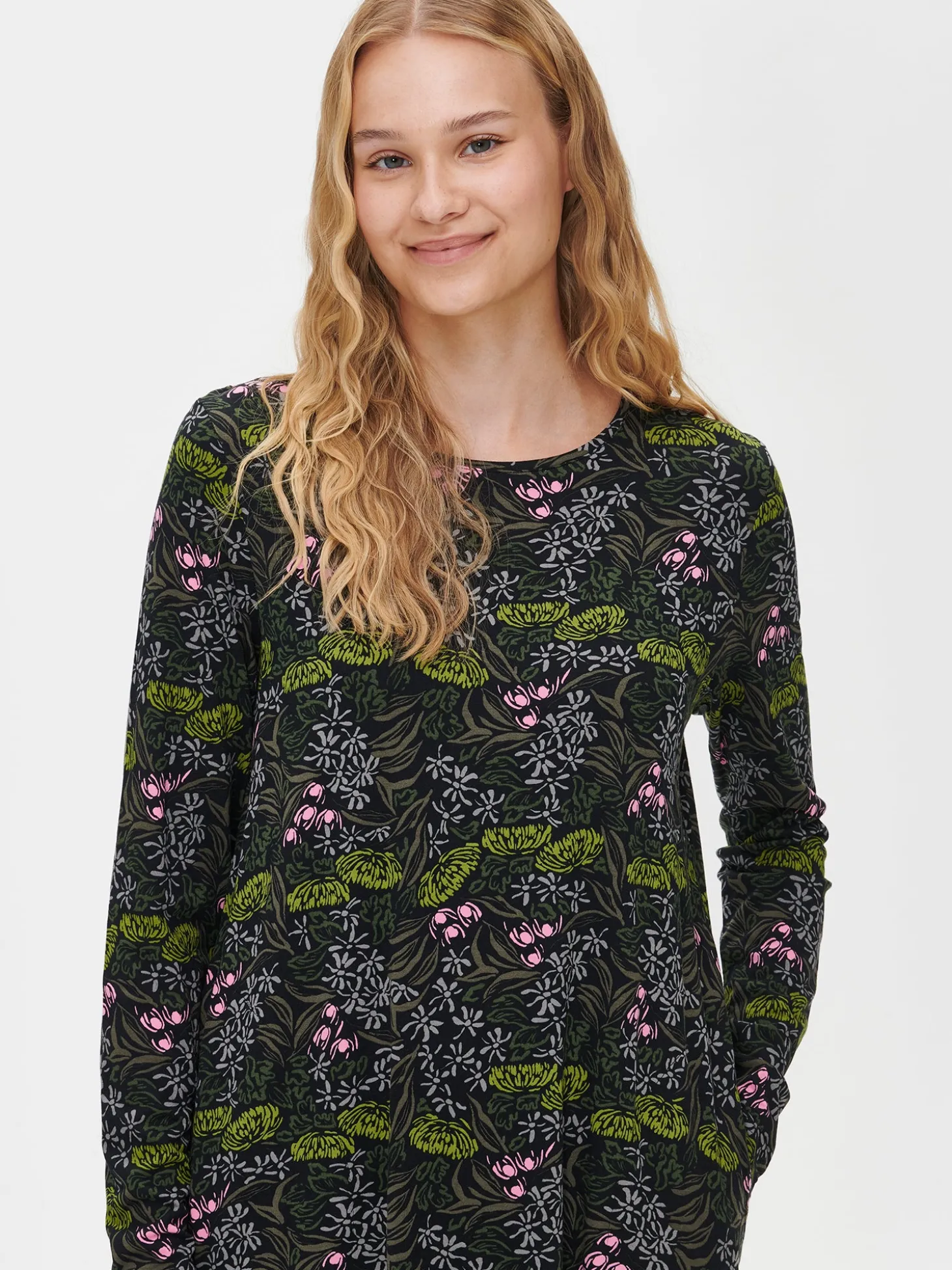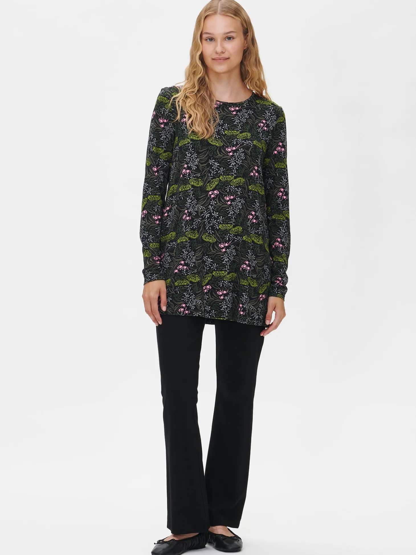 Naisten vihreänsävyinen kuosillinen Jalava-tunika. A-linjaisessa tunikassa on tereellä viimeistelty pyöreä pääntie, täyspitkät hihat ja sivutaskut. Tunikan pituus koossa M on noin 78 cm. Materiaali on laadukasta, miellyttävän tuntuista ja laskeutuvaa viskoosi-elastaani-neulosta, joka pysyy hyvänä pesusta toiseen. Tuote on valmistettu LENZING™ ECOVERO™-viskoosista. Materiaalille on ominaista 3-5% kutistuminen ensimmäisessä pesussa.