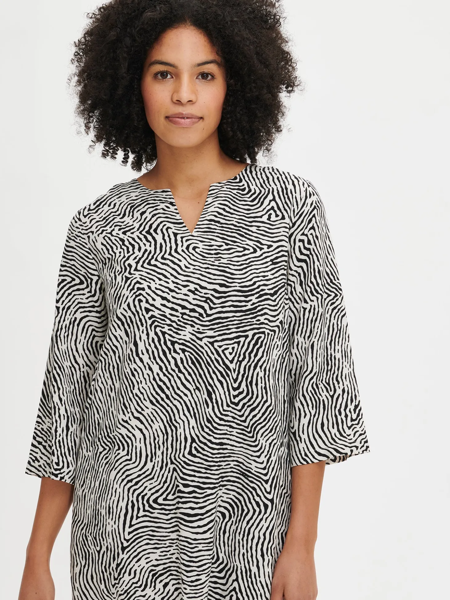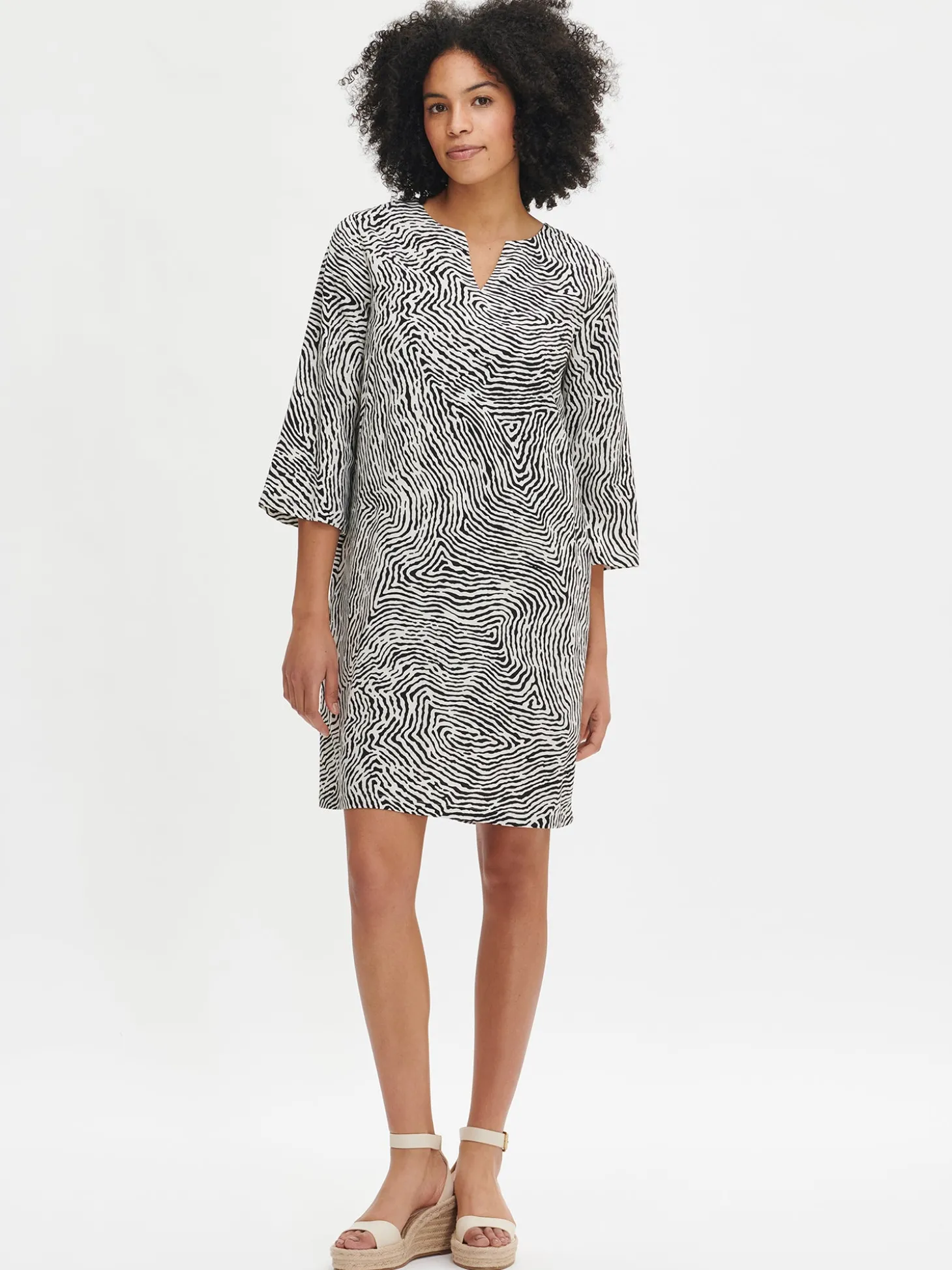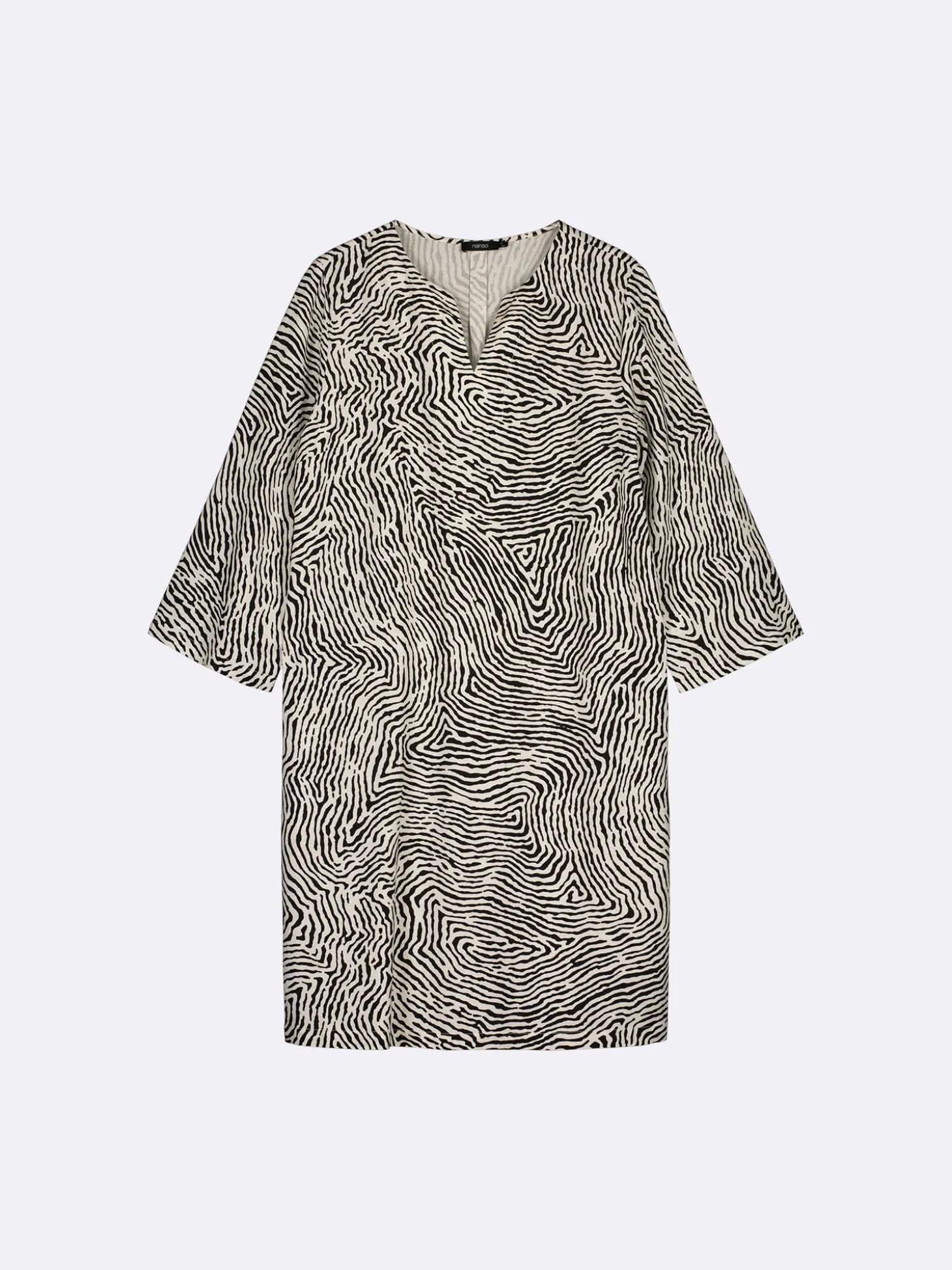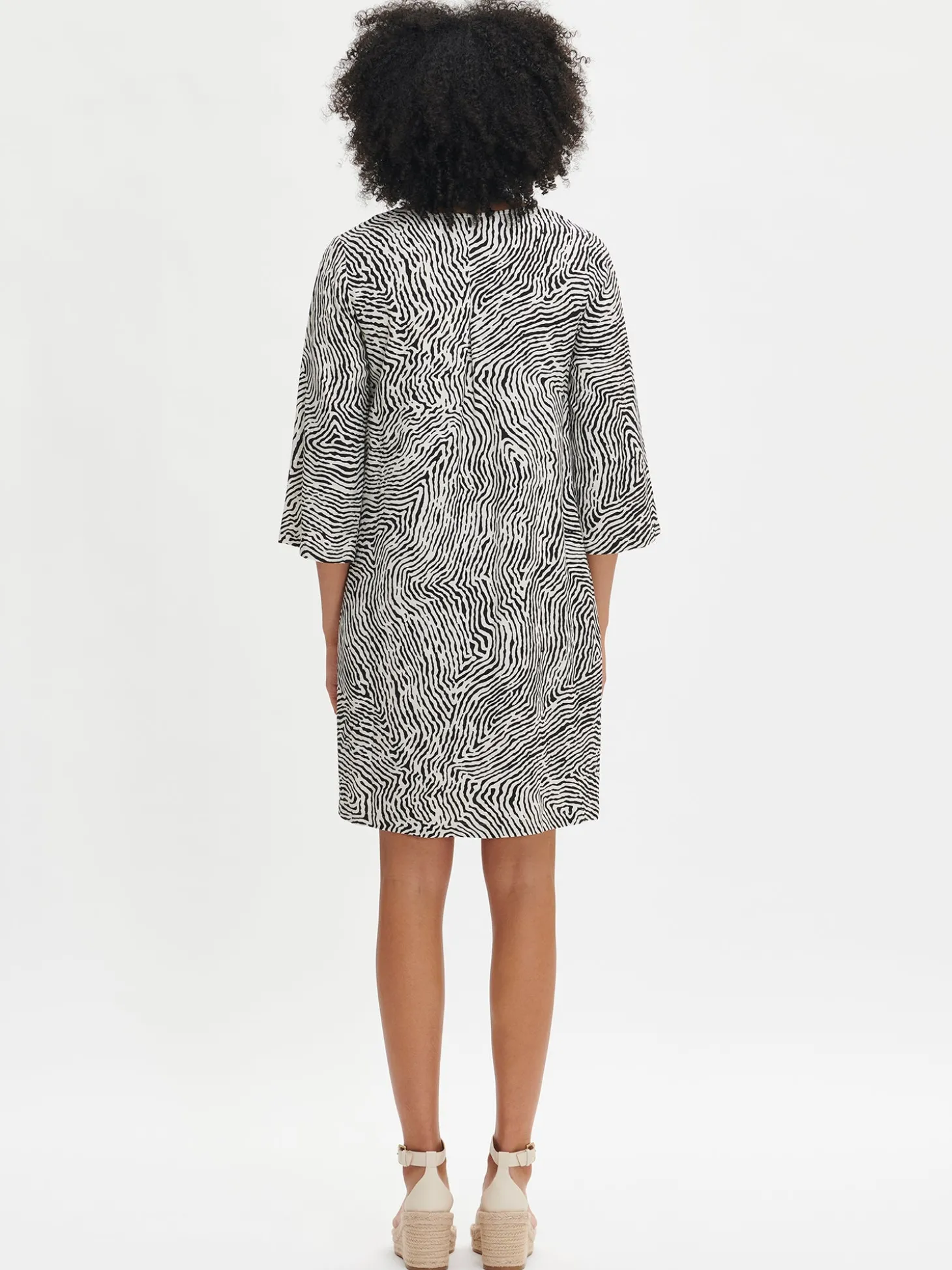 Naisten lyhyt kuosillinen musta-luonnonvalkoinen Jälki-mekko. A-linjaisessa mekossa on pyöreä pääntie, jonka edessä on halkio. Mekon 3/4 pituiset hihat levenevät hieman hihansuita kohti. Mekossa on sivutaskut. Mekon pituus koossa 38 on noin 98 cm. Tuote on valmistettu kevyestä viskoosi-pellavasekoitteesta. Materiaalille on ominaista 3-5% kutistuminen ensimmäisessä pesussa.