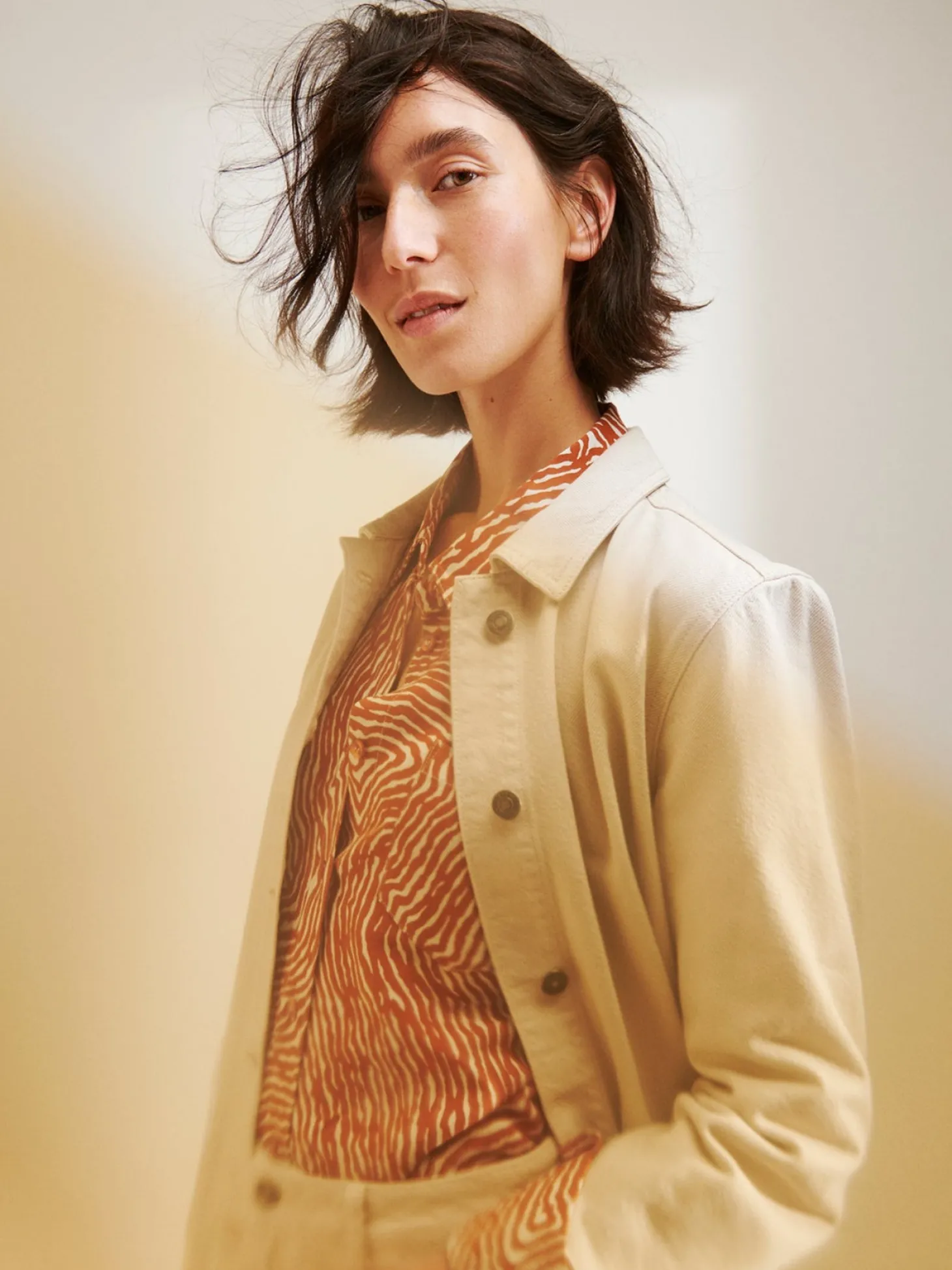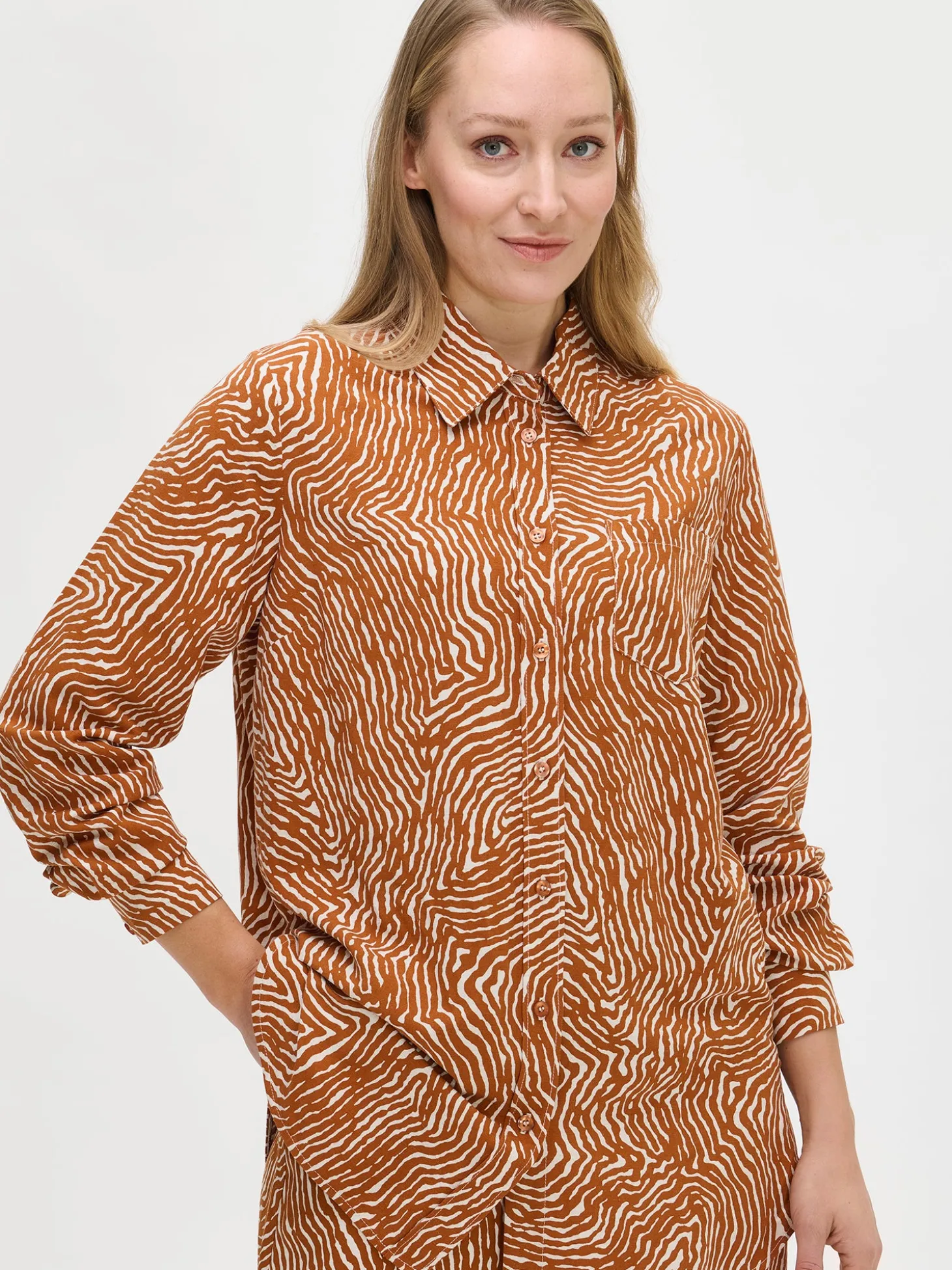 Naisten väljä pitkähihainen ruskea Jälki-paitapusero. Kauniissa kuosillisessa puserossa on klassinen kaulusmalli, napitus edessä, pyöristetty helma ja rintatasku edessä. Puserossa on täyspitkät hihat ja hihansuissa laskokset nappikalvosimien yläpuolella. Puseron pituus koossa 38 on noin 80 cm. Tuote on valmistettu kevyestä viskoosi-pellavasekoitteesta. Materiaalille on ominaista 3-5 % kutistuminen ensimmäisessä pesussa.
