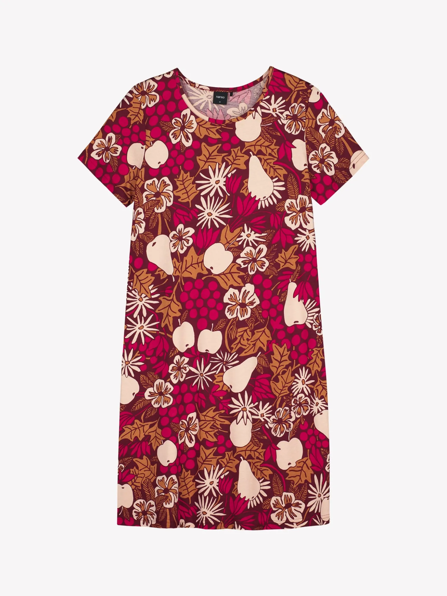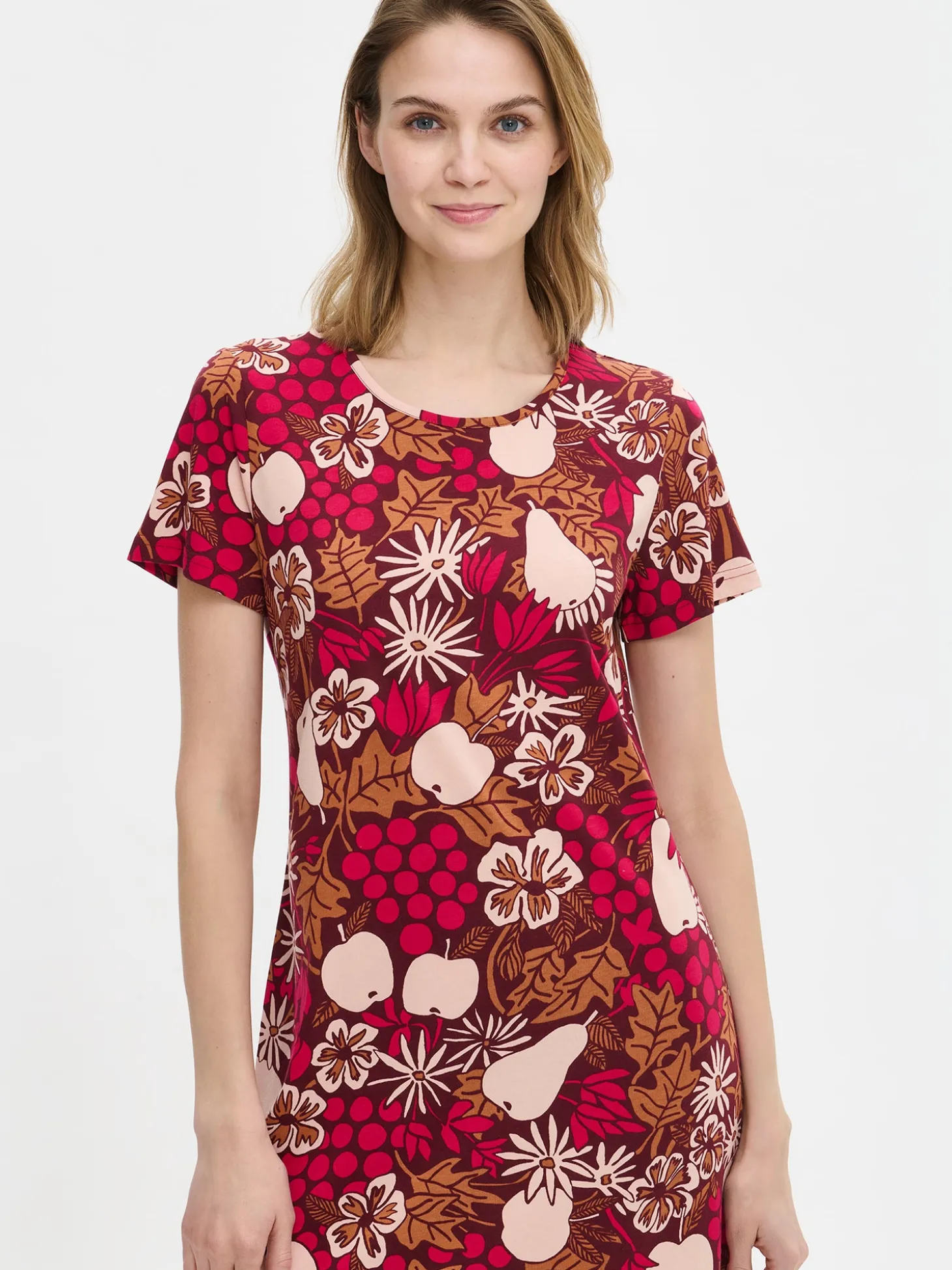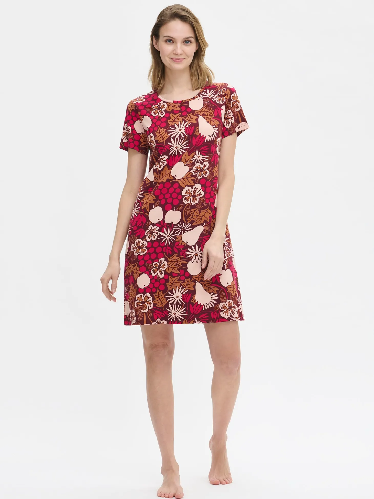 Naisten kuosillinen Juhla-yöpaita lyhyillä hihoilla ja pyöreällä pääntiellä. Yöpaidan pituus koossa M on noin 95 cm. Materiaali on laadukasta, iholla miellyttävän pehmeältä tuntuvaa ja helppohoitoista puuvilla-modaalia, joka pysyy hyvänä pesusta toiseen.