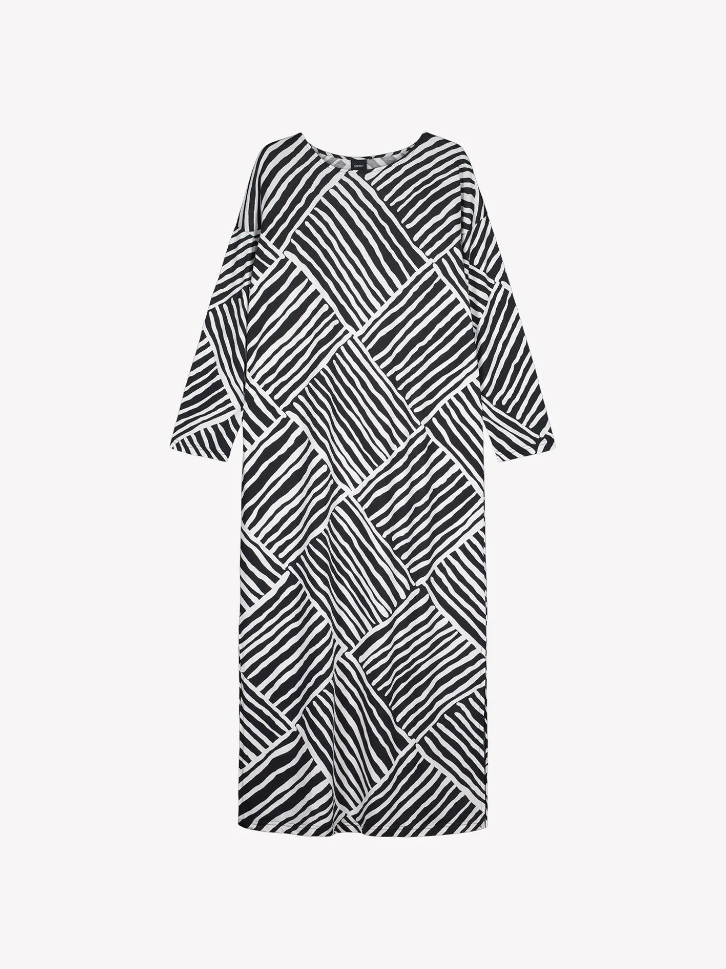 Naisten kuosillinen Kaisli-kaftaani ovaalilla pääntiellä. Kaftaanissa on pudotettu olka, täyspitkät hihat ja sivuhalkiot. Kaftaanin pituus koossa M on noin 130 cm. Materiaali on laadukasta, iholla miellyttävän pehmeältä tuntuvaa ja helppohoitoista puuvilla-modaalia, joka pysyy hyvänä pesusta toiseen.