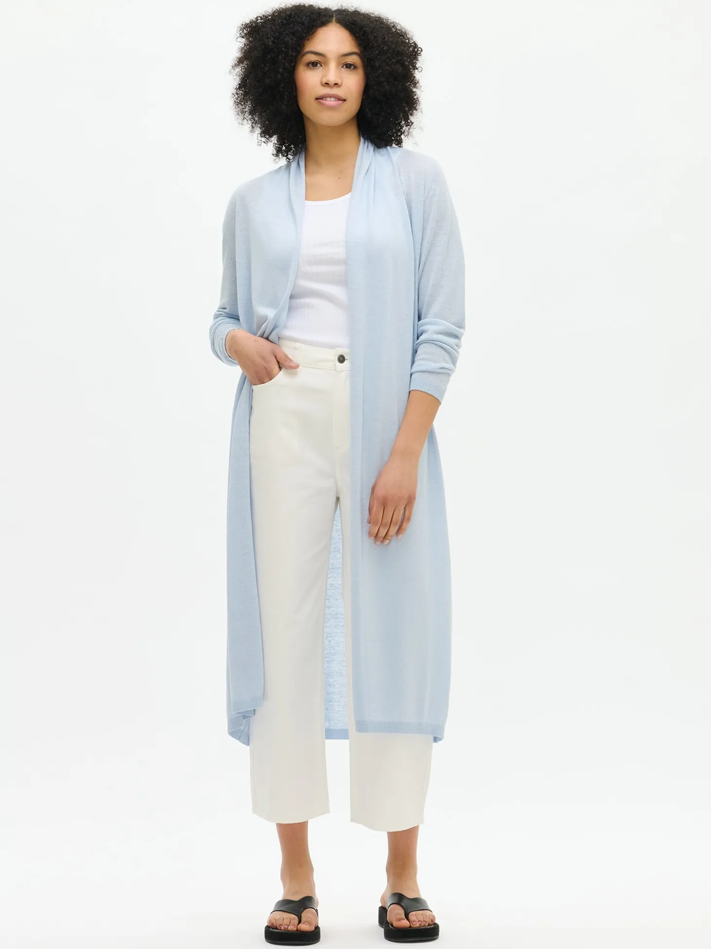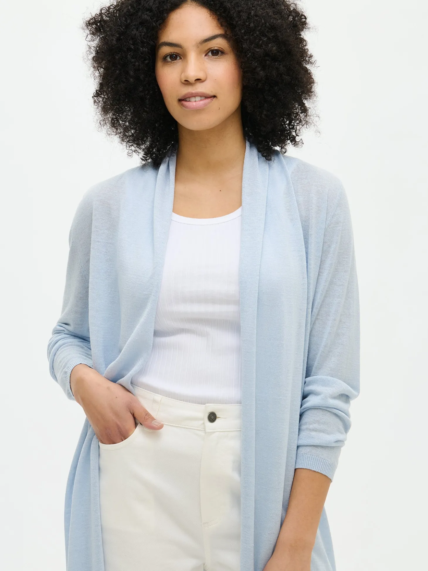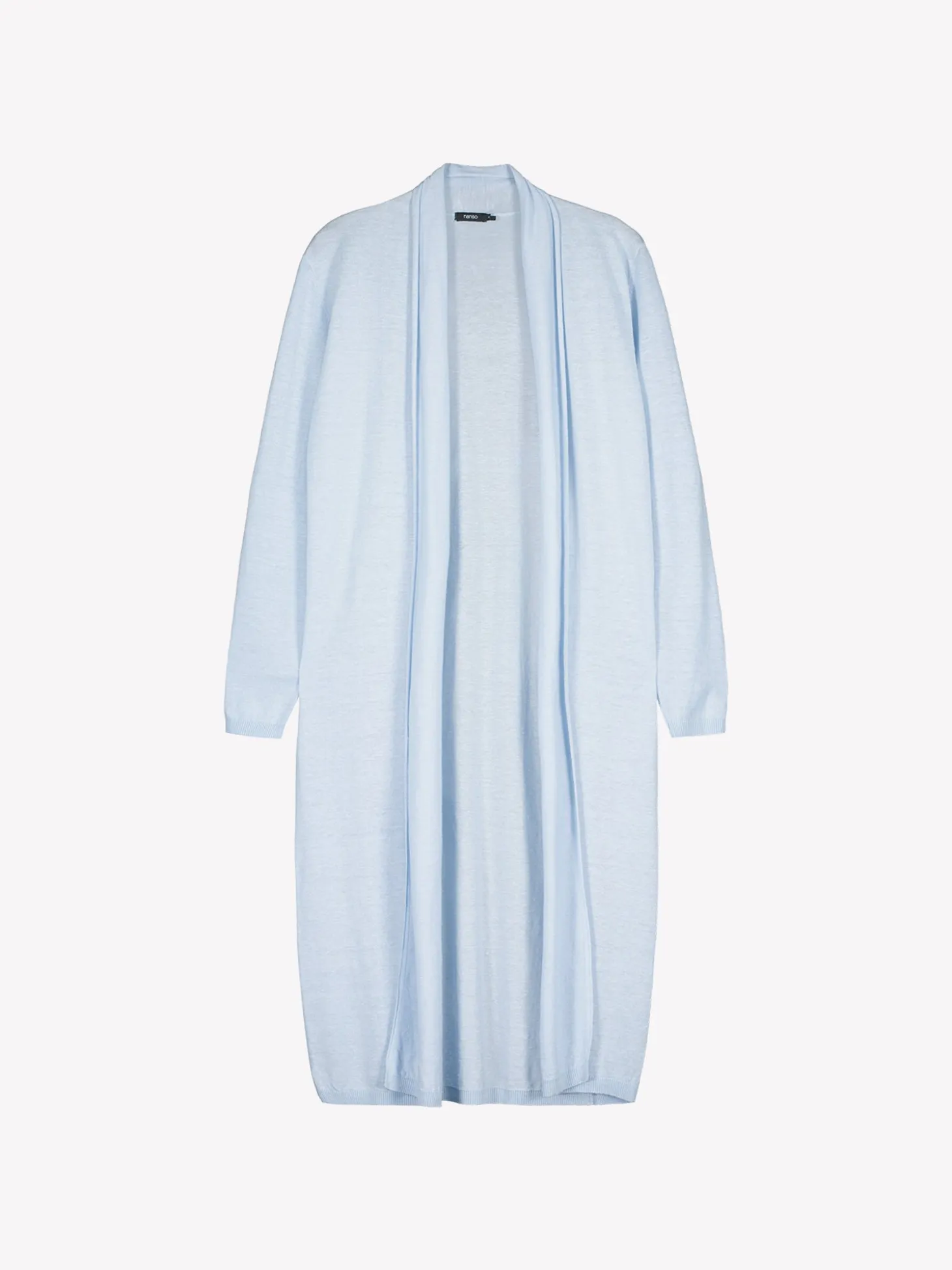 Naisten pitkä, vaaleansininen Karina-neuletakki. Tyylikäs ja mukava neuletakki on muotoonneulottu laadukkaasta pellavan ja viskoosin sekoitteesta. Ohut neuletakki on ihana kevään lämpenevään säähän. Neuletakissa on klassinen shaalikaulus ja täyspitkät hihat. Neuletakin pituus koossa M on noin 110 cm.