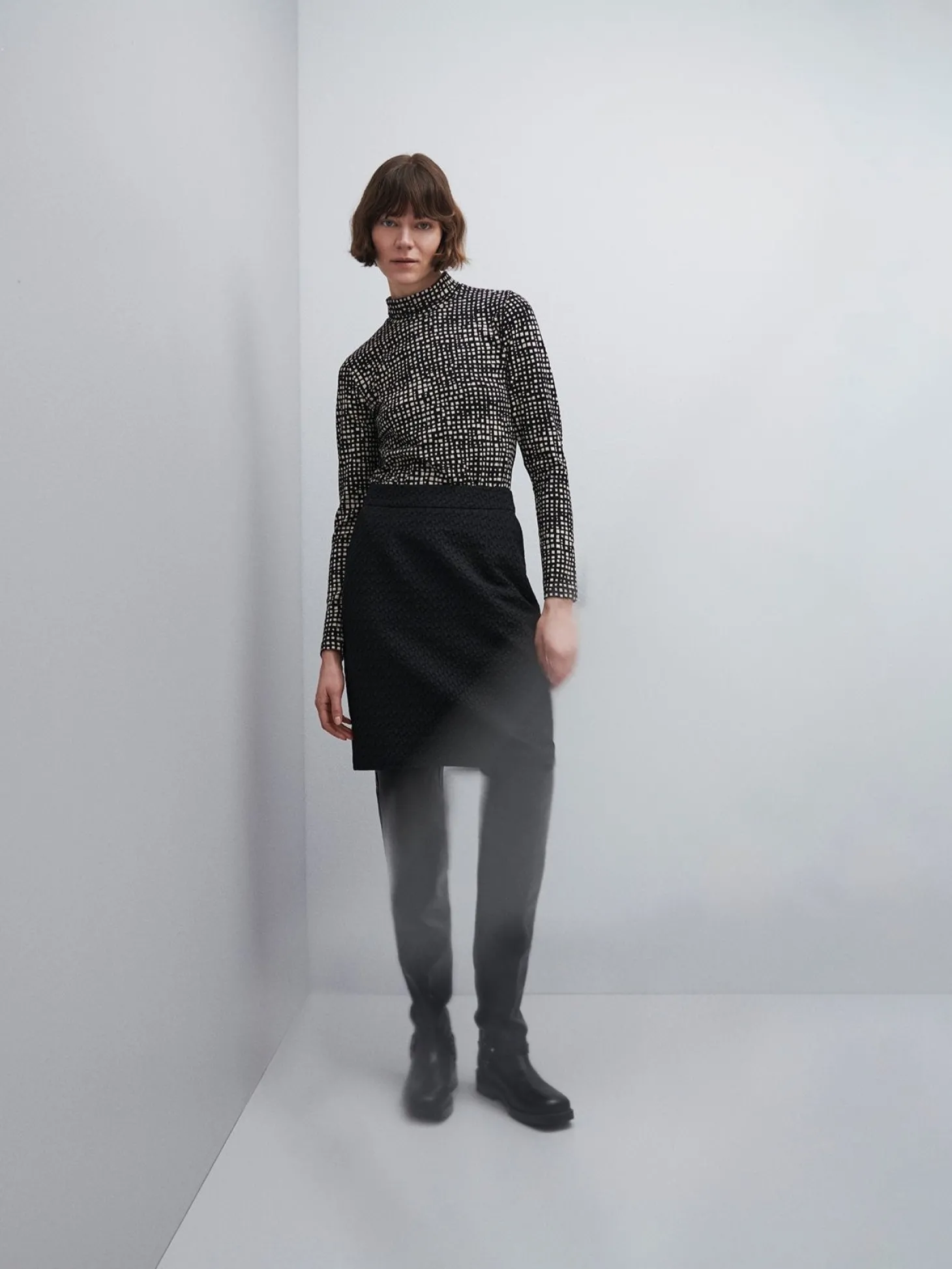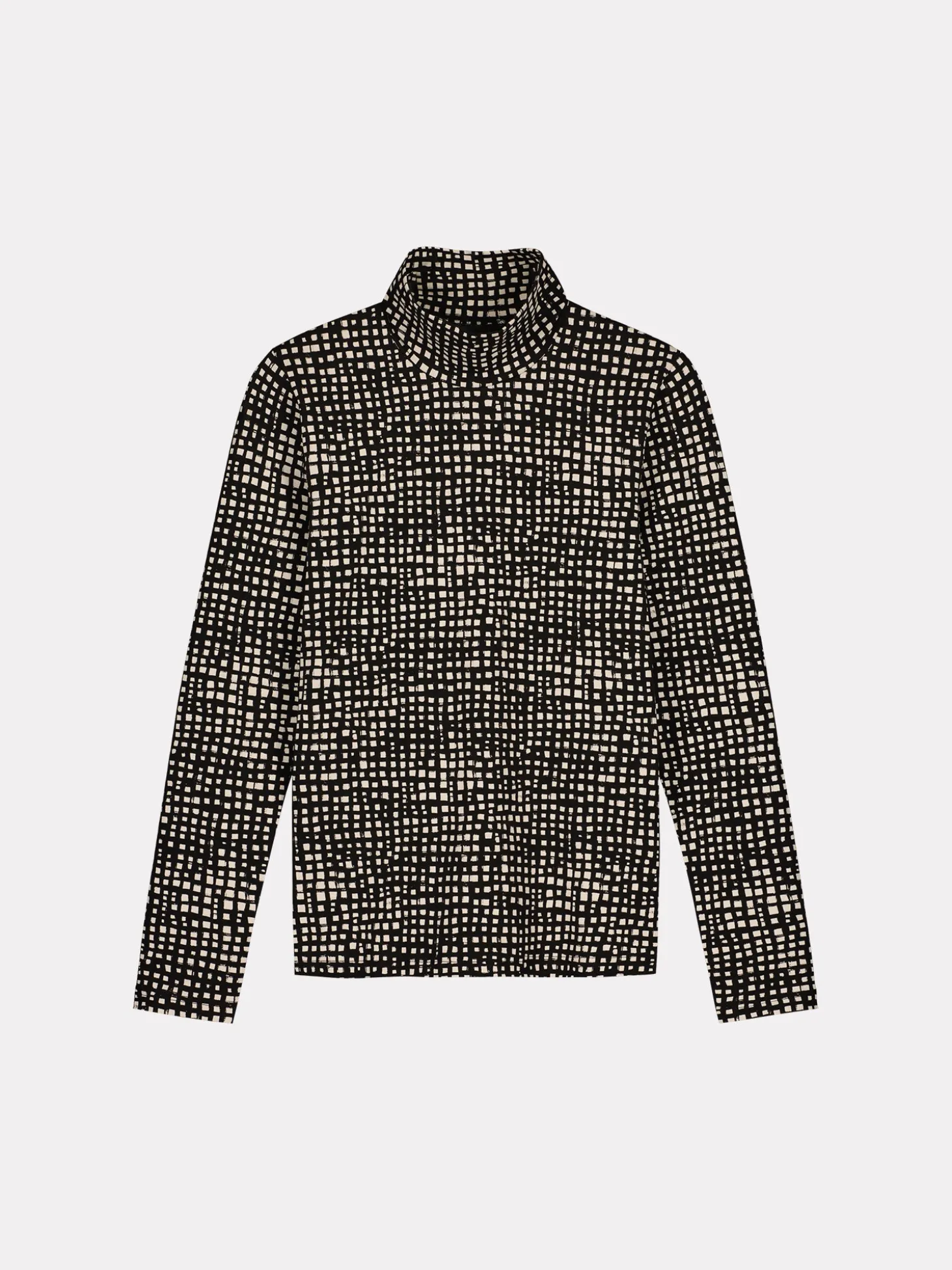 Naisten kuosillinen mustavalkoinen Karmi-poolopusero. Kuosillinen poolo on näyttävä klassikko, johon haluaa pukeutua vuodesta toiseen. Monikäyttöisen poolon voi pukea myös lyhythihaisen mekon tai paidan alle. Istuvassa matalakauluksellisessa poolopuserossa on täyspitkät hihat. Puseron pituus koossa M on noin 65 cm. Materiaali on miellyttävää ja joustavaa puuvilla-elastaani-neulosta.