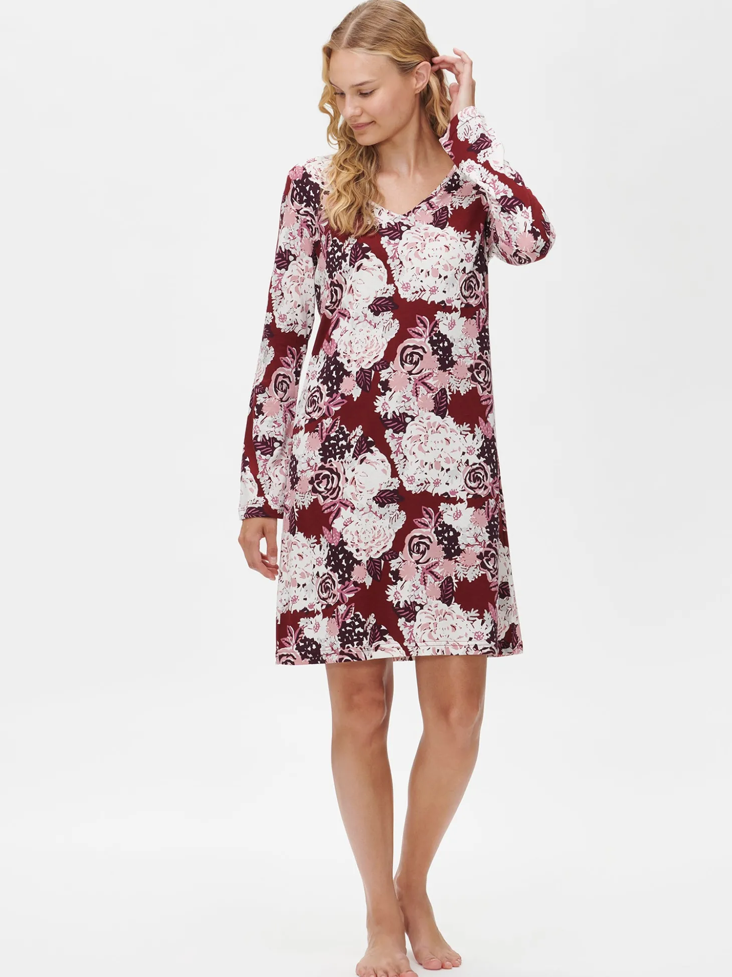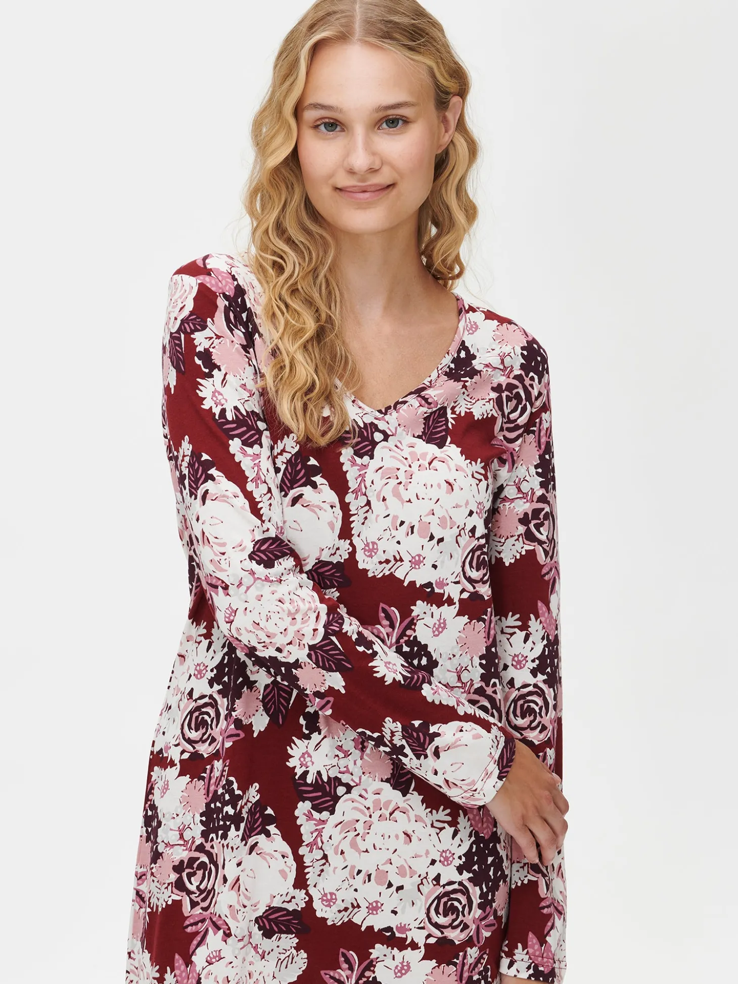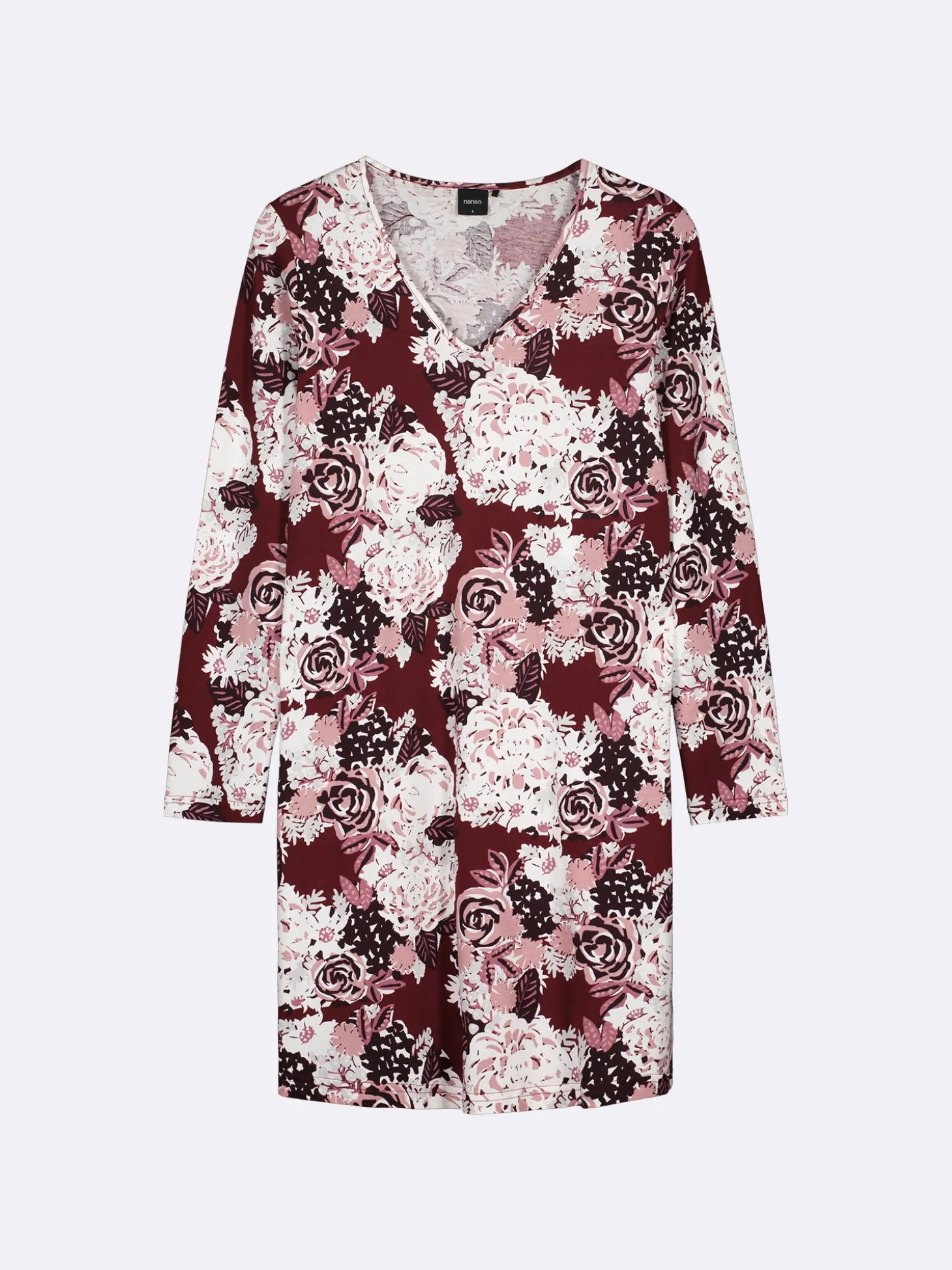 Naisten kuosillinen Kranssi-yöpaita pitkillä hihoilla ja V-pääntiellä. Yöpaidan pituus koossa M on noin 95 cm. Materiaali on laadukasta, iholla miellyttävän pehmeältä tuntuvaa ja helppohoitoista puuvilla-modaalia, joka pysyy hyvänä pesusta toiseen.