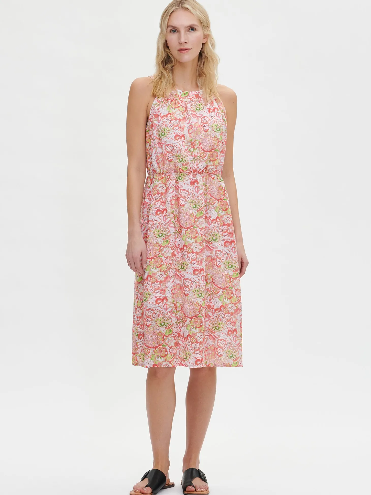 Naisten ihastuttava monivärinen Kreeta-mekko. Kauniissa mekossa on pyöreä pääntie, jonka edessä on poimutusta ja takana rusettihalkio. Hihattoman mekon vyötäröllä on kuminauha ja sivuissa on taskut. Mekon helma kellottuu kauniisti. Mekko on vuoritettu yläosasta polven korkeudelle. Mekon pituus koossa 38 on noin 110 cm. Materiaali on kevyttä ja läpikuultavaa miellyttävän tuntuista LYOCELL TENCEL™ -kangasta. Materiaalille on ominaista 3-5% kutistuminen ensimmäisessä pesussa.