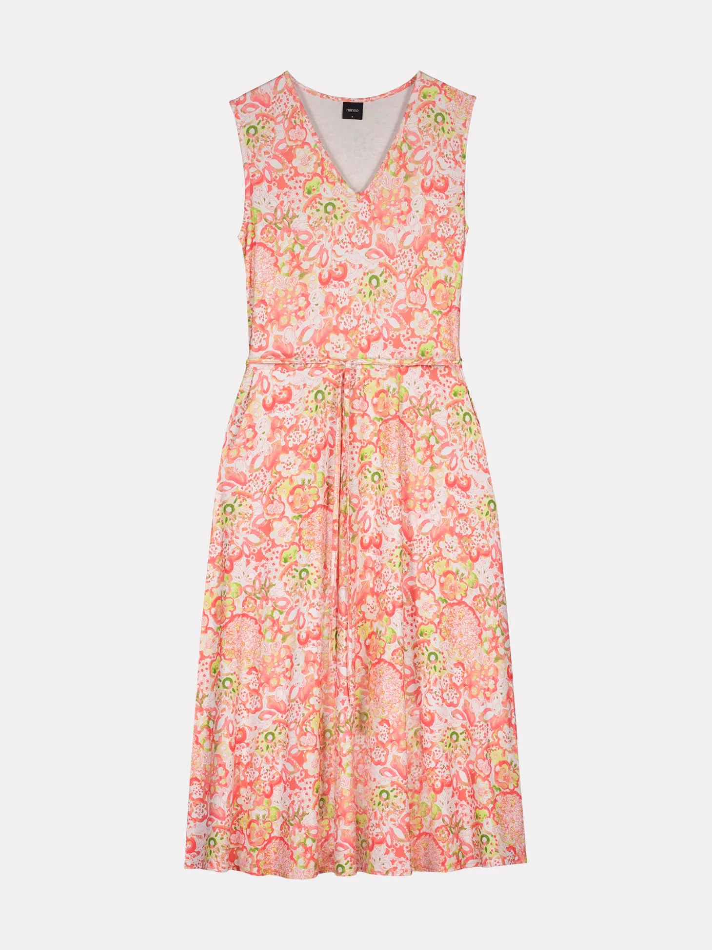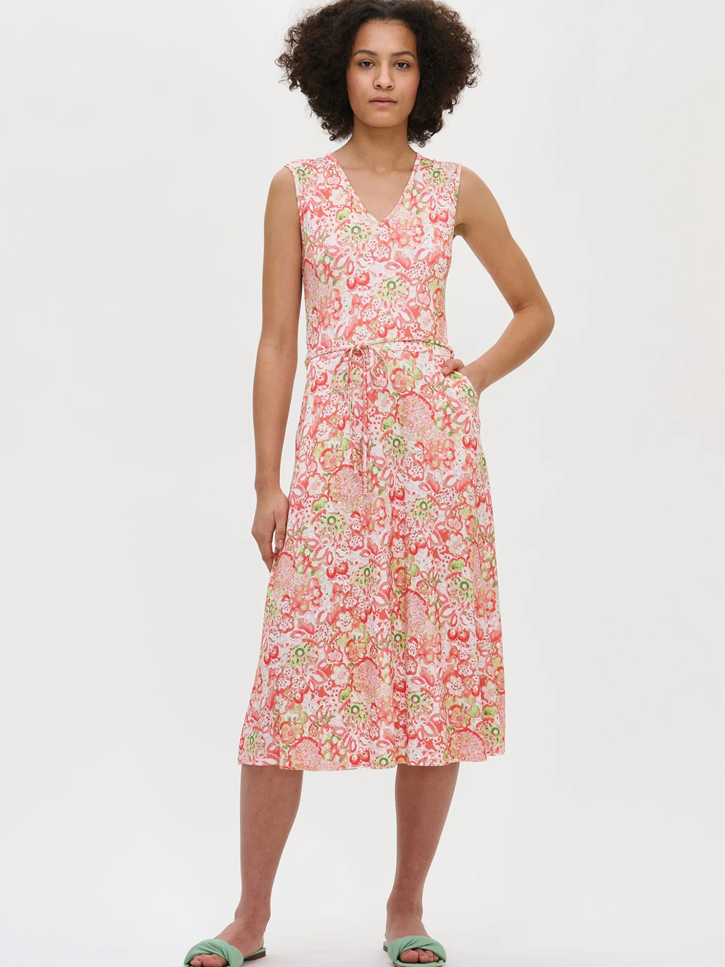 Naisten kuosillinen midimittainen Kreeta-trikoomekko. Istuvassa mekossa on kaunis v-pääntie ja kapea irrotettava vyö. Rento mekko on mukava päällä niin arjessa kuin juhlassakin. Mekon pituus koossa M on noin 115 cm. Materiaali on laadukasta ja miellyttävän tuntuista, ohutta viskoosi-elastaani-neulosta. Viskoosineulos on sähköistymätöntä ja helppohoitoista. Tuote on valmistettu LENZING™ ECOVERO™ -viskoosista. Materiaalille on ominaista 3-5% kutistuminen ensimmäisessä pesussa.