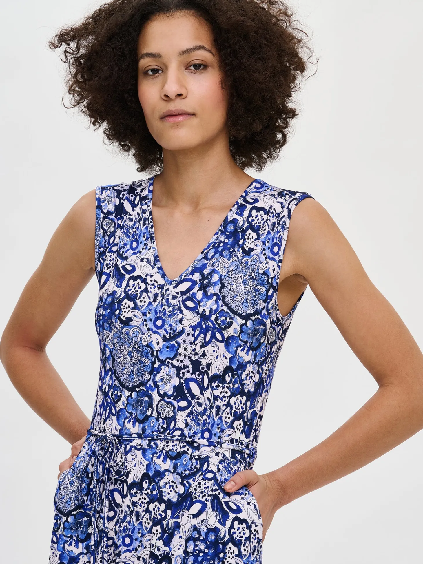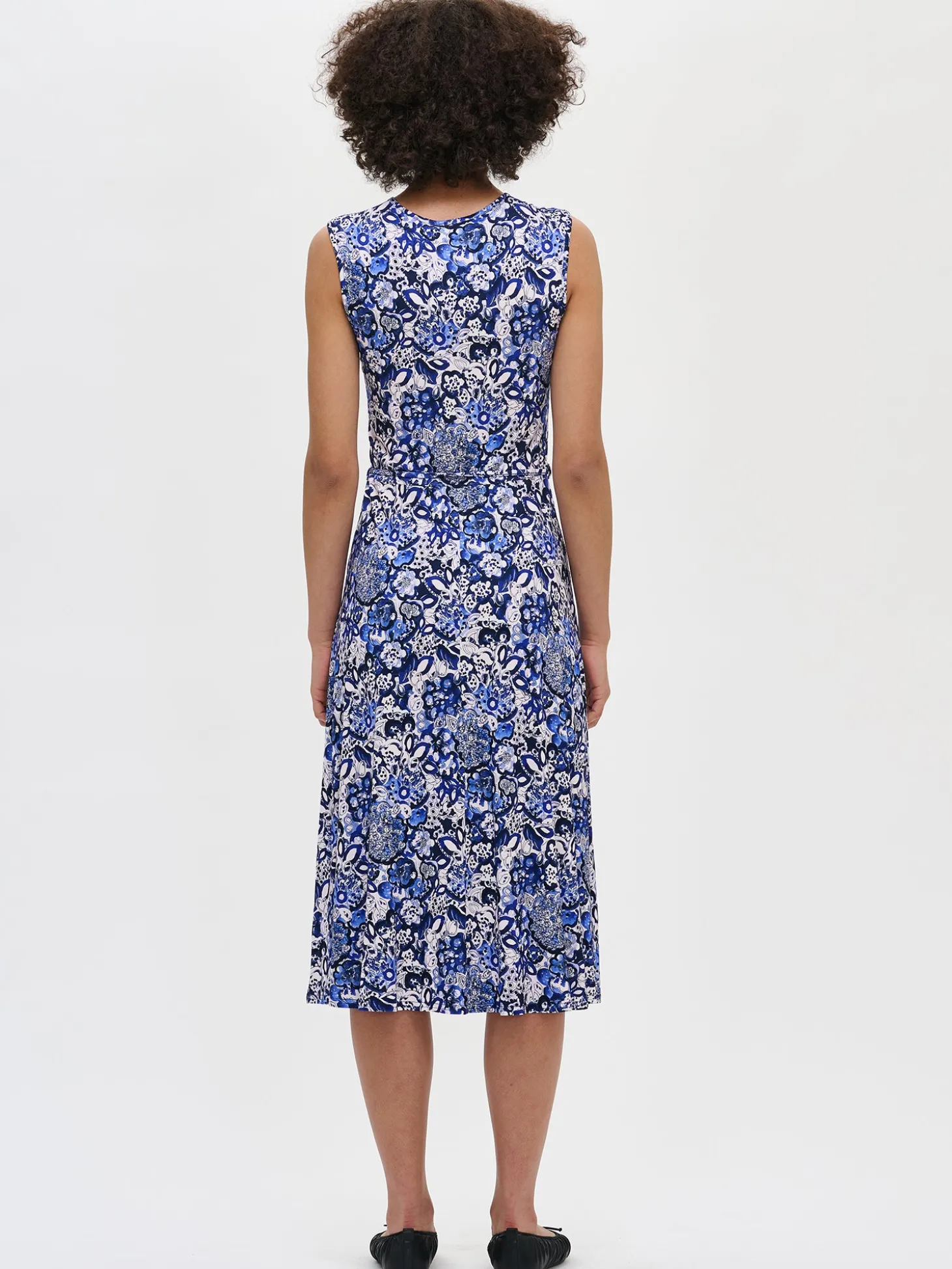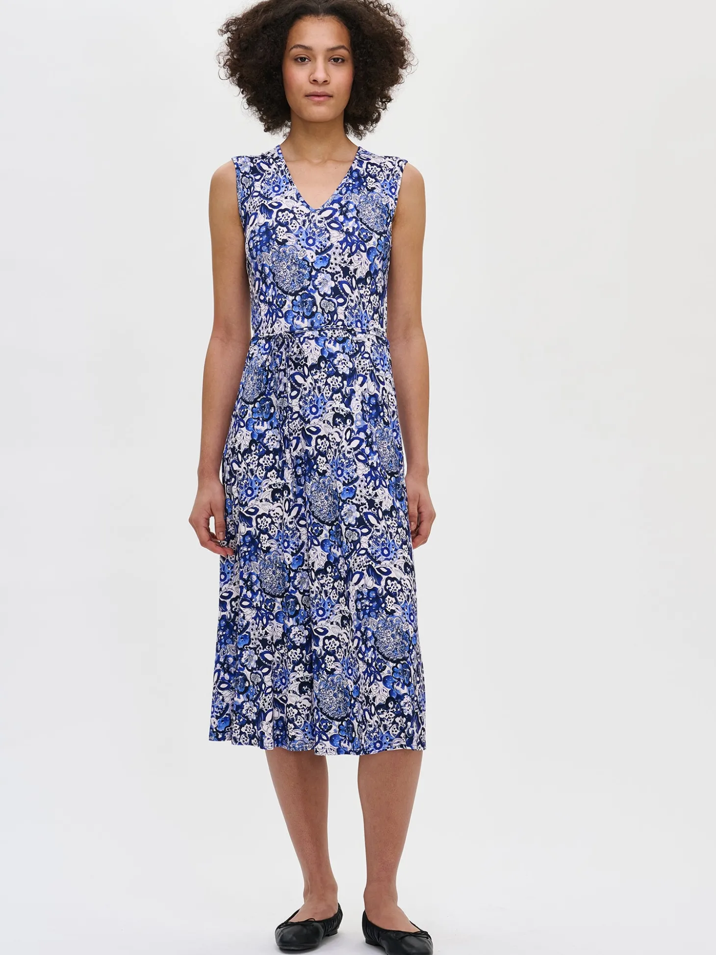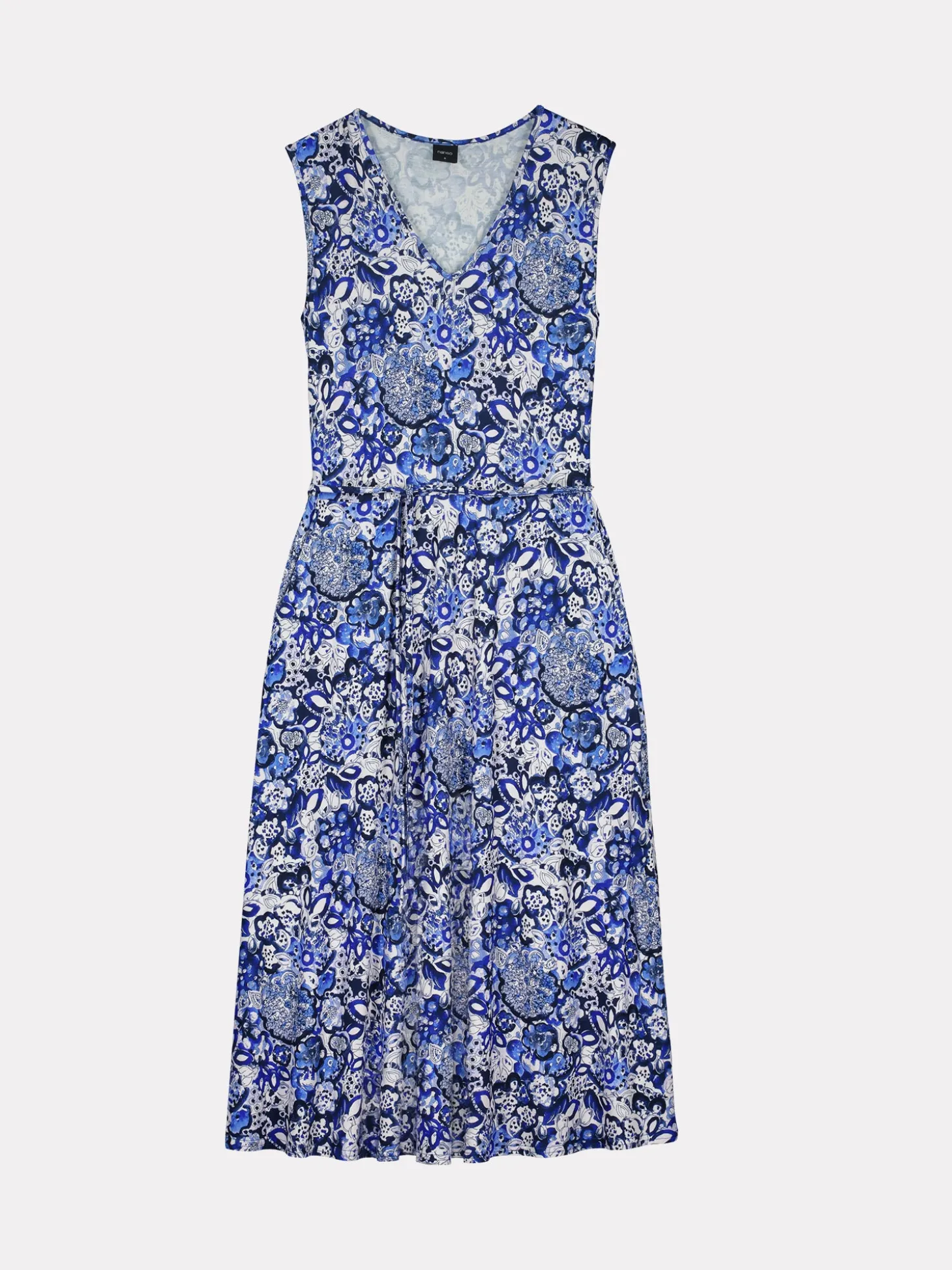 Naisten kuosillinen sininen midimittainen Kreeta-trikoomekko. Istuvassa mekossa on kaunis v-pääntie ja kapea irrotettava vyö. Rento mekko on mukava päällä niin arjessa kuin juhlassakin. Mekon pituus koossa M on noin 115 cm. Materiaali on laadukasta ja miellyttävän tuntuista, ohutta viskoosi-elastaani-neulosta. Viskoosineulos on sähköistymätöntä ja helppohoitoista. Tuote on valmistettu LENZING™ ECOVERO™ -viskoosista. Materiaalille on ominaista 3-5% kutistuminen ensimmäisessä pesussa.
