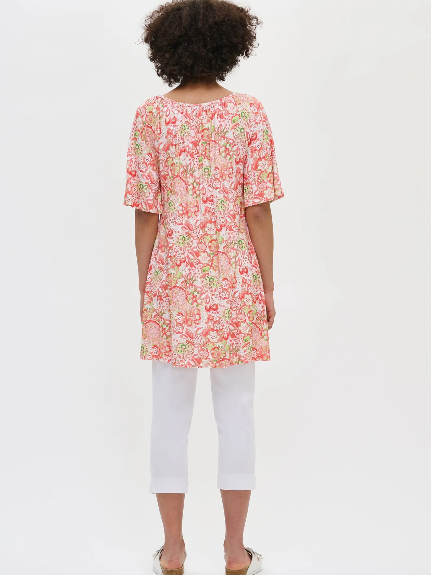Naisten kuosillinen Kreeta-tunika. Tunikassa on kantilla poimutettu pyöreä pääntie, sivuissa taskut ja 2/4 pituiset kellotetut hihat. Tunikan pituus koossa M on noin 85 cm. Materiaali on laadukasta ja miellyttävän tuntuista, ohutta viskoosi-elastaani-neulosta. Viskoosineulos on sähköistymätöntä ja helppohoitoista. Tuote on valmistettu LENZING™ ECOVERO™ -viskoosista. Materiaalille on ominaista 3-5% kutistuminen ensimmäisessä pesussa.