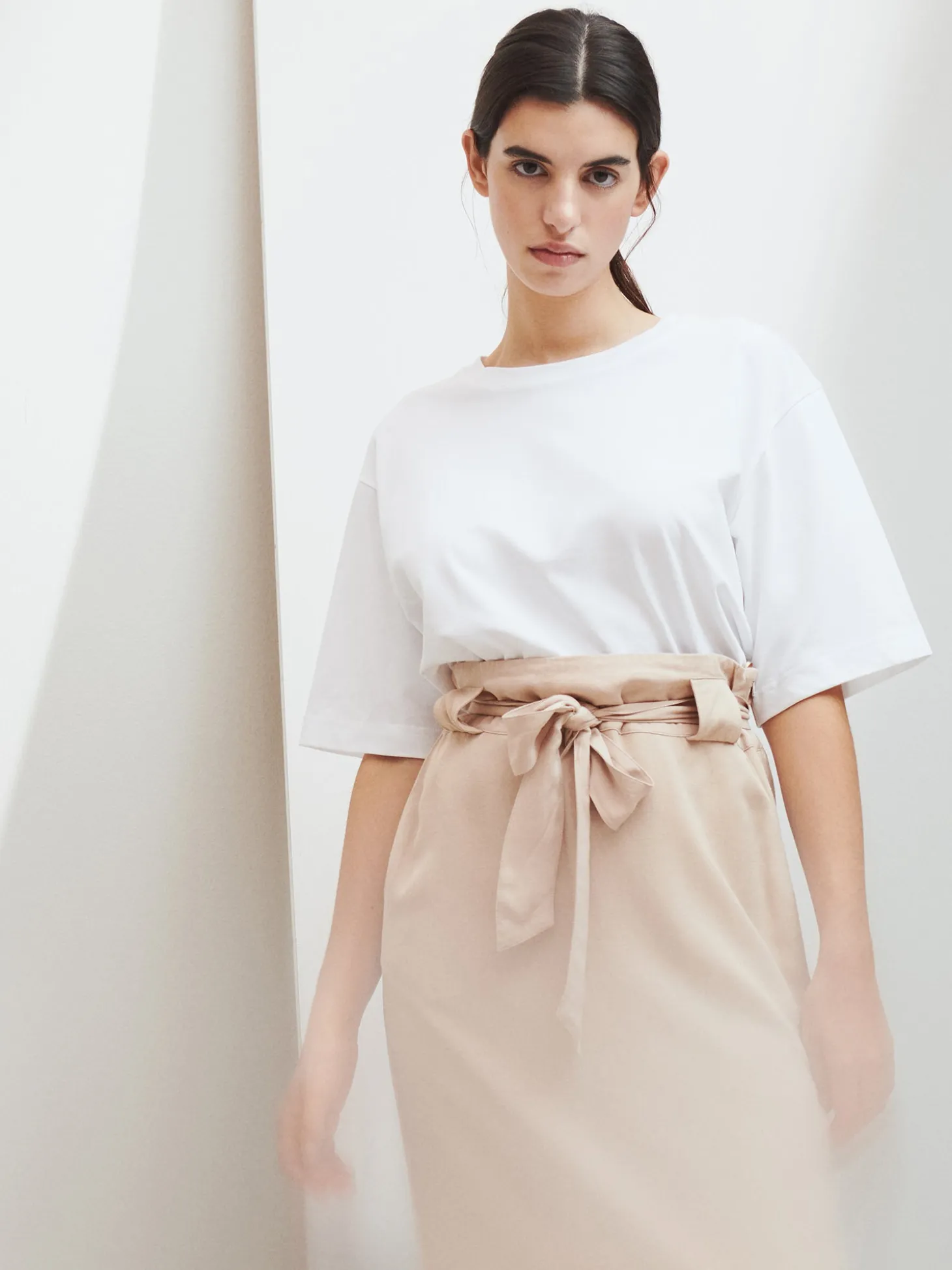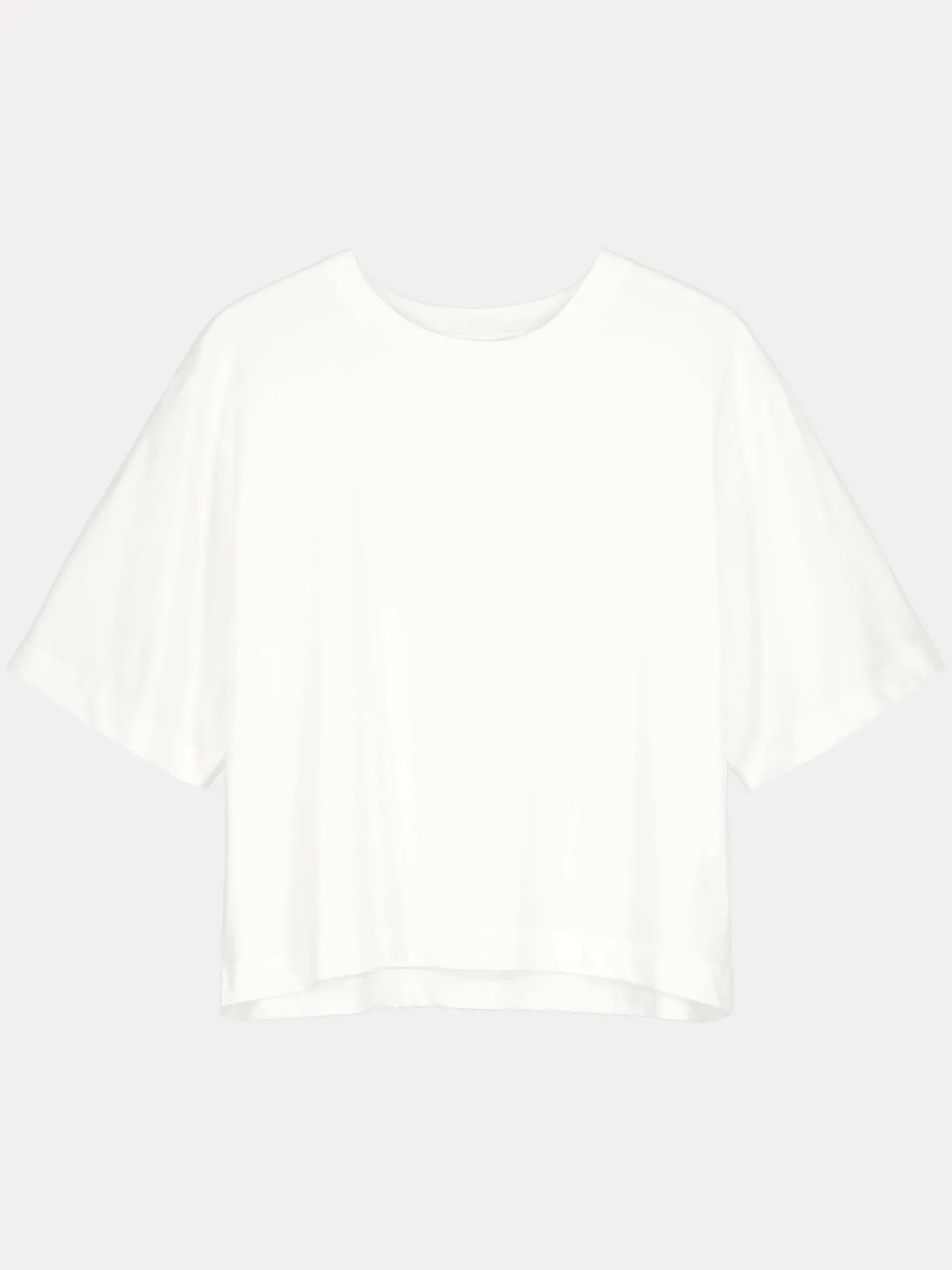 Naisten laadukas valkoinen Kroppi-t-paita. Klassinen t-paita sopii jokaiseen asuun ja siksi se on ajaton luottovaate. Laatikkomallisessa väljässä ja lyhyessä t-paidassa on pyöreä ribbi pääntie ja 2/4 pituiset väljät hihat. T-paidan pituus koossa M on noin 57 cm. Materiaali on 100% laadukasta luomupuuvillaa, joka pysyy hyvänä käytössä.