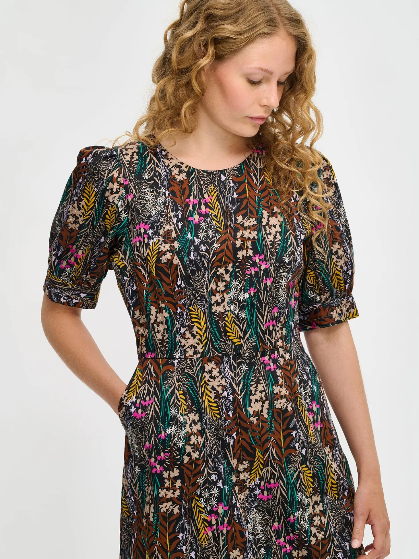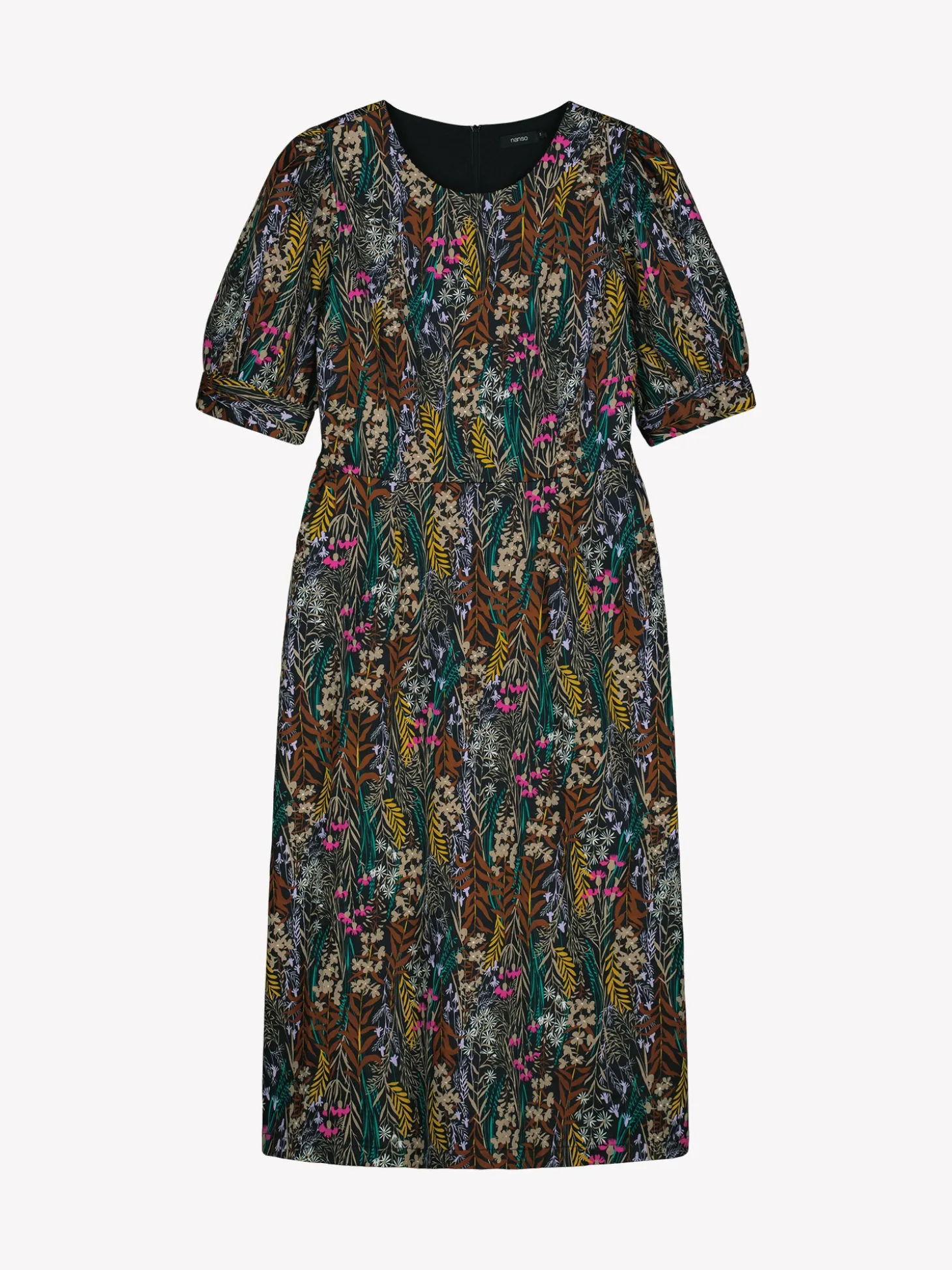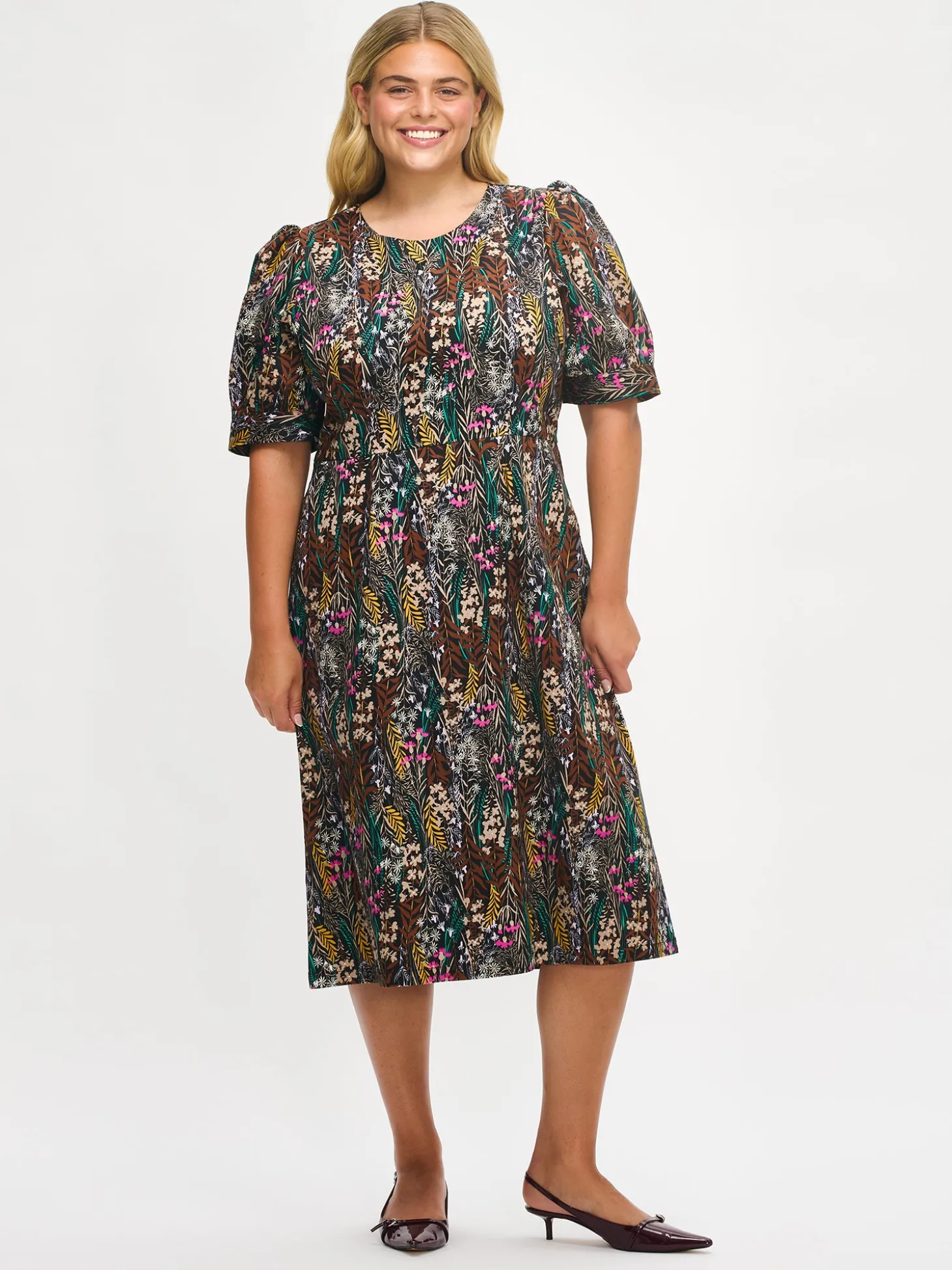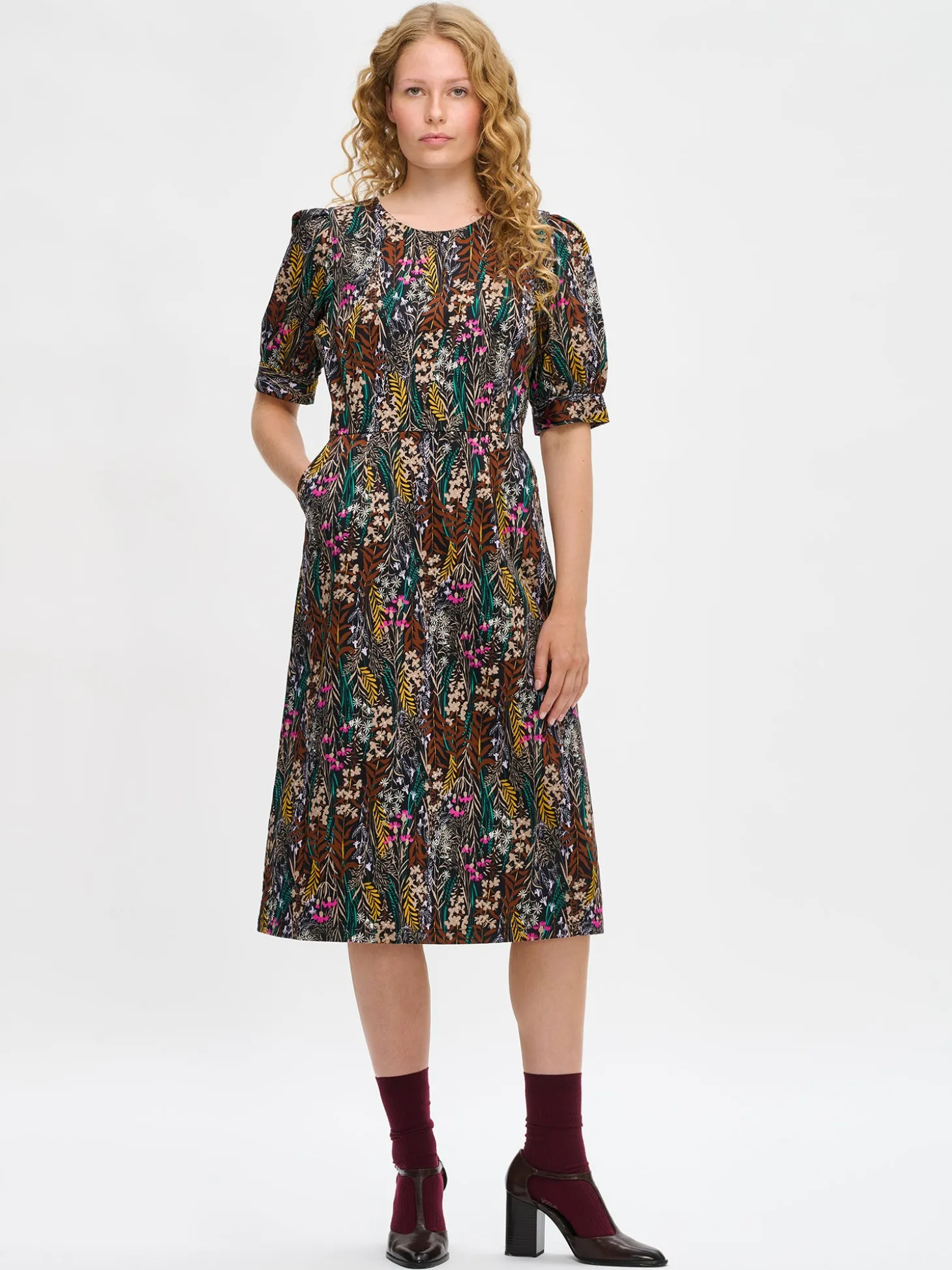 Naisten tyylikäs kuosillinen monivärinen Kuutamo-mekko. Mekossa on pyöreä pääntie, piilovetoketju selässä ja vuori. Mekossa on väljät ja muhkeat 2/4 pituiset hihat, jotka poimuttuvat kauniisti olalle sekä kalvosimen yläpuolelle. Hihansuissa on nappihalkiot. Mekon sivuissa on taskut, vyötäröllä leikkaussauma ja muotolaskokset sekä edessä että takana. Mekon pituus koossa 38 on noin 115 cm. Materiaali on mattapintaista kudottua puuvilla-satiinia, jossa mukana elastaania antamassa joustoa. Vuoren materiaali on laskeutuvaa polyester-kangasta.