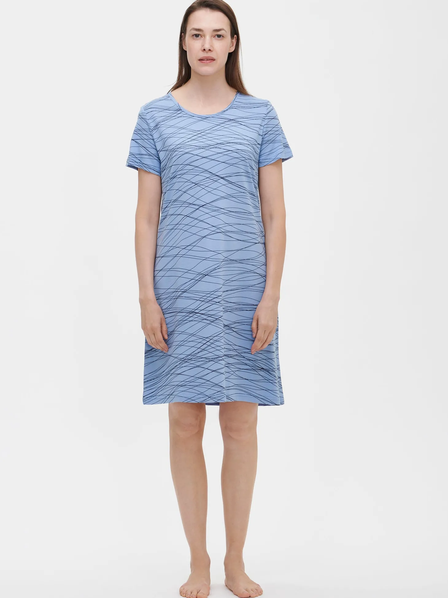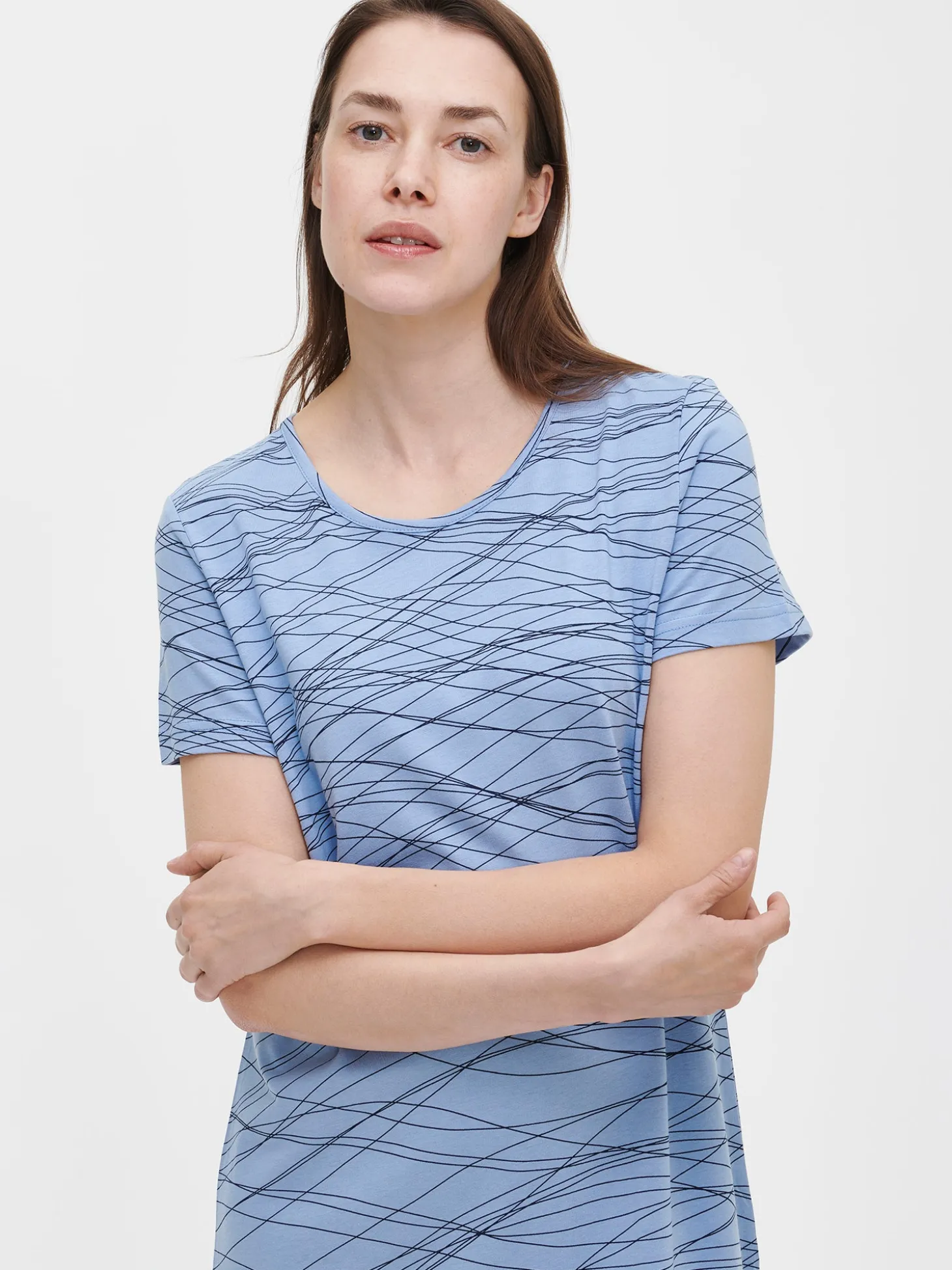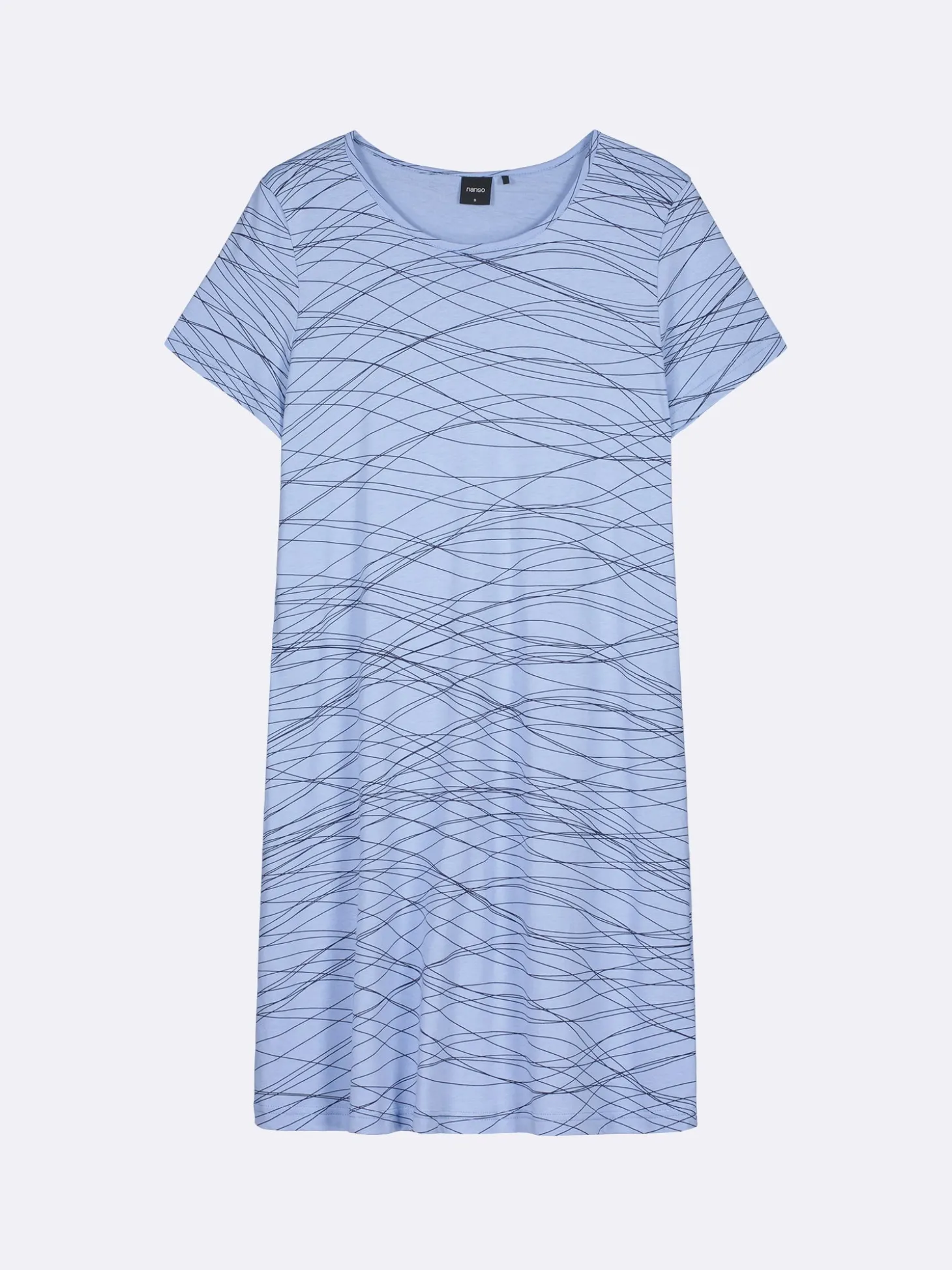 Naisten kuosillinen vaaleansininen Lanka-yöpaita lyhyillä hihoilla ja pyöreällä pääntiellä. Yöpaidan pituus koossa M on noin 95 cm. Materiaali on laadukasta, iholla miellyttävän pehmeältä tuntuvaa ja helppohoitoista puuvilla-modaalia, joka pysyy hyvänä pesusta toiseen.