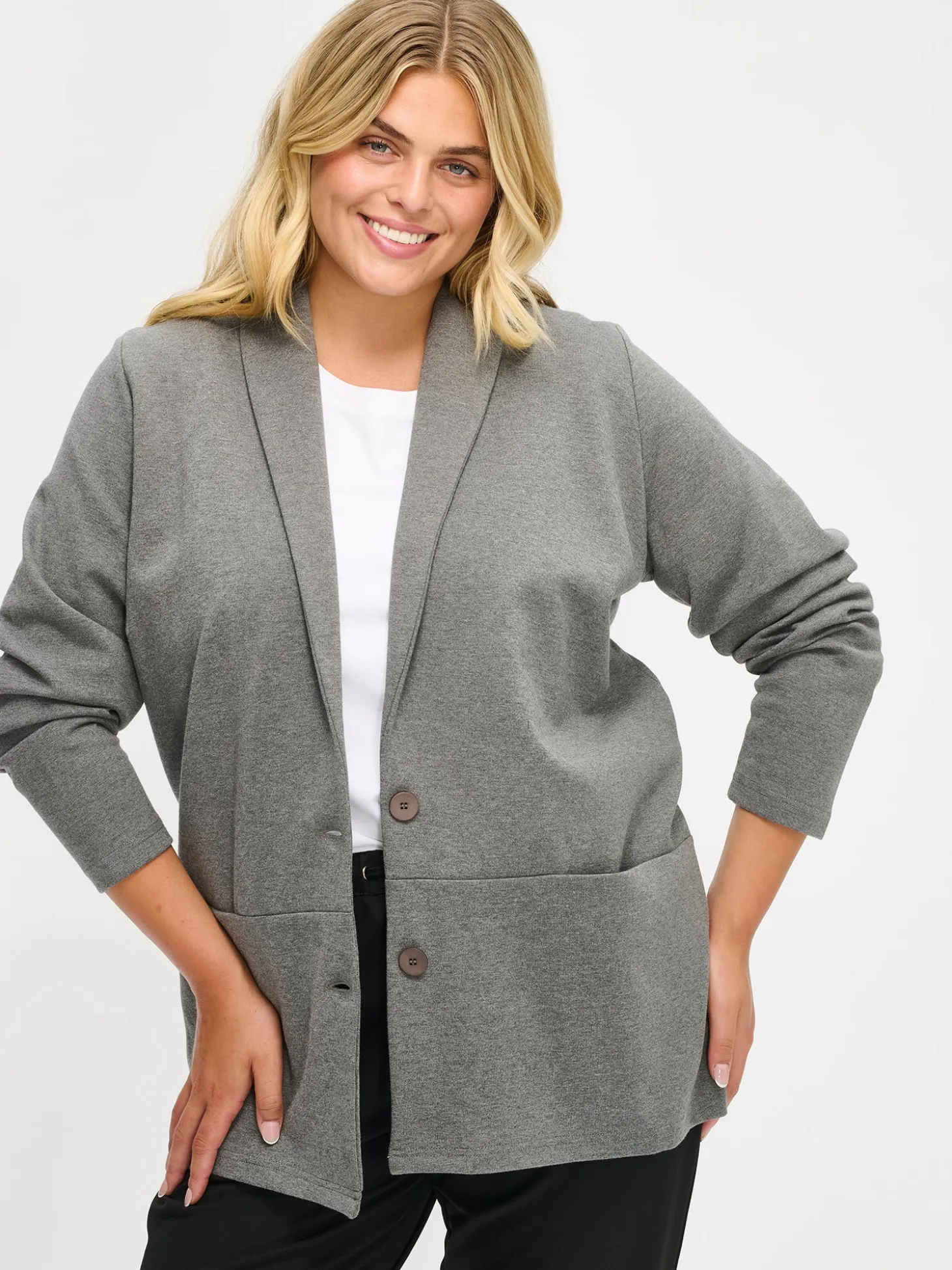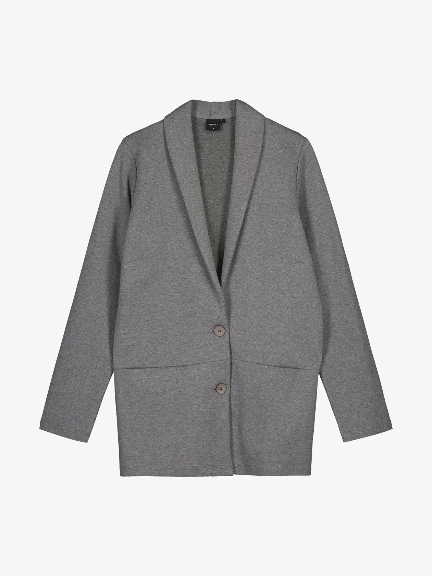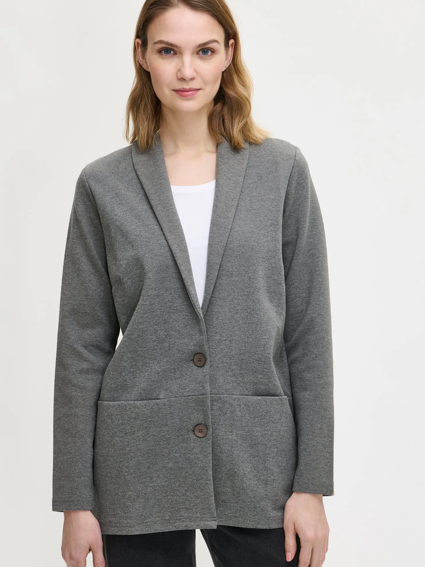 Naisten tyylikäs harmaa Leija-jakku. Ajaton musta jakku on helppo yhdistää eriväristen hameiden, housujen tai mekkojen pariksi. Jakussa on kaulus, edessä nappikiinnitys ja rintamuotolaskokset. Hihat ovat täyspitkät. Edessä olevaan poikkisaumaan on upotettu taskut. Jakun pituus koossa M on noin 73 cm. Materiaali on miellyttävän tuntuista, paksumpaa interlock-neulosta.