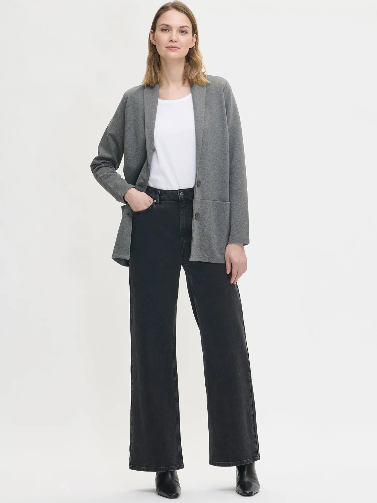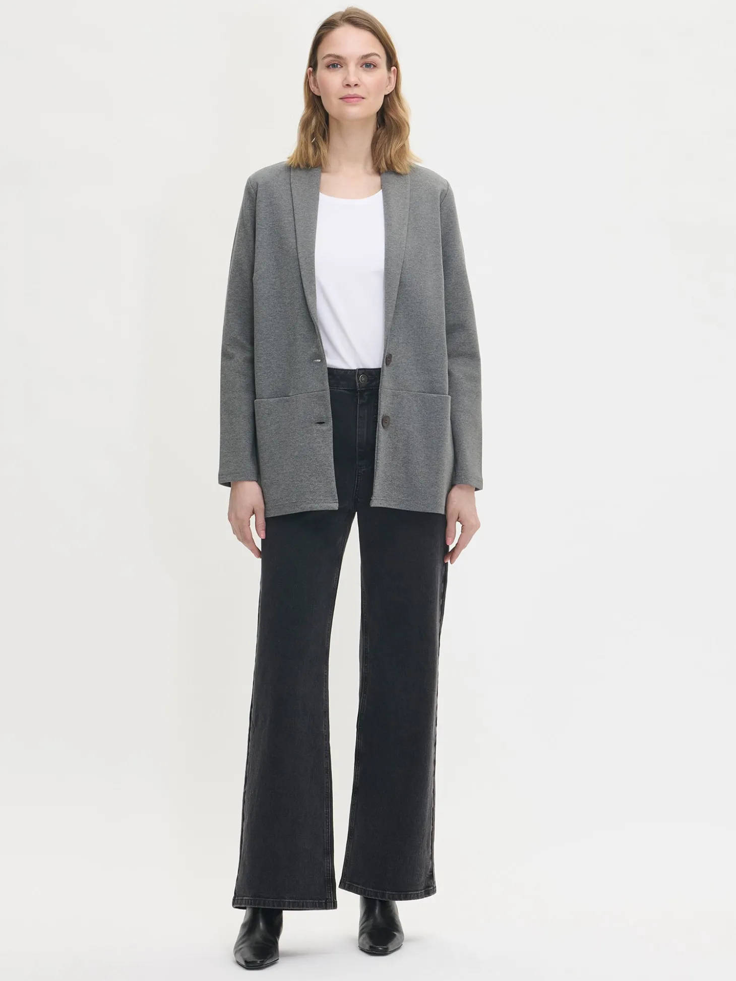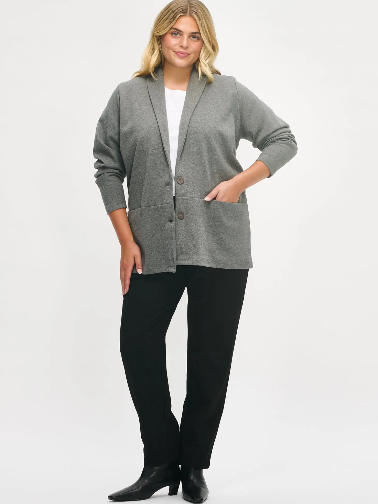 Naisten tyylikäs harmaa Leija-jakku. Ajaton musta jakku on helppo yhdistää eriväristen hameiden, housujen tai mekkojen pariksi. Jakussa on kaulus, edessä nappikiinnitys ja rintamuotolaskokset. Hihat ovat täyspitkät. Edessä olevaan poikkisaumaan on upotettu taskut. Jakun pituus koossa M on noin 73 cm. Materiaali on miellyttävän tuntuista, paksumpaa interlock-neulosta.