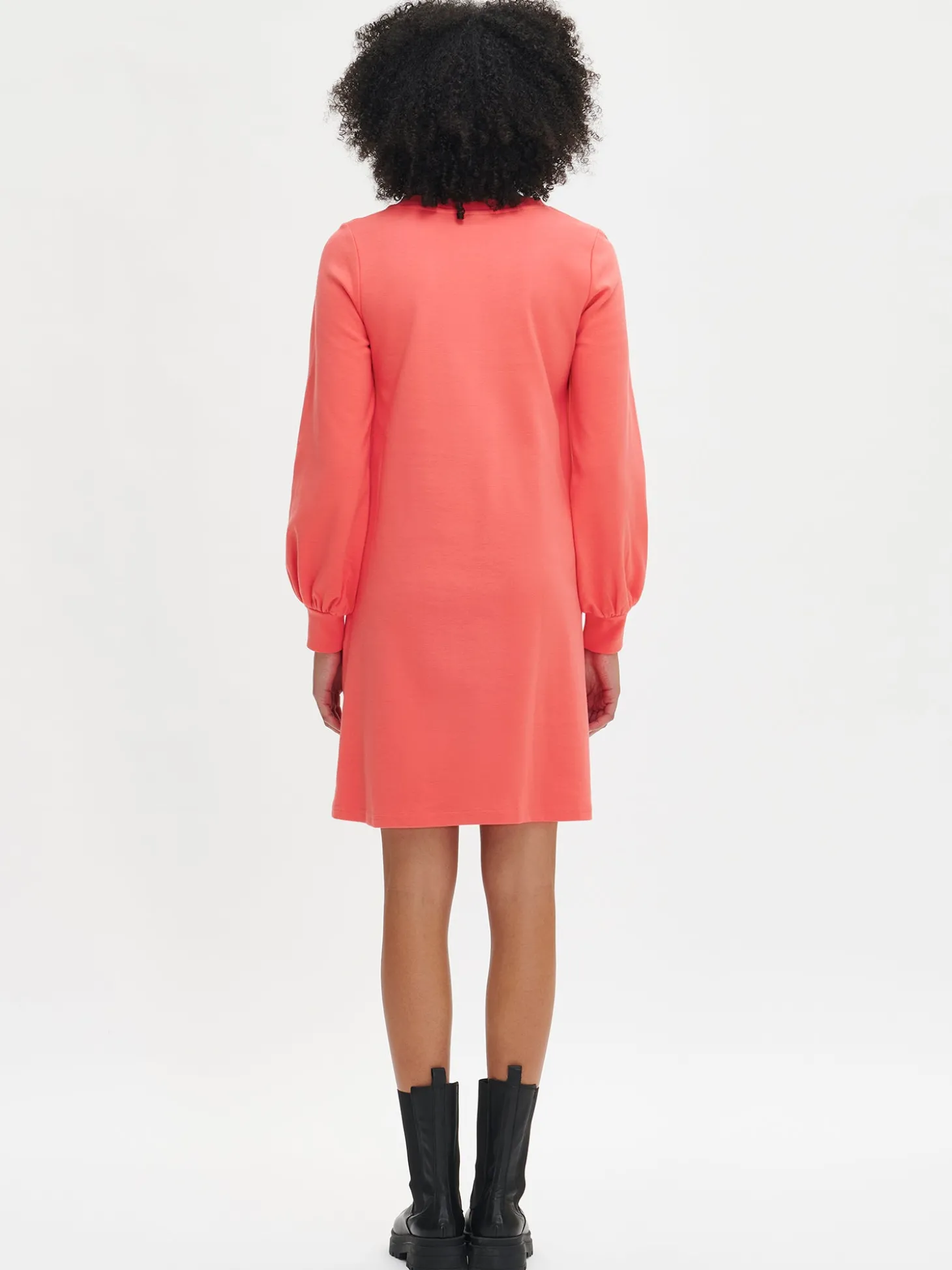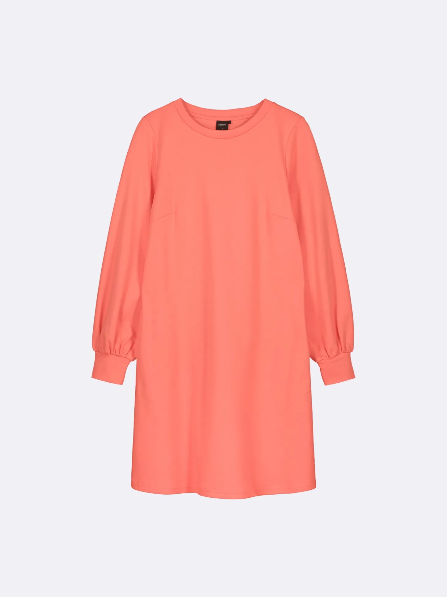 Naisten rento pitkähihainen punainen Leija-mekko. A-linjaisessa mekossa on pyöreä pääntie, sivuissa taskut ja kauniisti hihansuihin poimuttuvat täyspitkät hihat. Mekon pituus koossa M on noin 95 cm. Materiaali on miellyttävän tuntuista, paksumpaa interlock-neulosta.