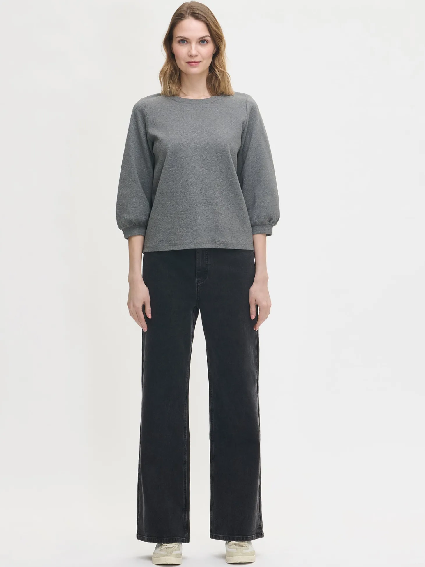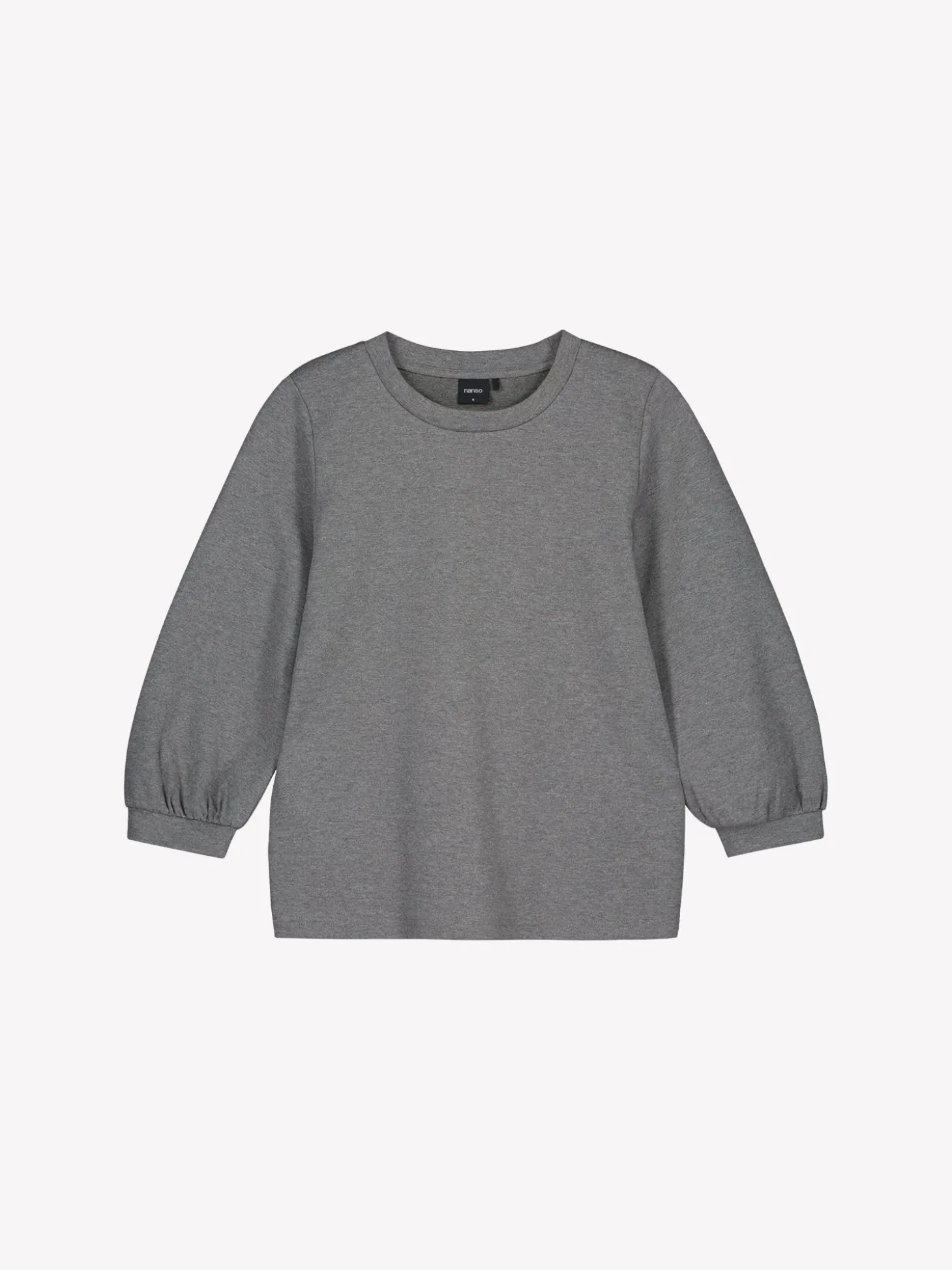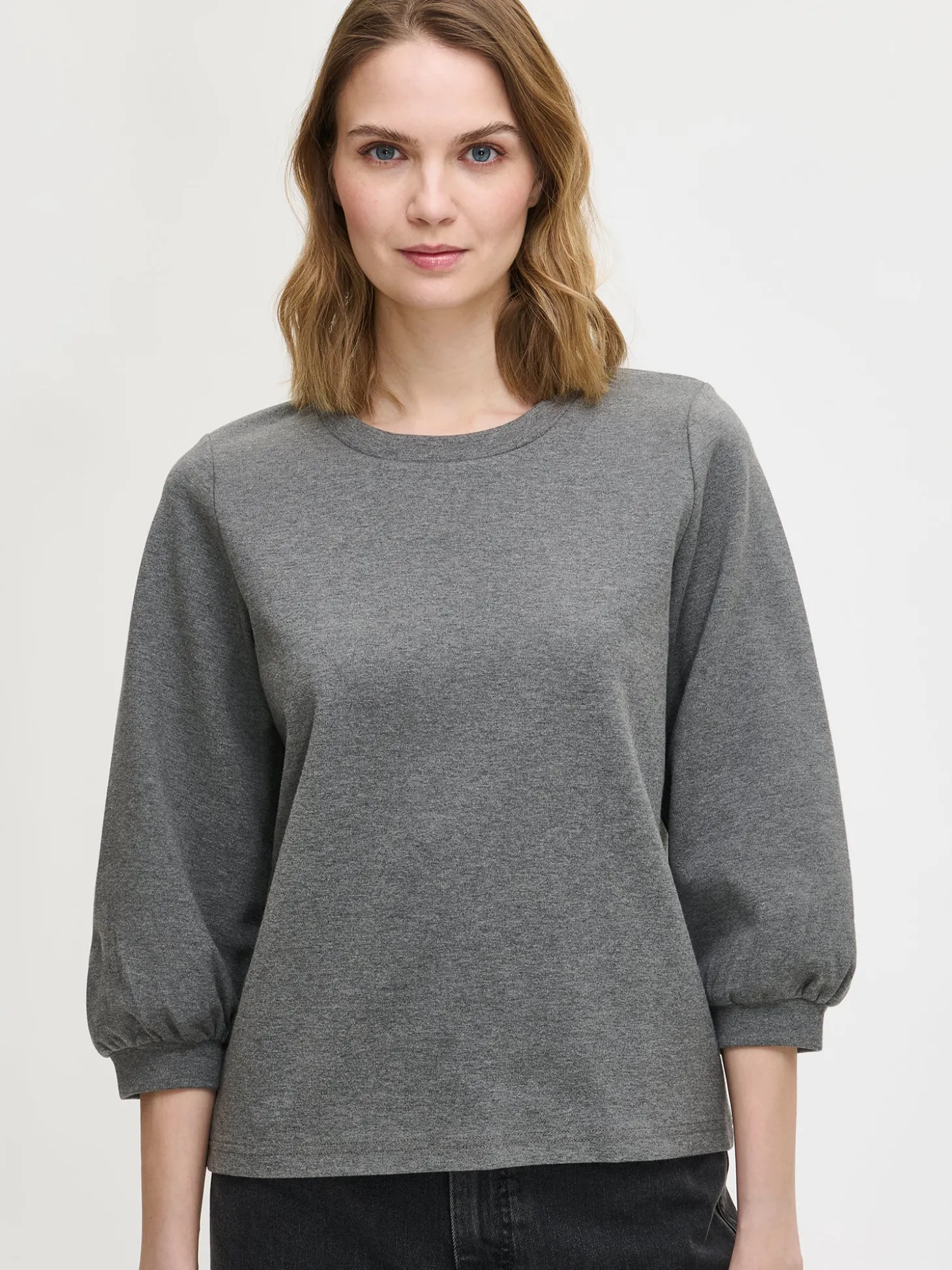 Naisten harmaa Leija-pusero. Puserossa on pyöreä pääntie ja suora helma. Hihansuissa on kaksinkertainen kaitale, jonka yläpuolelle poimuttuu 3/4 pituiset hihat. Puseron pituus koossa M on noin 62 cm. Materiaali on miellyttävän tuntuista, paksumpaa interlock-neulosta.