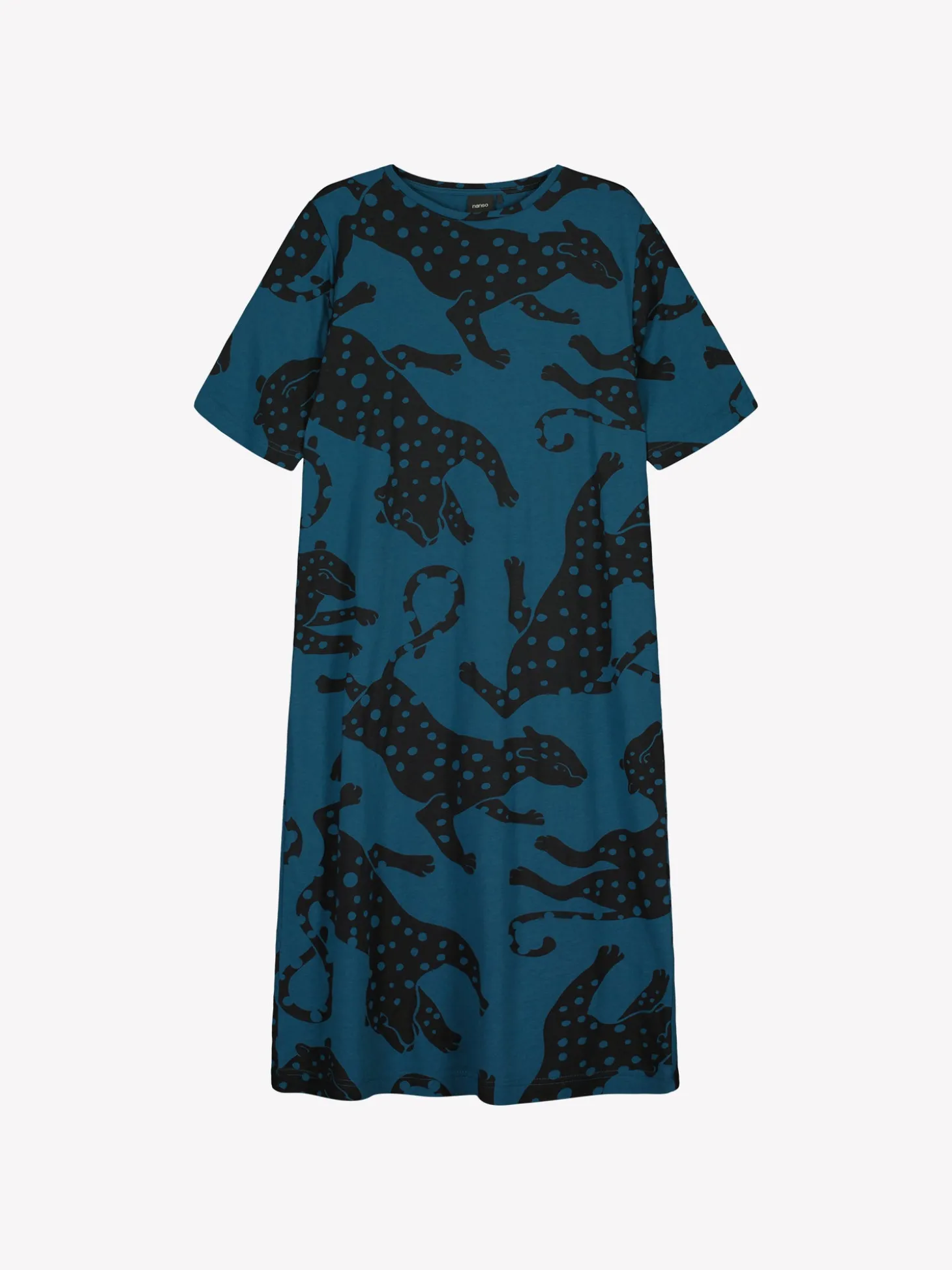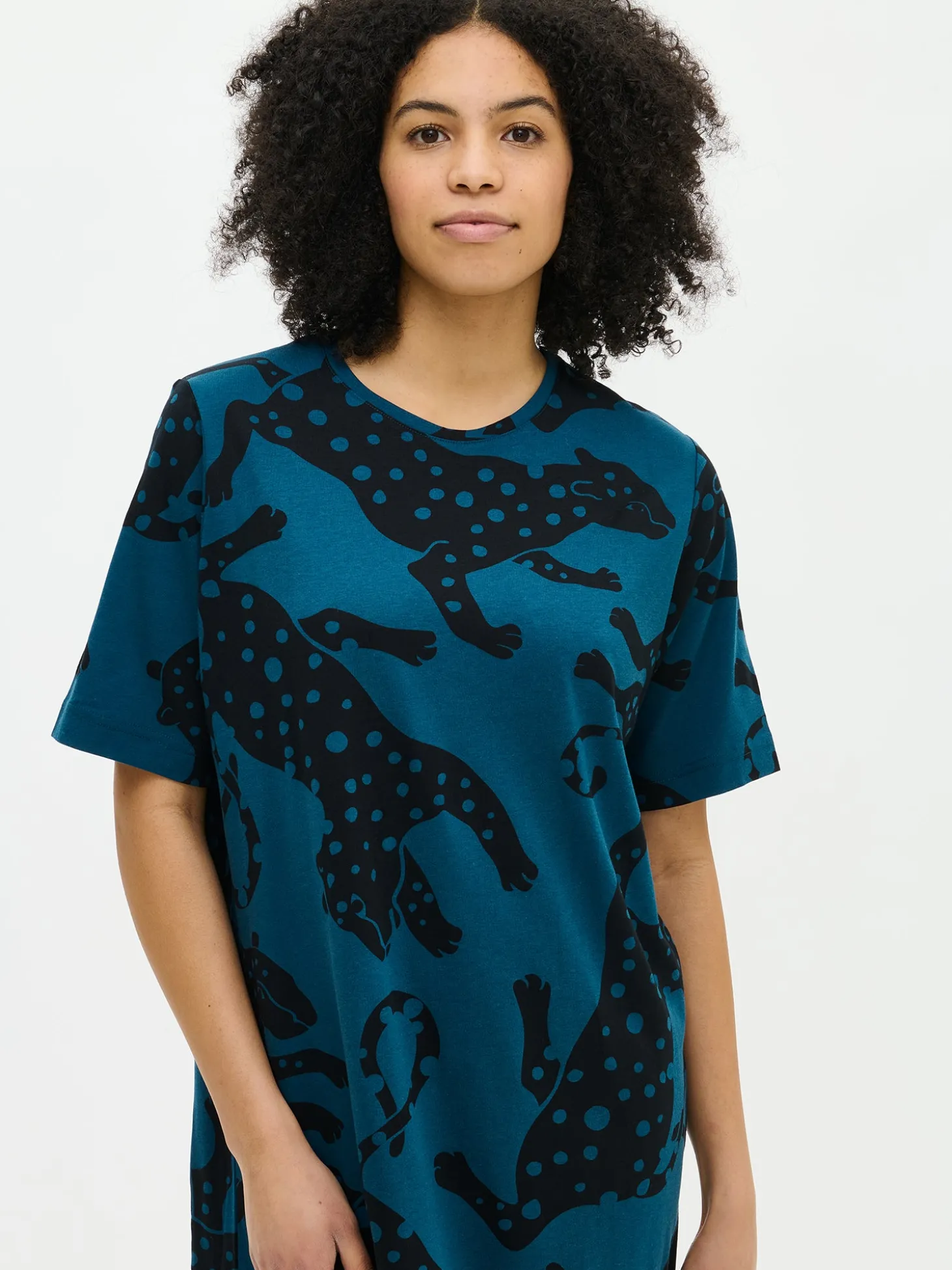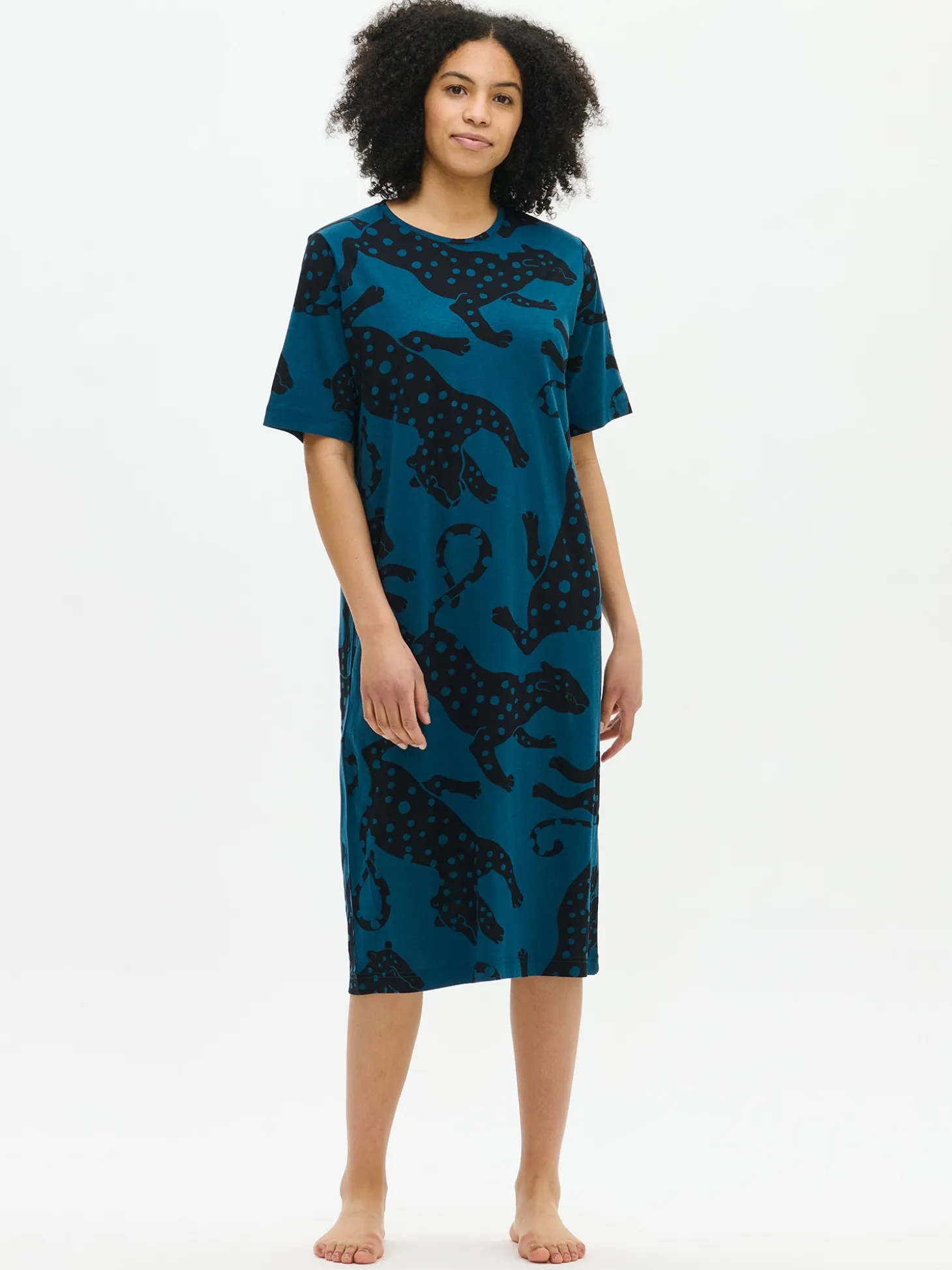 Naisten kuosillinen sininen suoralinjainen Leonora-yöpaita puoli pitkillä hihoilla ja pyöreällä pääntiellä. Yöpaidan pituus koossa M on noin 115 cm. Materiaali on laadukasta, iholla miellyttävän pehmeältä tuntuvaa ja helppohoitoista puuvilla-modaalia, joka pysyy hyvänä pesusta toiseen. Ilmeikäs Leonora-kuosi ja mukavan rento malli tekevät tästä yöpaidasta täydellisen valinnan arjen rauhallisiin hetkiin.