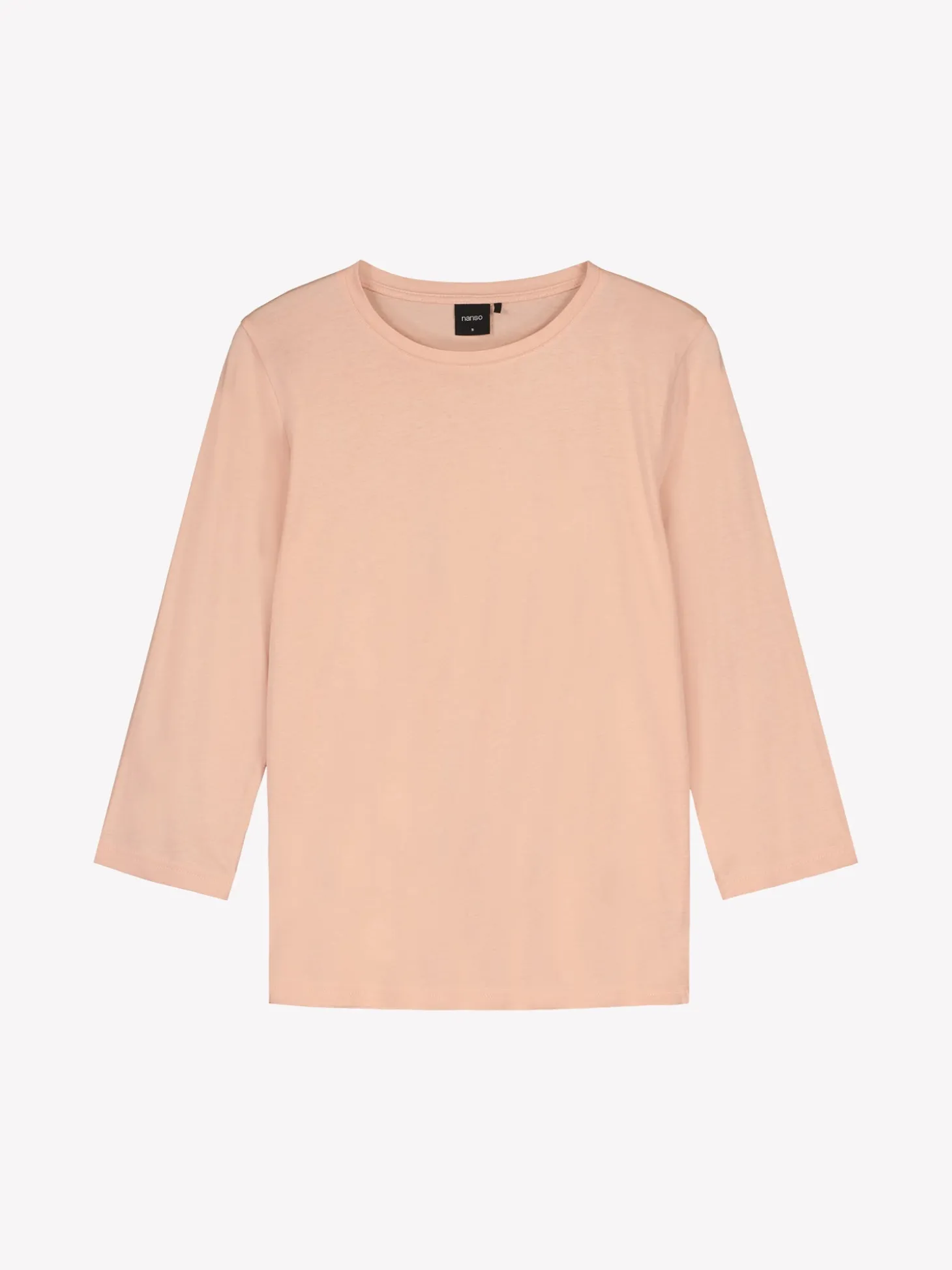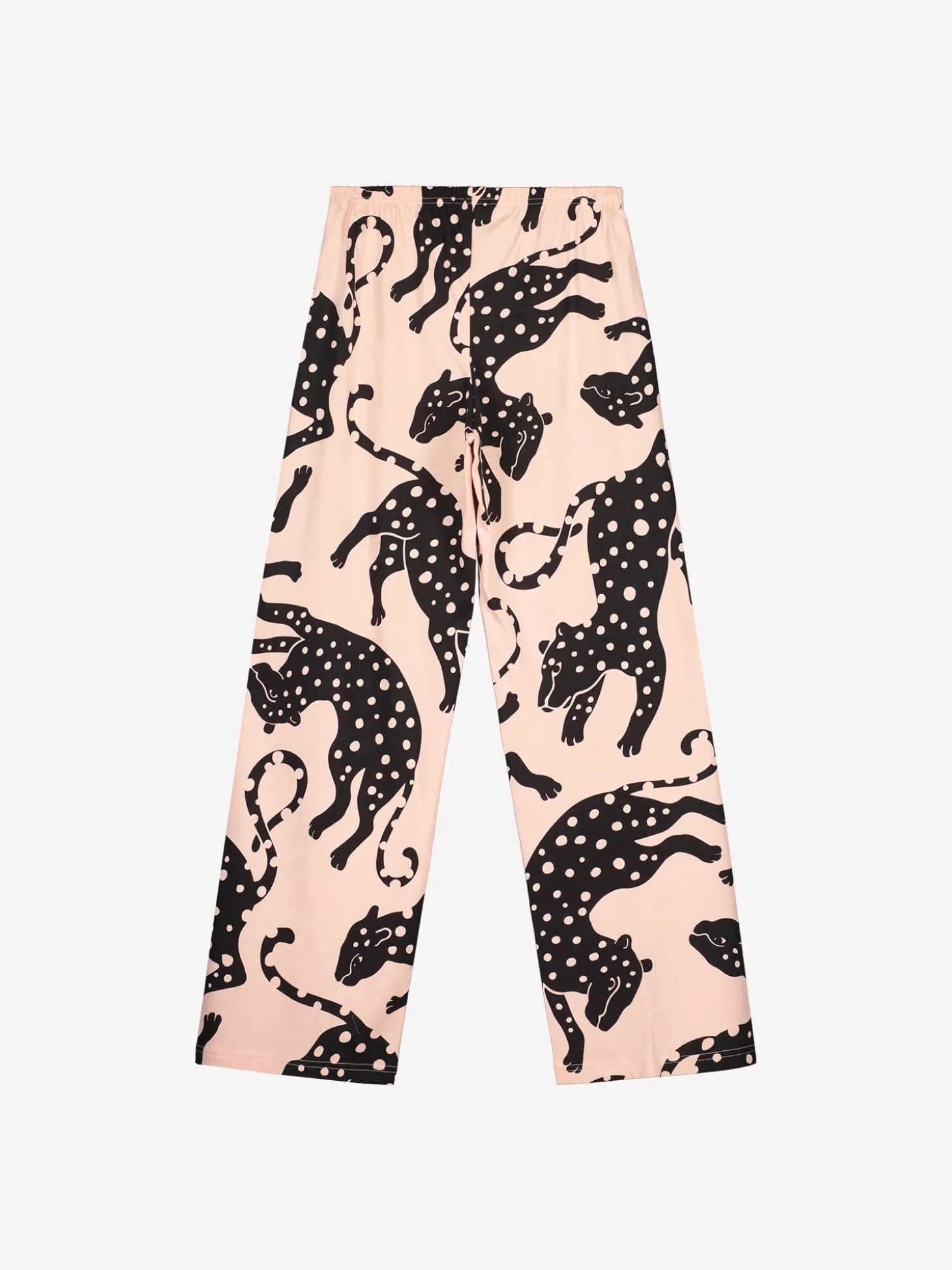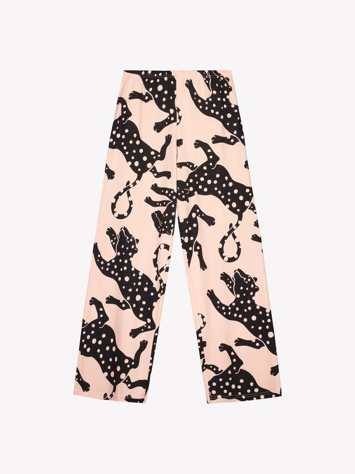 Naisten vaaleanpunainen Leonora-pyjama. Yksivärisessä puserossa on pyöreä pääntie ja 3/4 pituiset hihat. Puseron pituus koossa M on noin 65 cm. Kuosilliset housut ovat 7/8 pituiset. Materiaali on laadukasta, iholla miellyttävän pehmeältä tuntuvaa ja helppohoitoista puuvilla-modaalia, joka pysyy hyvänä pesusta toiseen. Rento malli ja näyttävä Leonora-kuosi tekevät tästä pyjamasta arjen luottotuotteen – sekä uneen että oleskeluun.