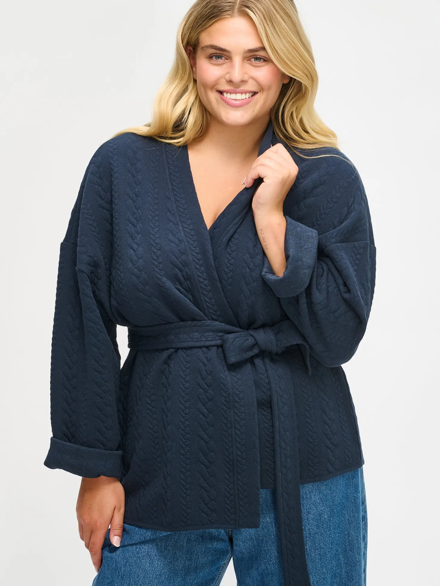Naisten mukava tummansininen Letti-jakku irtovyöllä. Suoralinjaisen jakun etureuna on huoliteltu leveällä kaitaleella, joka nousee niskassa kaulukseksi. Hihat ovat täyspitkät. Jakun pituus koossa M on noin 69 cm. Ryhdikäs palmikkomaisesti pintakuvioitu materiaali on miellyttävää puuvilla-elastaanineulosta. Materiaalille on ominaista 3-5 % kutistuminen ensimmäisessä pesussa.