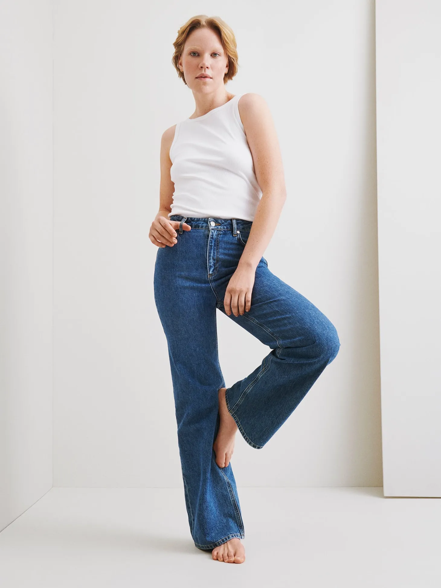 Naisten trendikkäät siniset Levee-farkut korkealla vyötäröllä. Leveälahkeisissa farkuissa on vyötärökaitale, edessä vetoketju ja nappikiinnitys. Farkuissa on taskut edessä ja takana. Farkkujen lahkeet ovat levenevät. Lahkeen sisäpituus koossa 38 on noin 79 cm. Materiaali on kudottua twillsidoksista puuvilla-denimkangasta. 20% kankaaseen käytetystä puuvillasta on kierrätettyä.